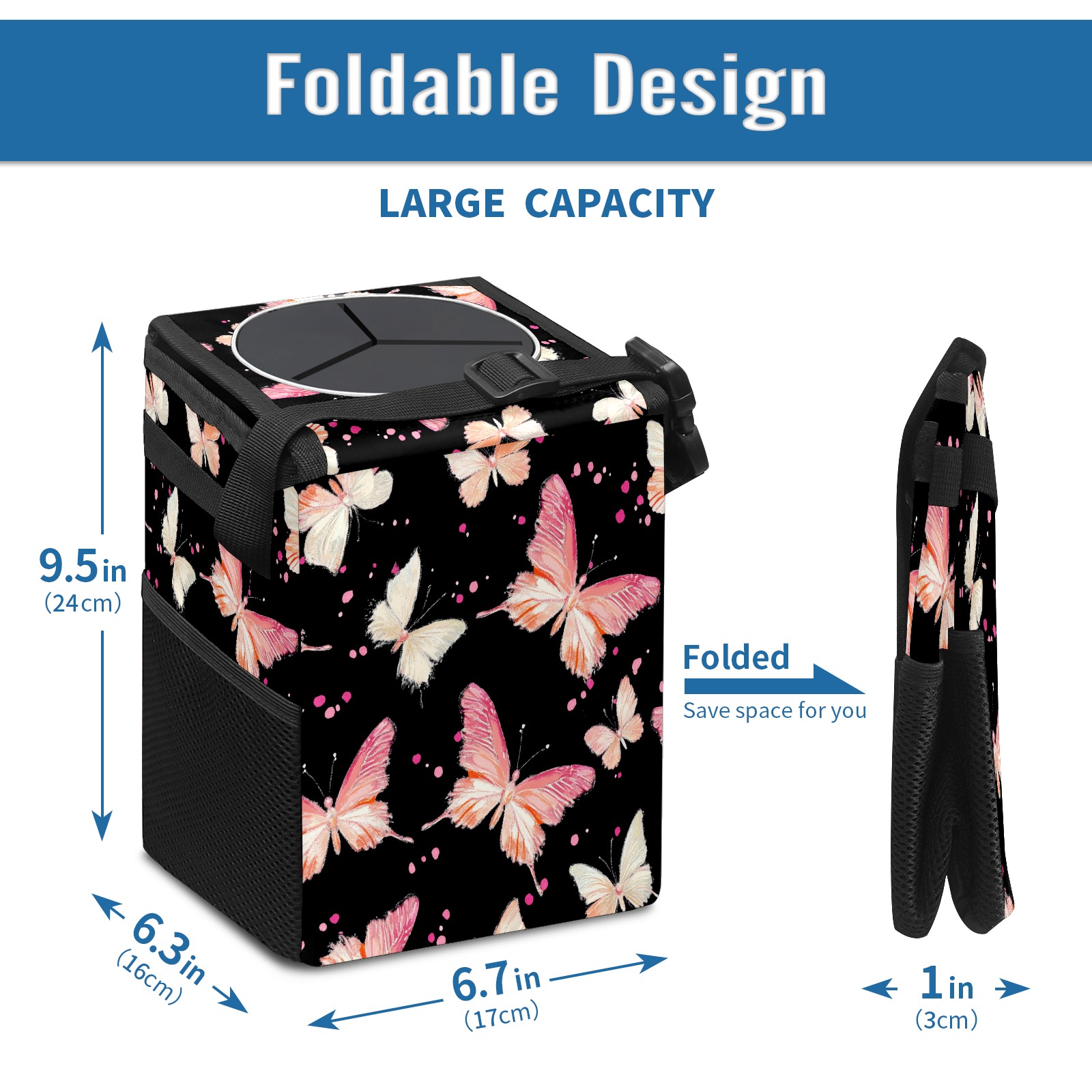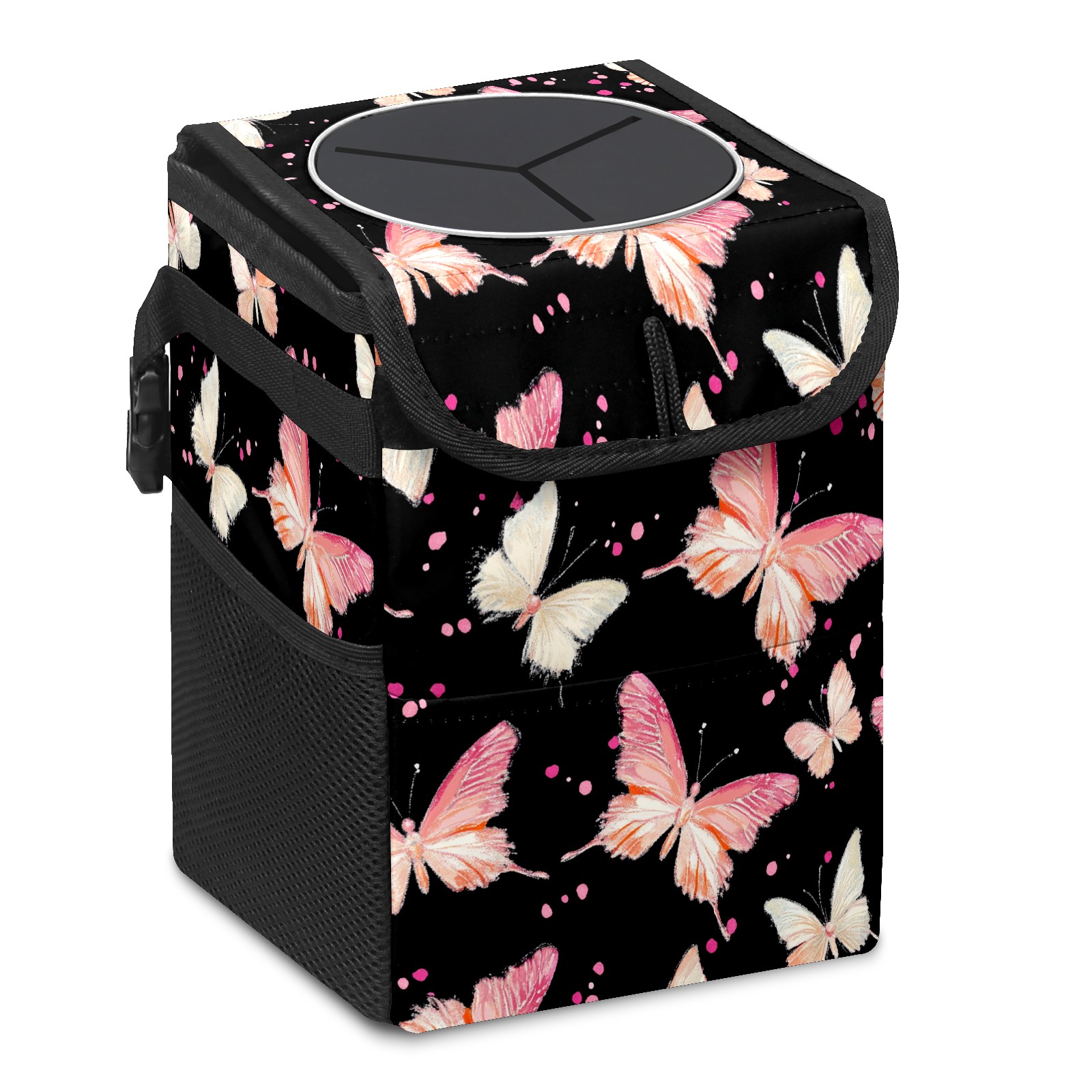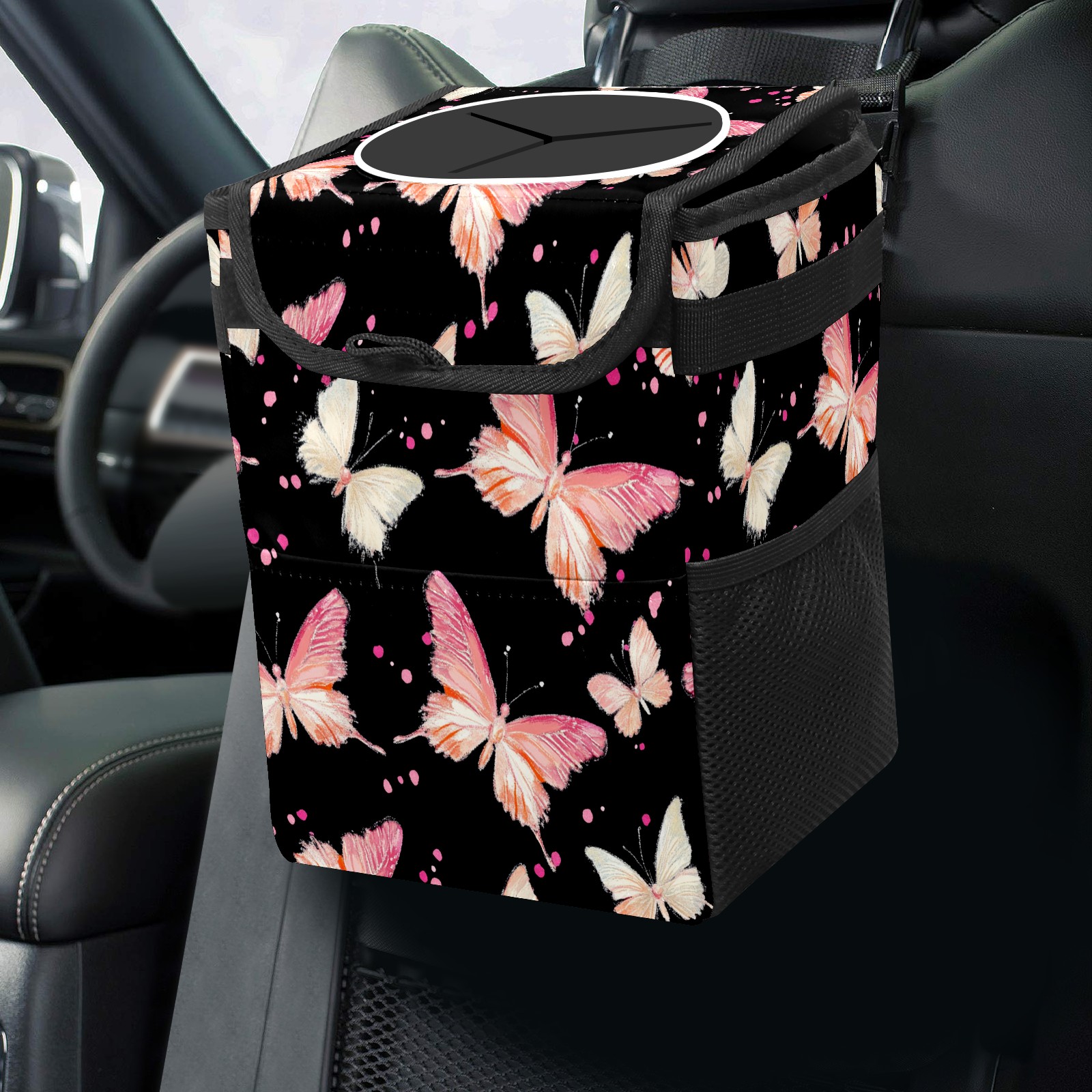 Car Trash Can with Lid, Small Portable Hanging Automotive Garbage Bin for Vehicles, Leakproof Waste Bag Container for SUV Truck Van Interior Auto Travel Road Trips(Pink And White Butterflies)