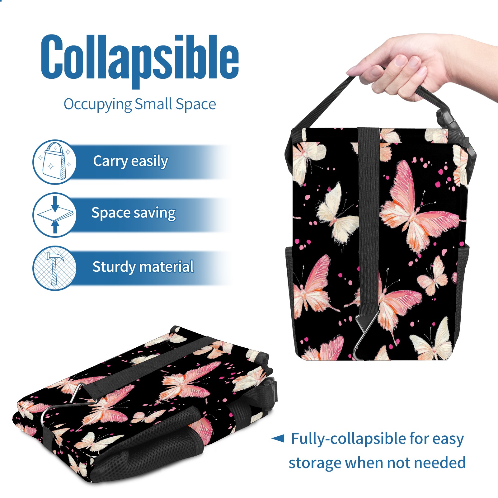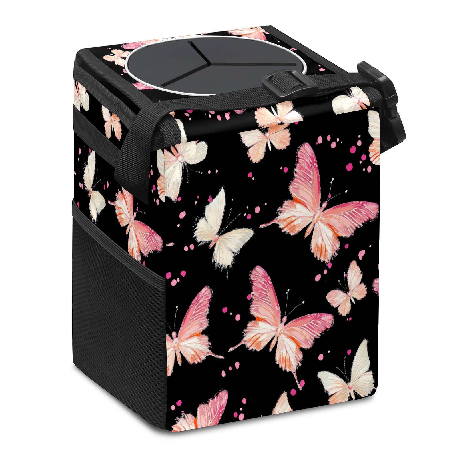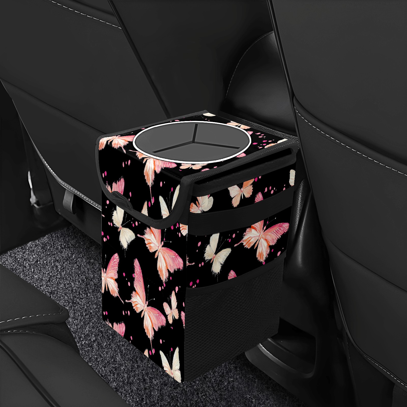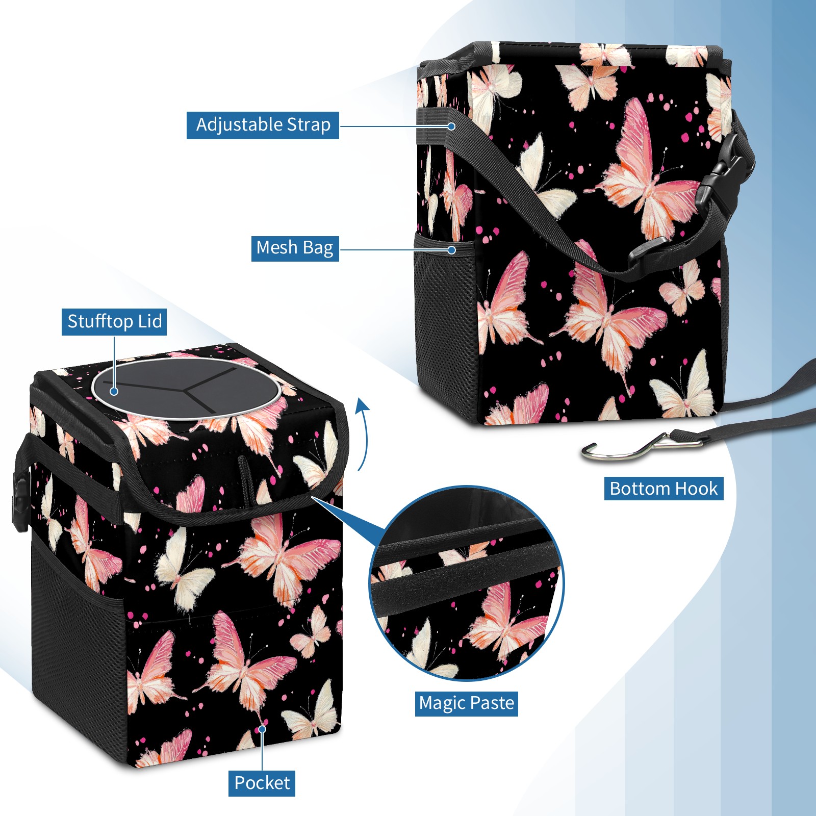 Car Trash Can with Lid, Small Portable Hanging Automotive Garbage Bin for Vehicles, Leakproof Waste Bag Container for SUV Truck Van Interior Auto Travel Road Trips(Pink And White Butterflies)
