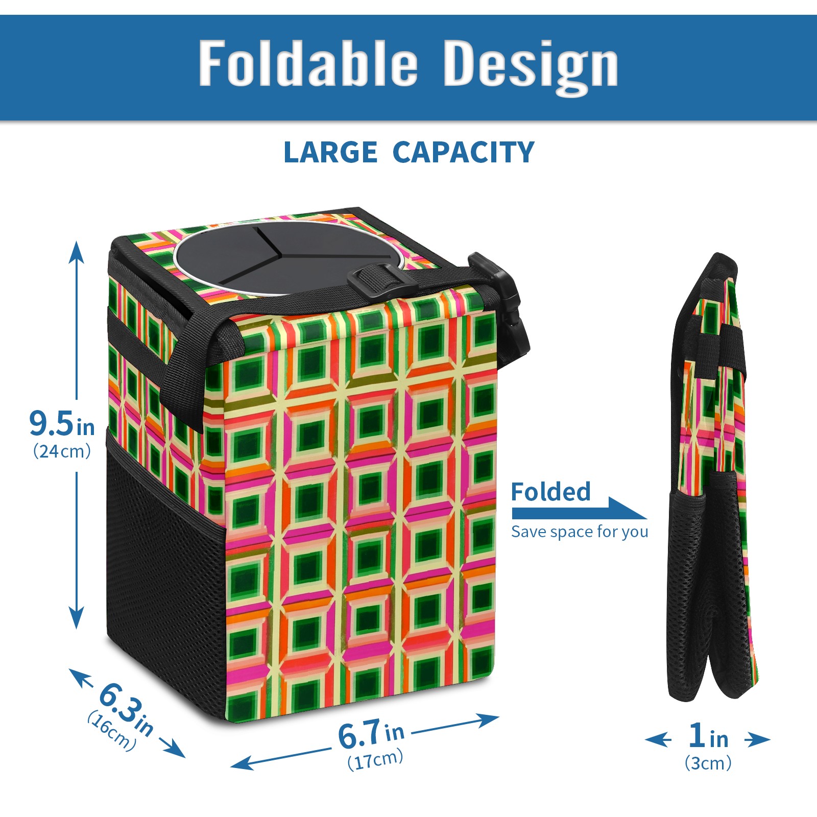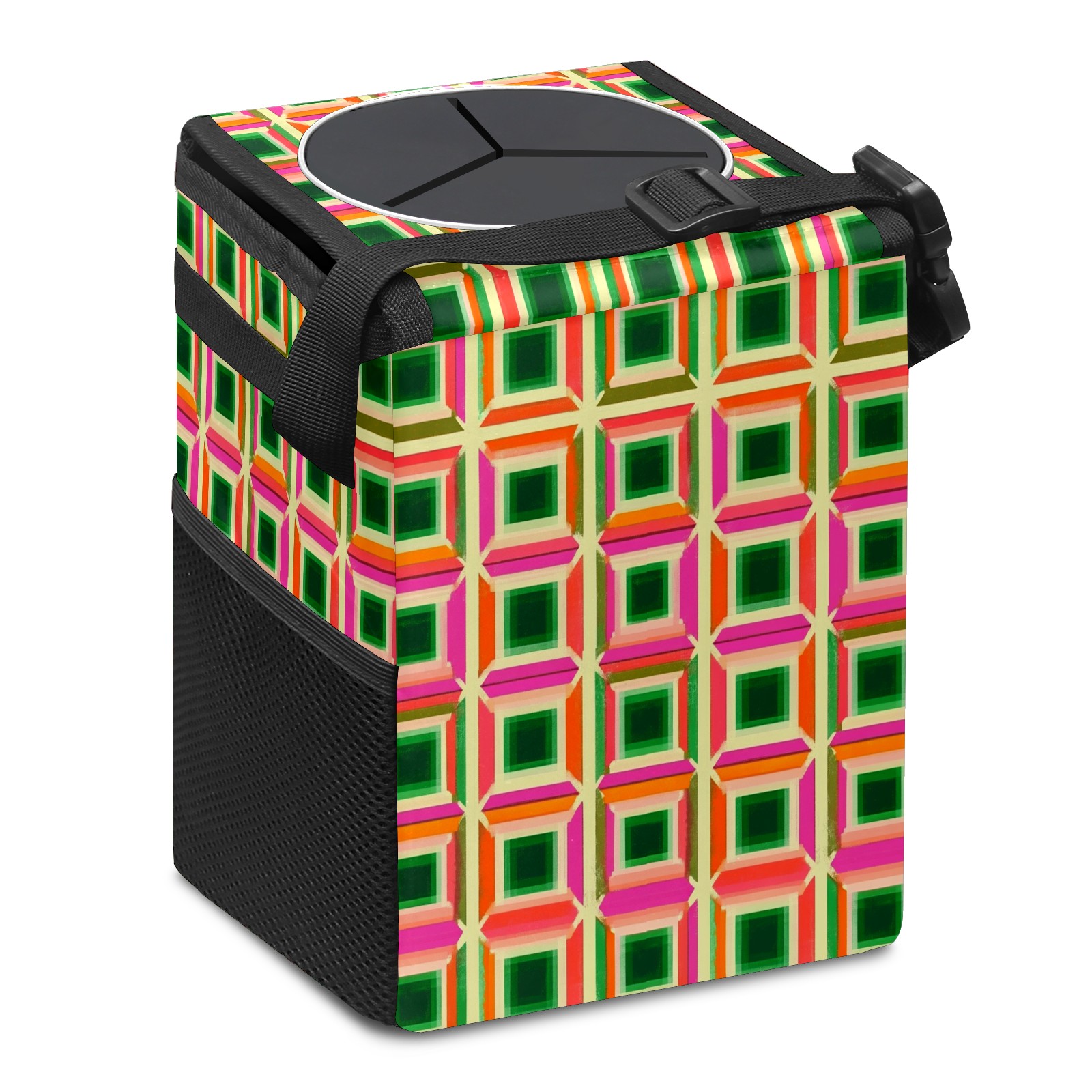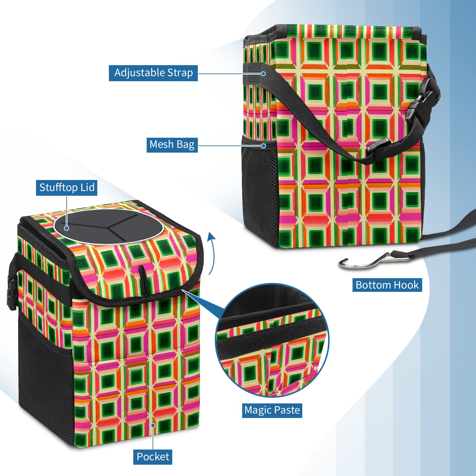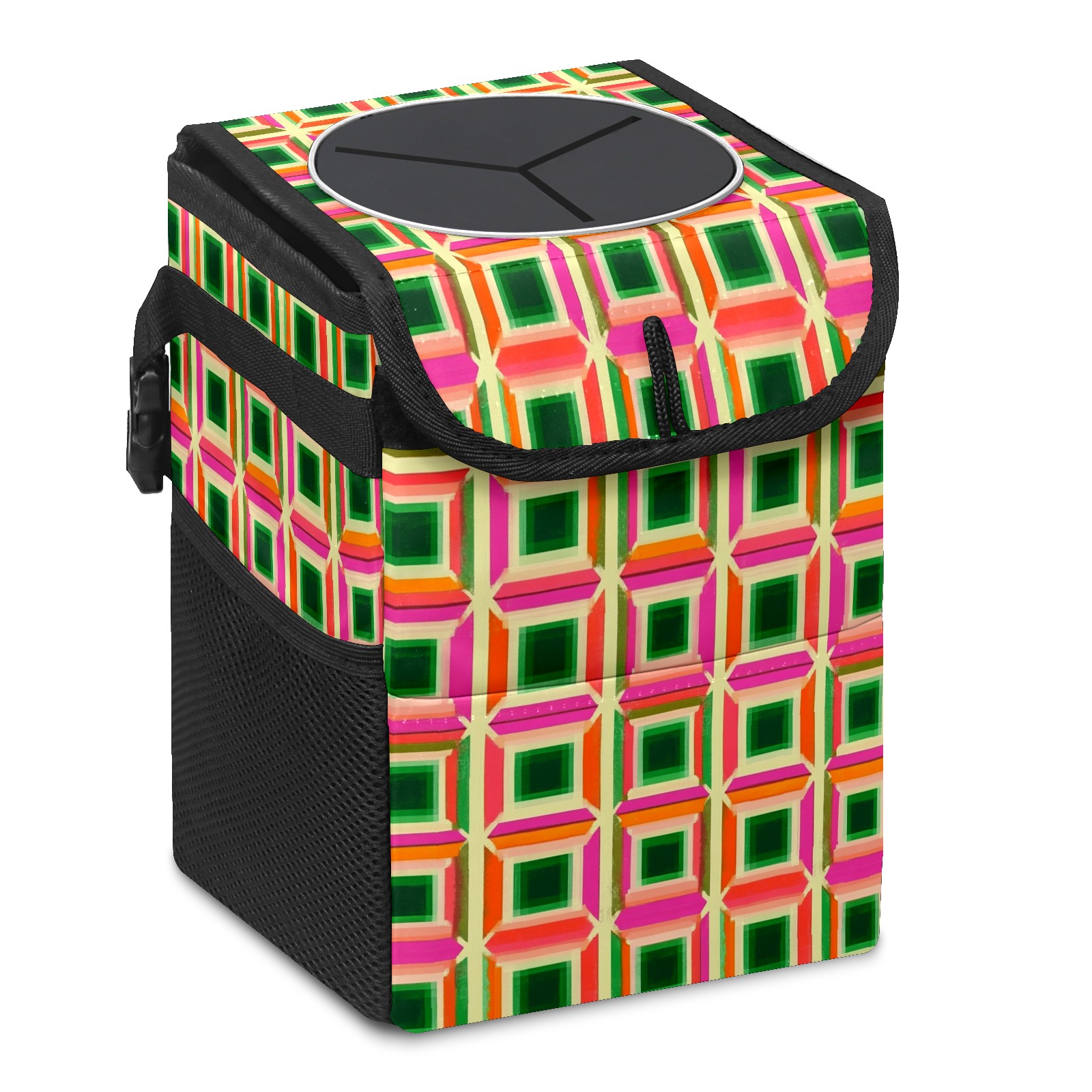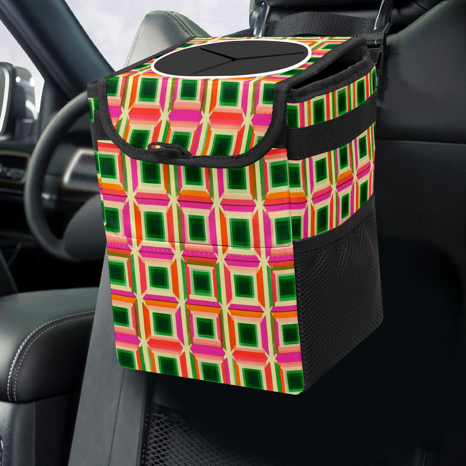 Car Trash Can with Lid, Small Portable Hanging Automotive Garbage Bin for Vehicles, Leakproof Waste Bag Container for SUV Truck Van Interior Auto Travel Road Trips(Green Pink And Orange Squares)