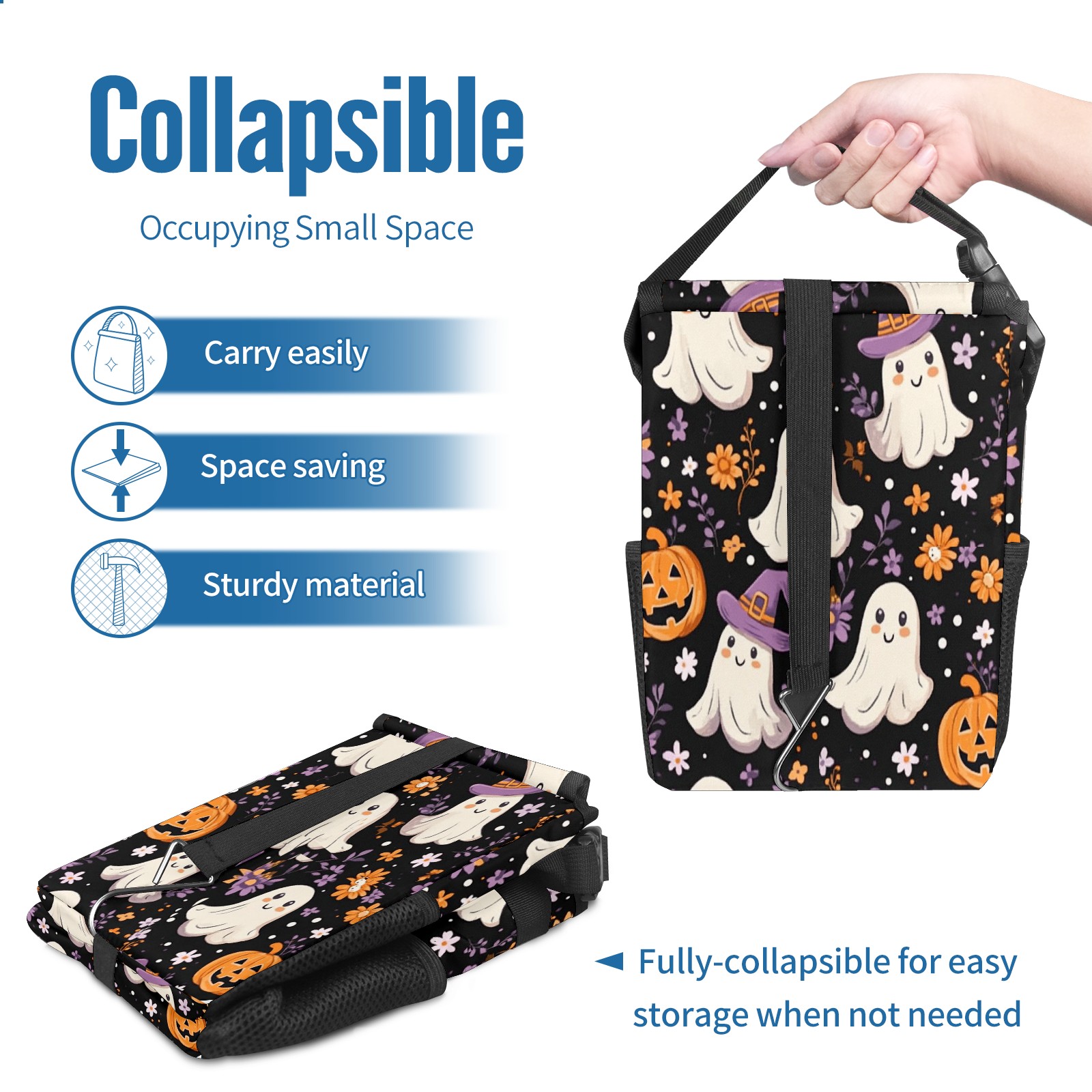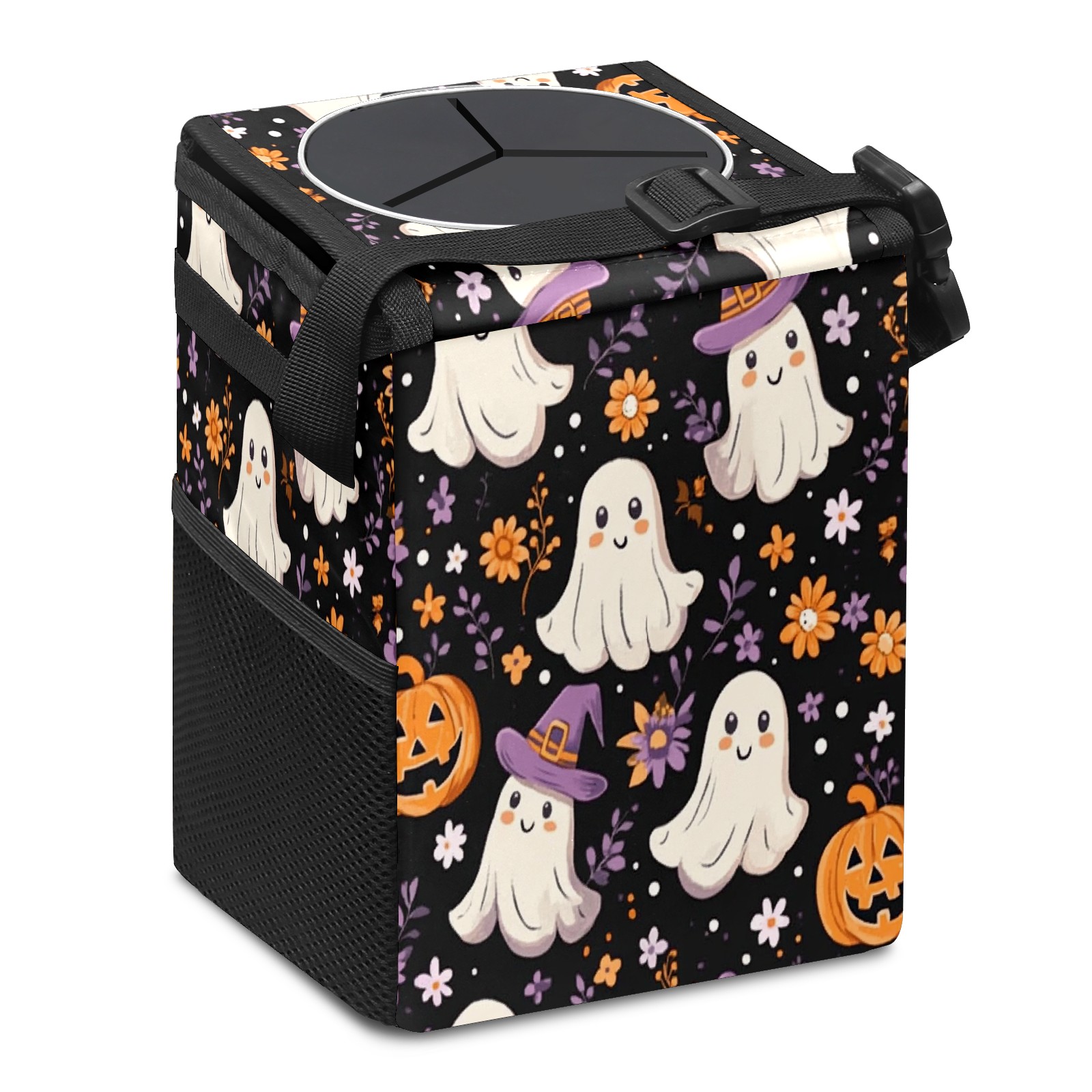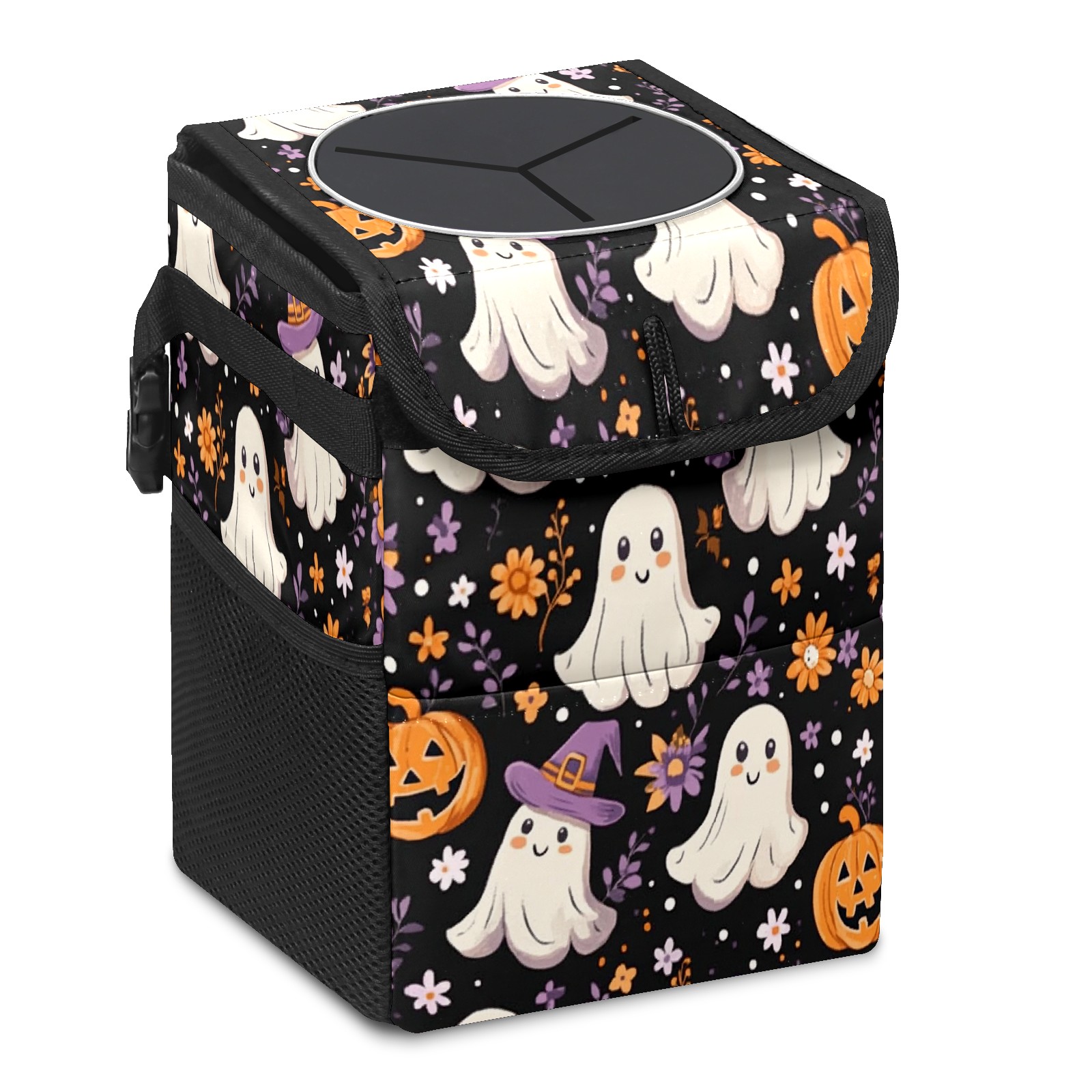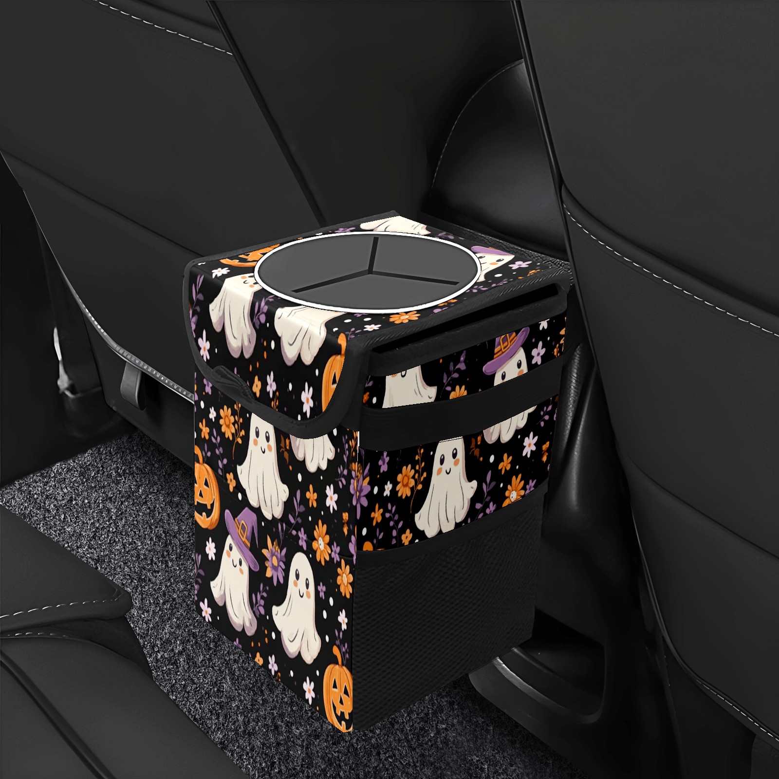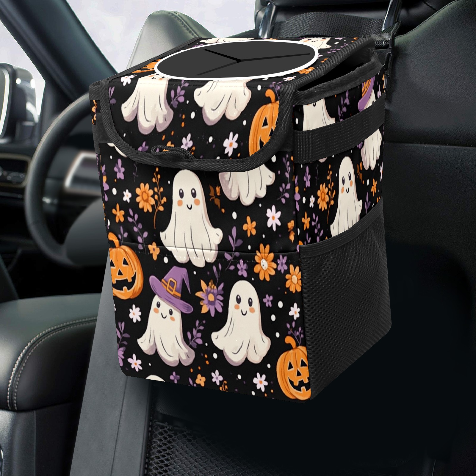 Car Trash Can with Lid, Small Portable Hanging Automotive Garbage Bin for Vehicles, Leakproof Waste Bag Container for SUV Truck Van Interior Auto Travel Road Trips(Ghosts And Pumpkins)