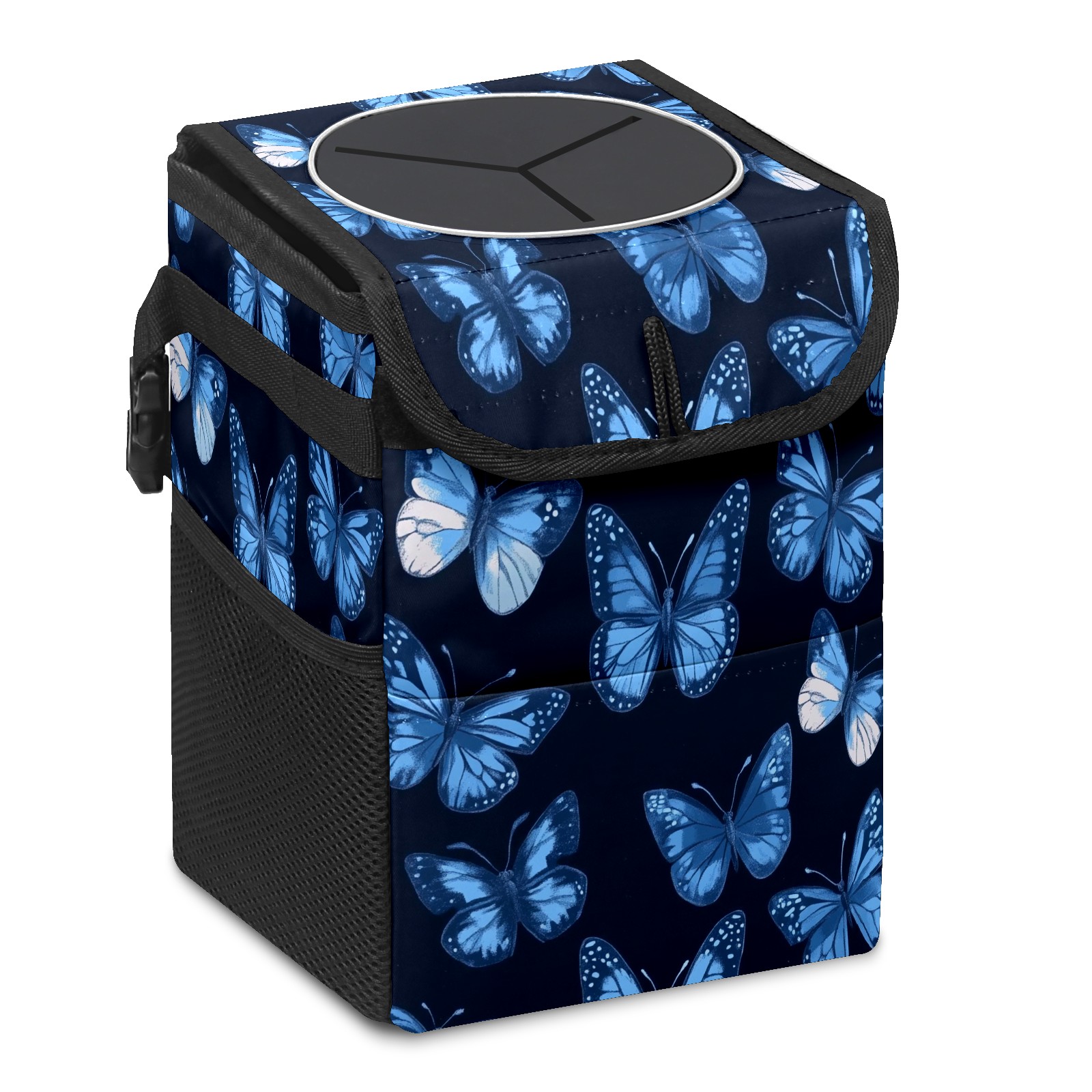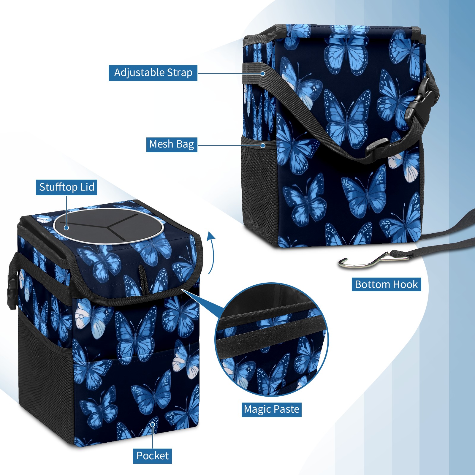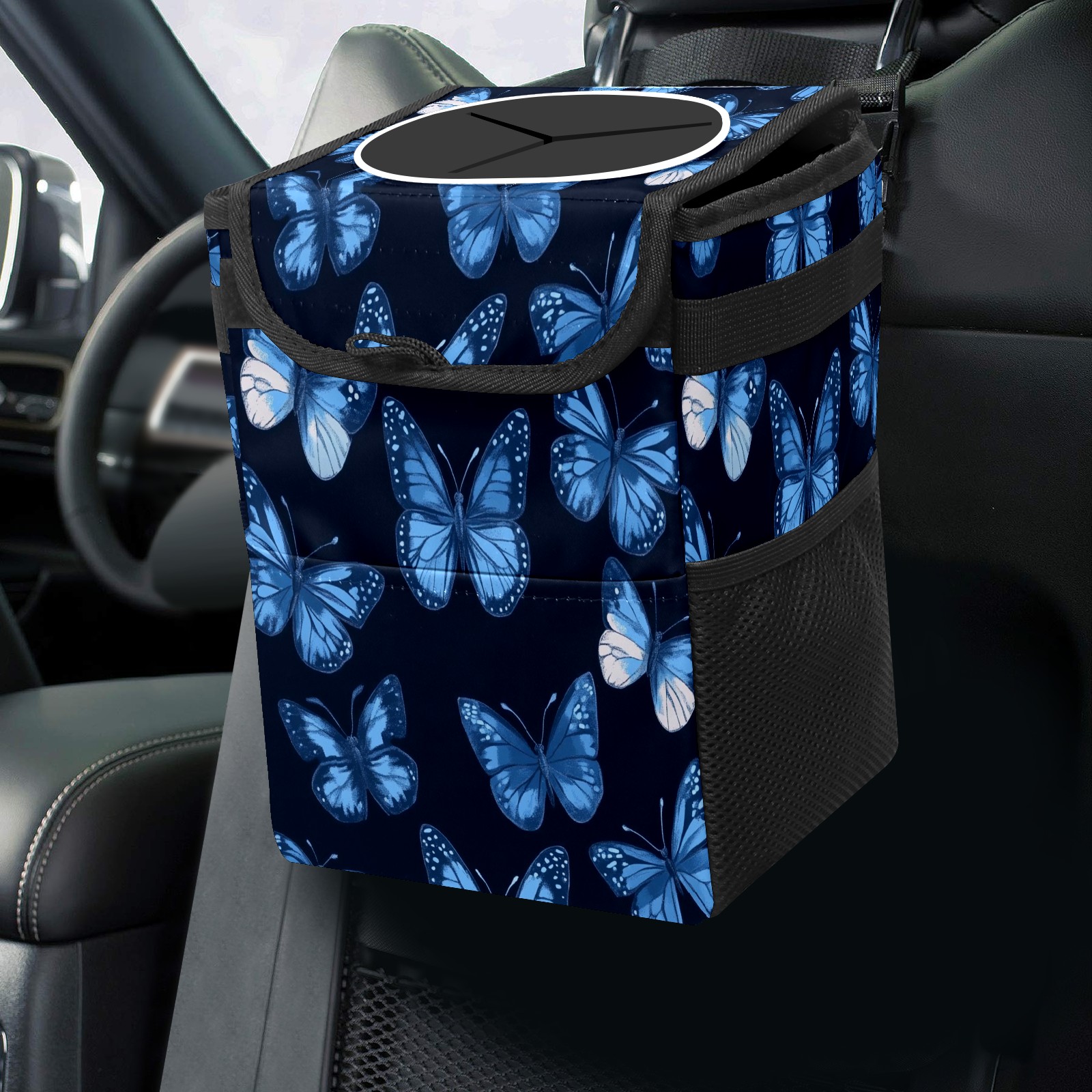Car Trash Can with Lid, Small Portable Hanging Automotive Garbage Bin for Vehicles, Leakproof Waste Bag Container for SUV Truck Van Interior Auto Travel Road Trips(Blue Butterflies)