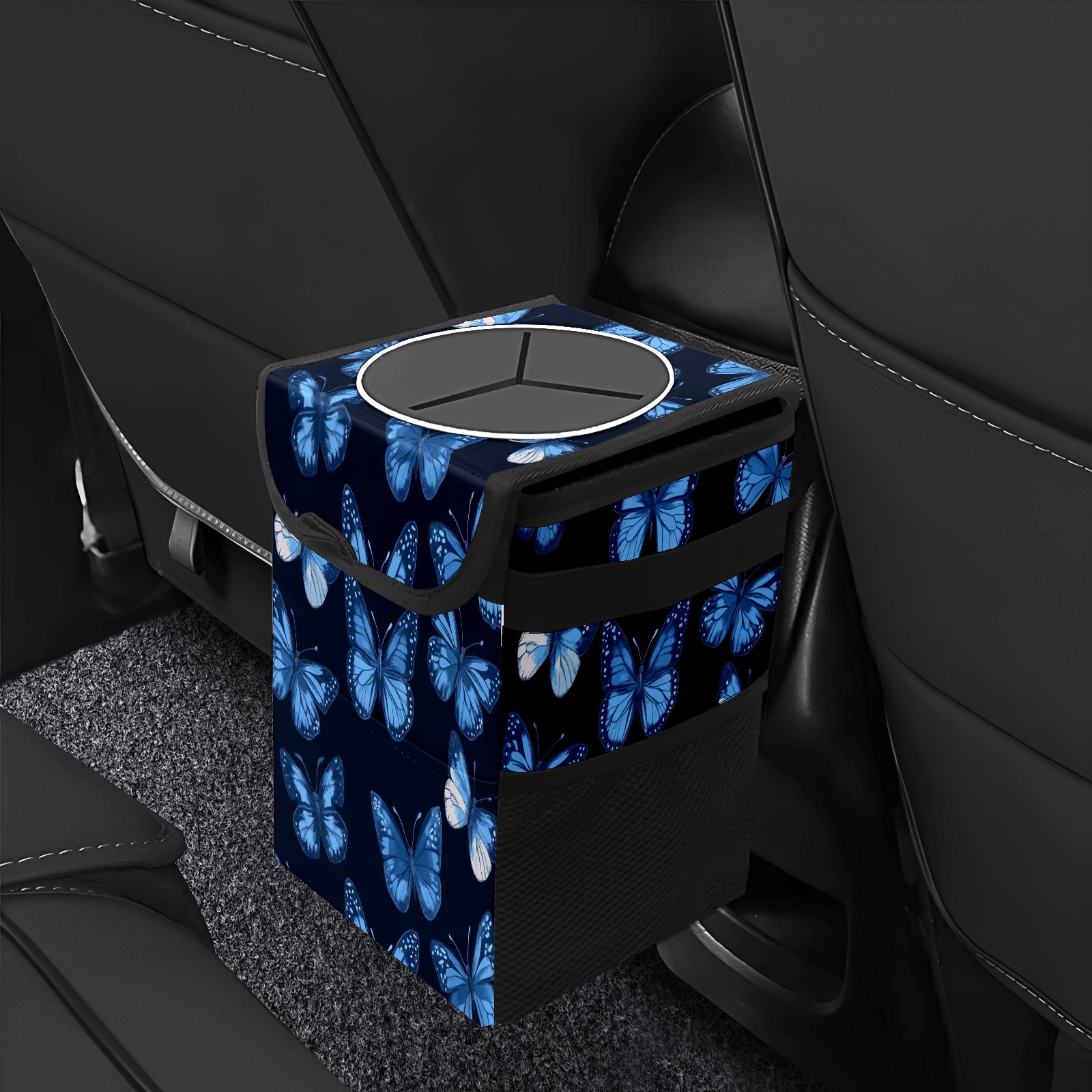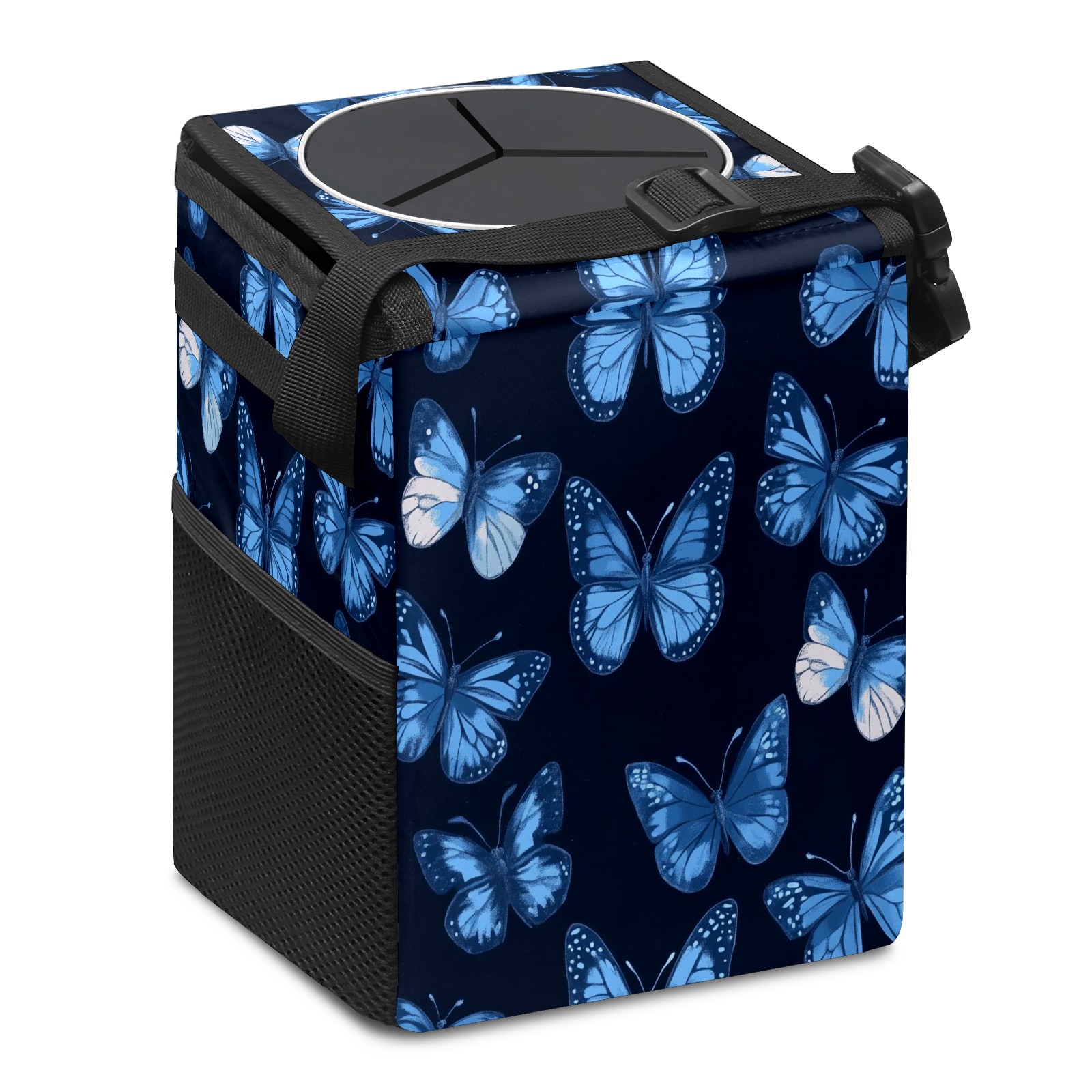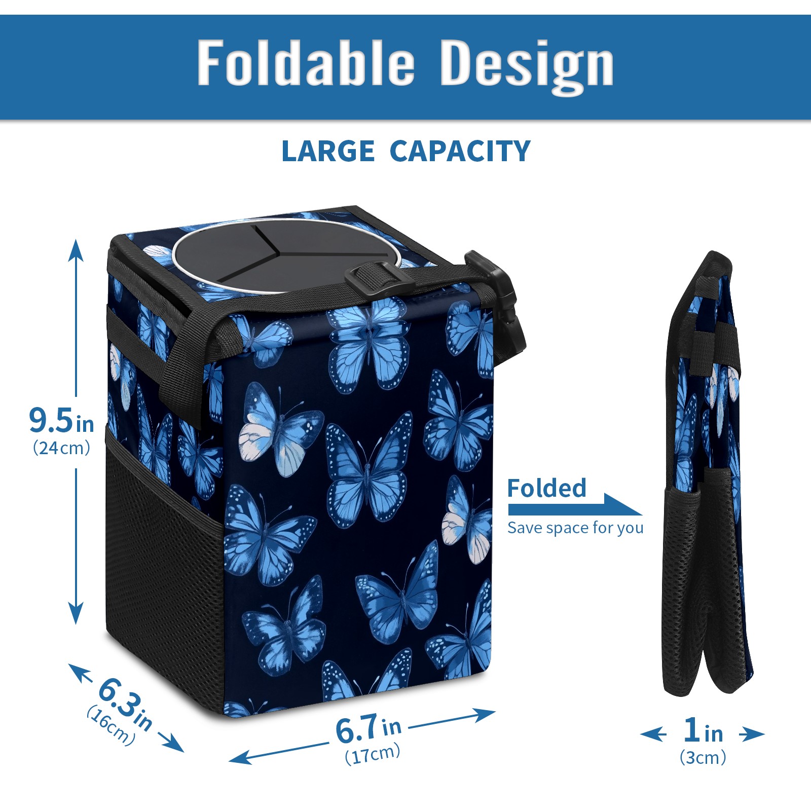 Car Trash Can with Lid, Small Portable Hanging Automotive Garbage Bin for Vehicles, Leakproof Waste Bag Container for SUV Truck Van Interior Auto Travel Road Trips(Blue Butterflies)