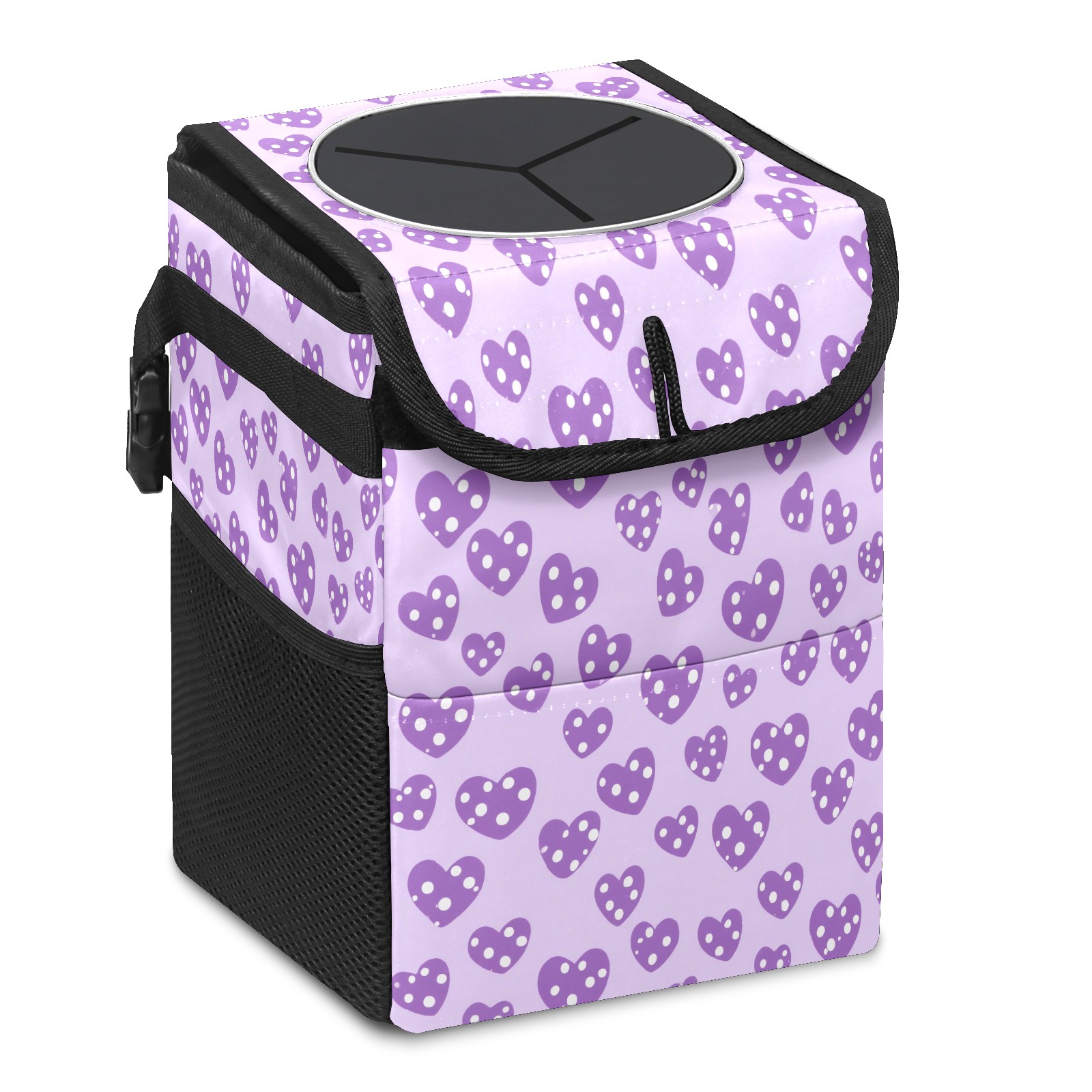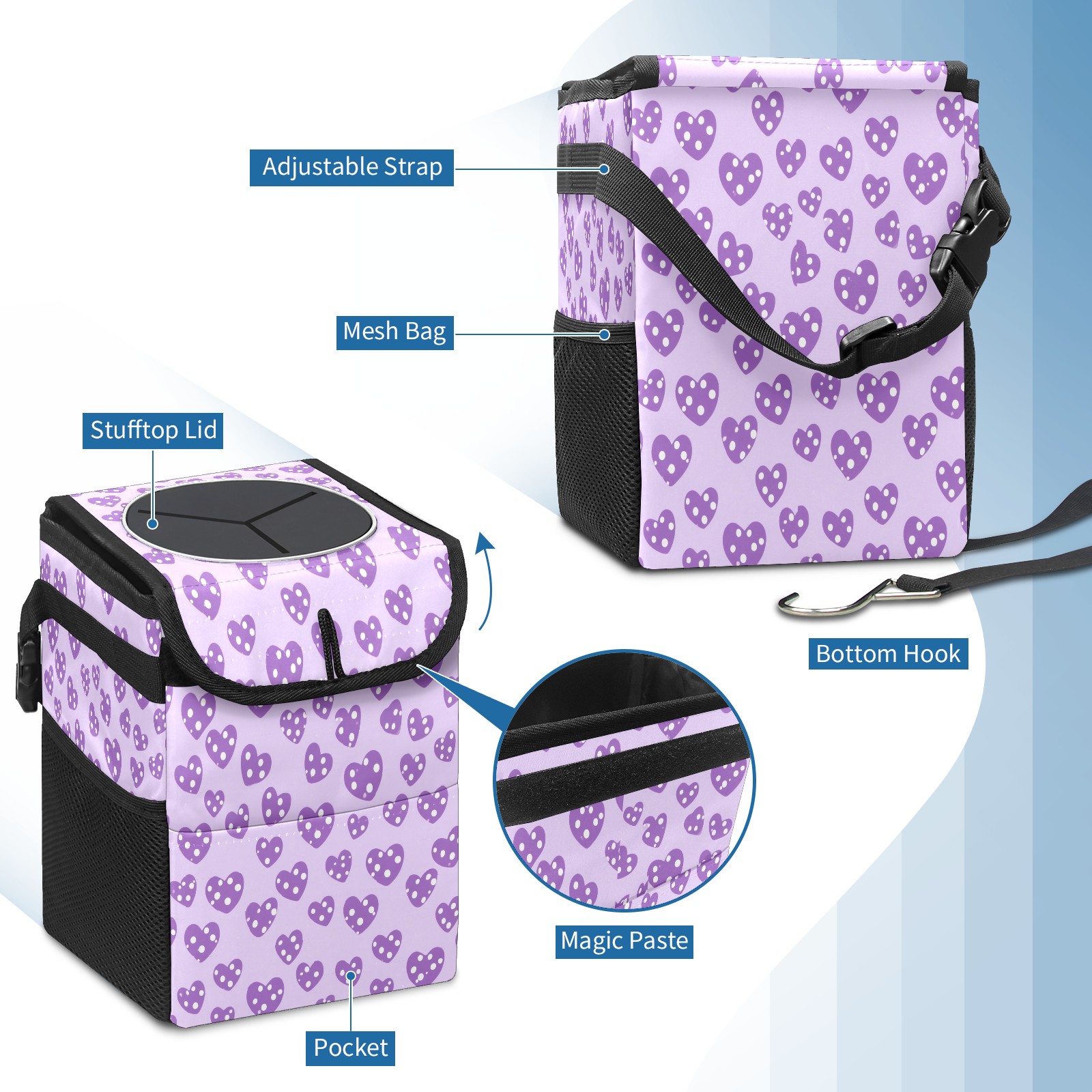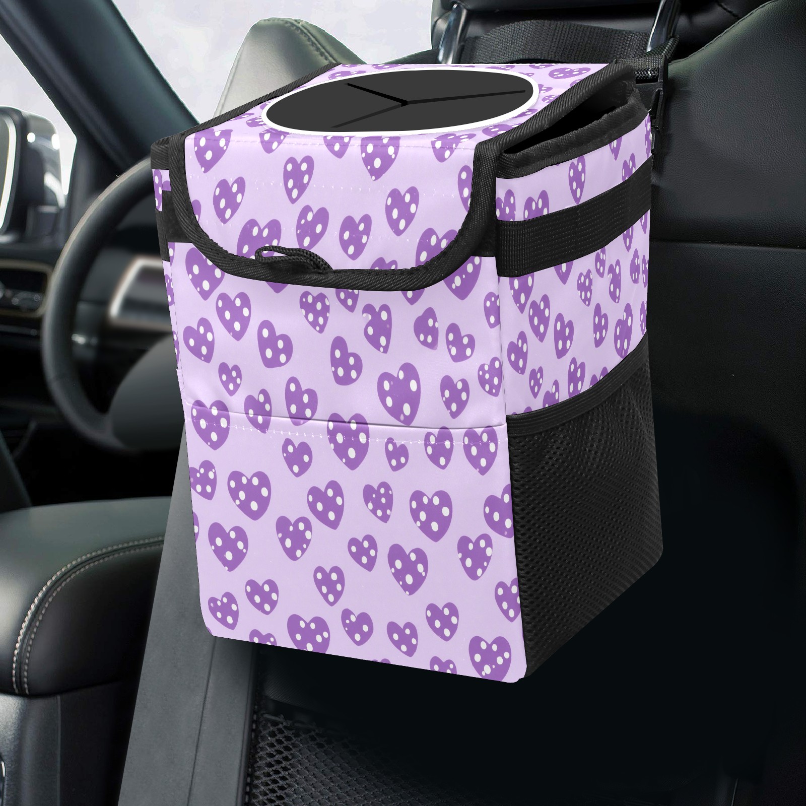 Car Trash Can with Lid, Small Portable Hanging Automotive Garbage Bin for Vehicles, Leakproof Waste Bag Container for SUV Truck Van Interior Auto Travel Road Trips(Purple Hearts)