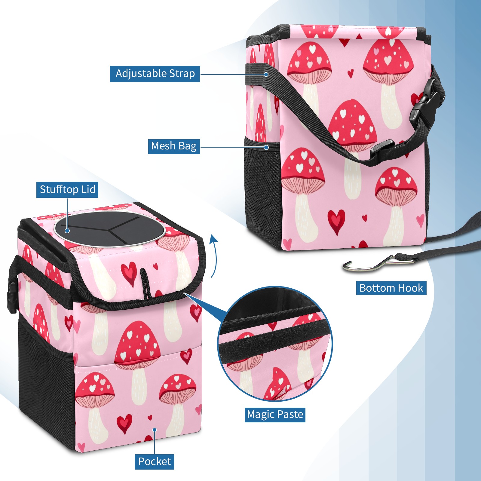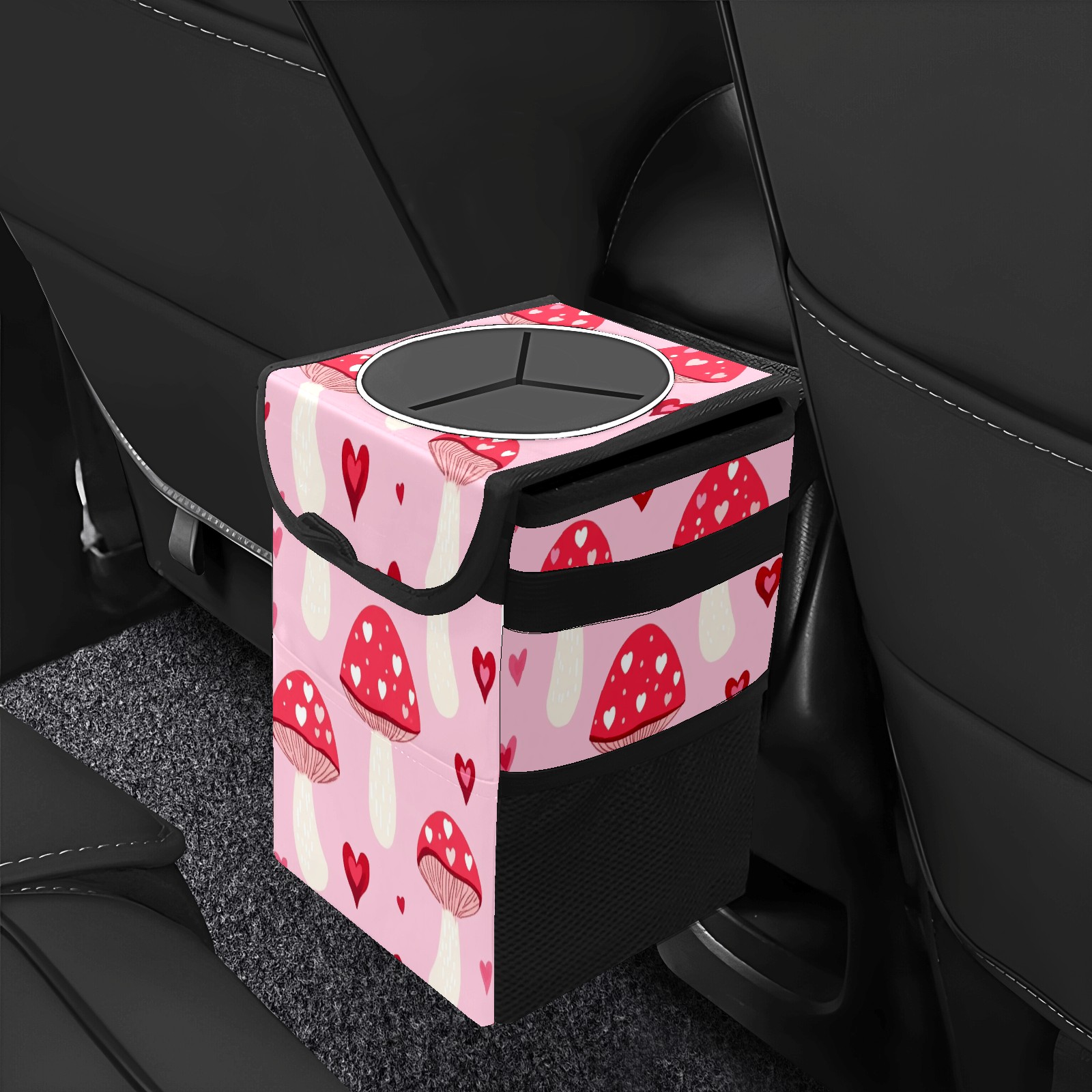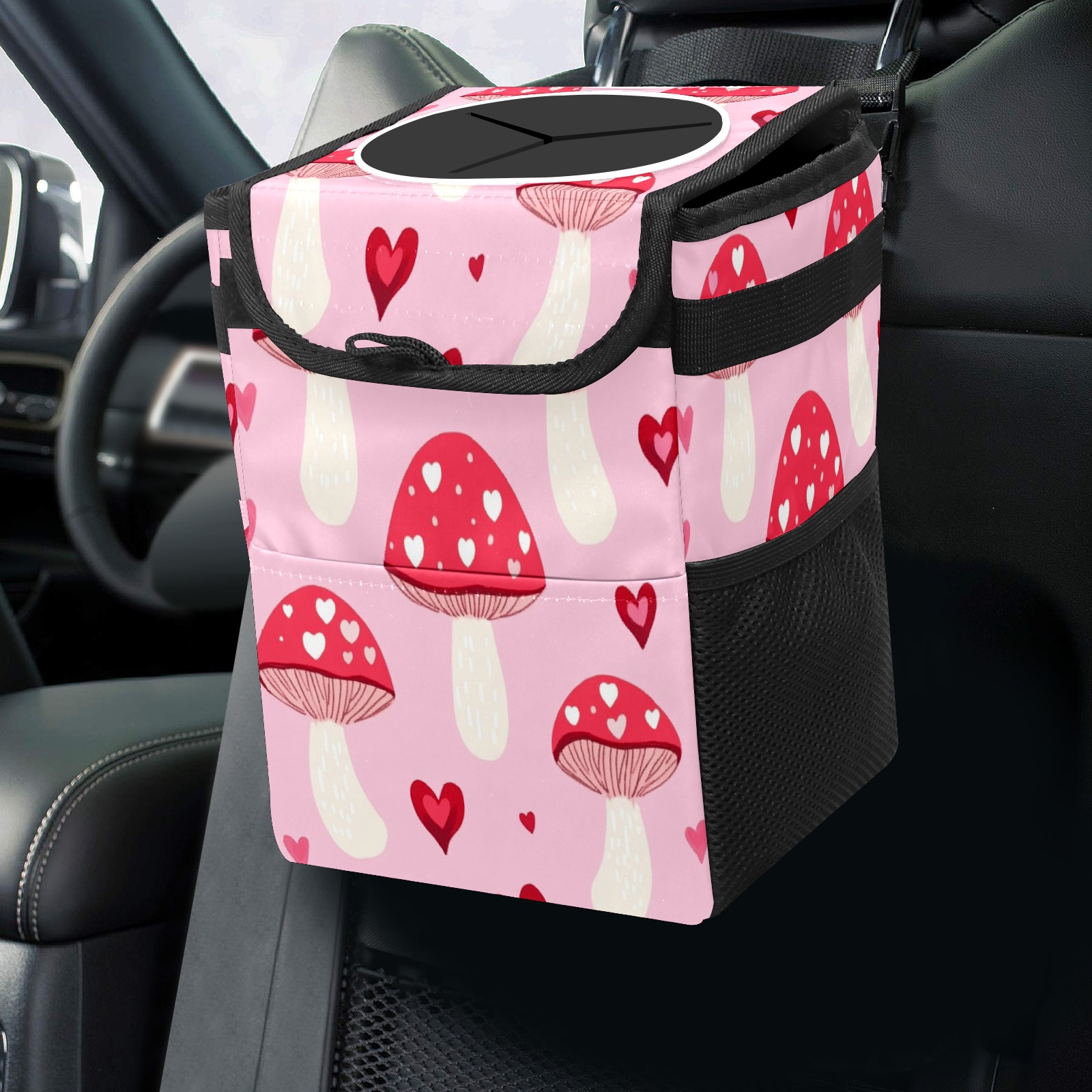 Car Trash Can with Lid, Small Portable Hanging Automotive Garbage Bin for Vehicles, Leakproof Waste Bag Container for SUV Truck Van Interior Auto Travel Road Trips(Pink Mushrooms)