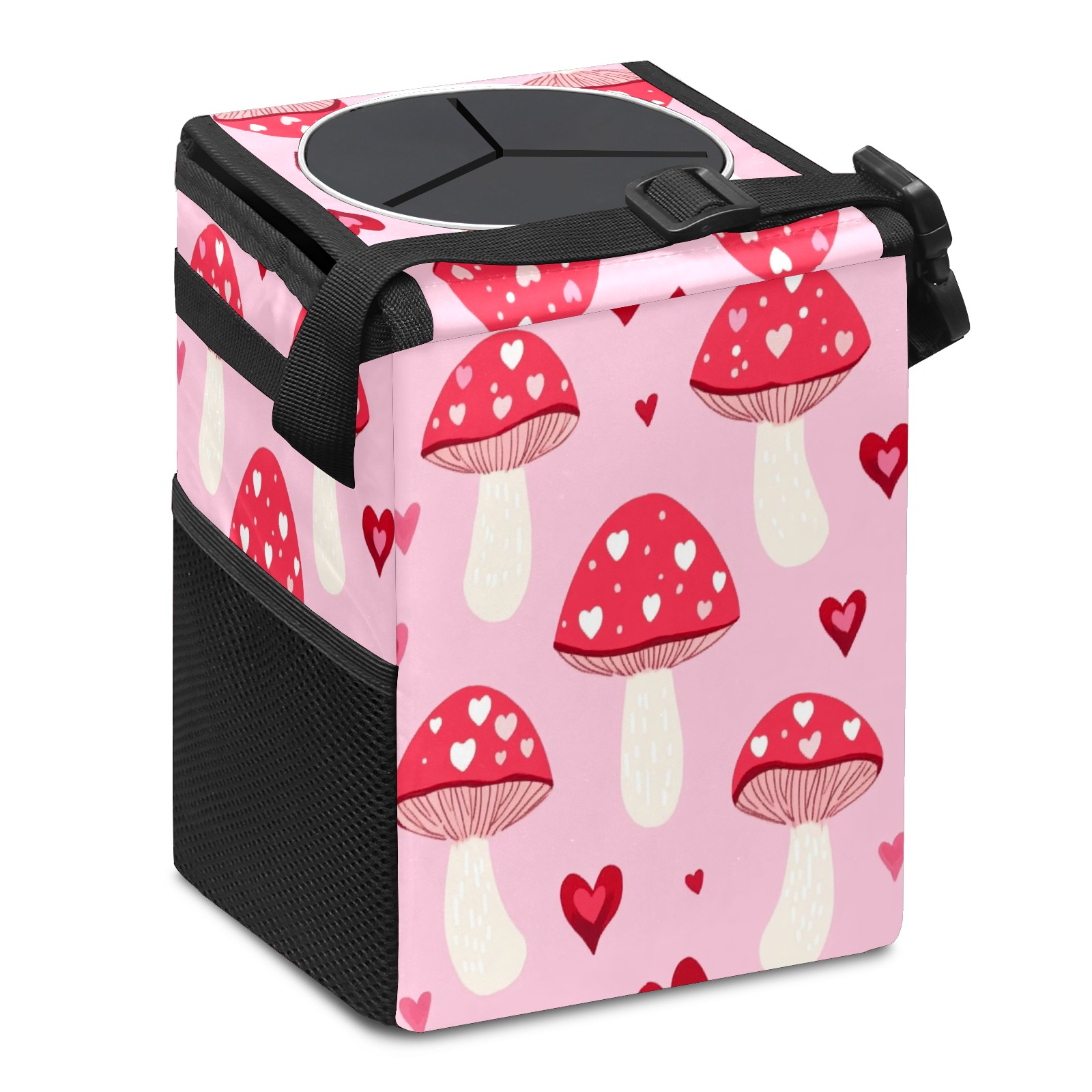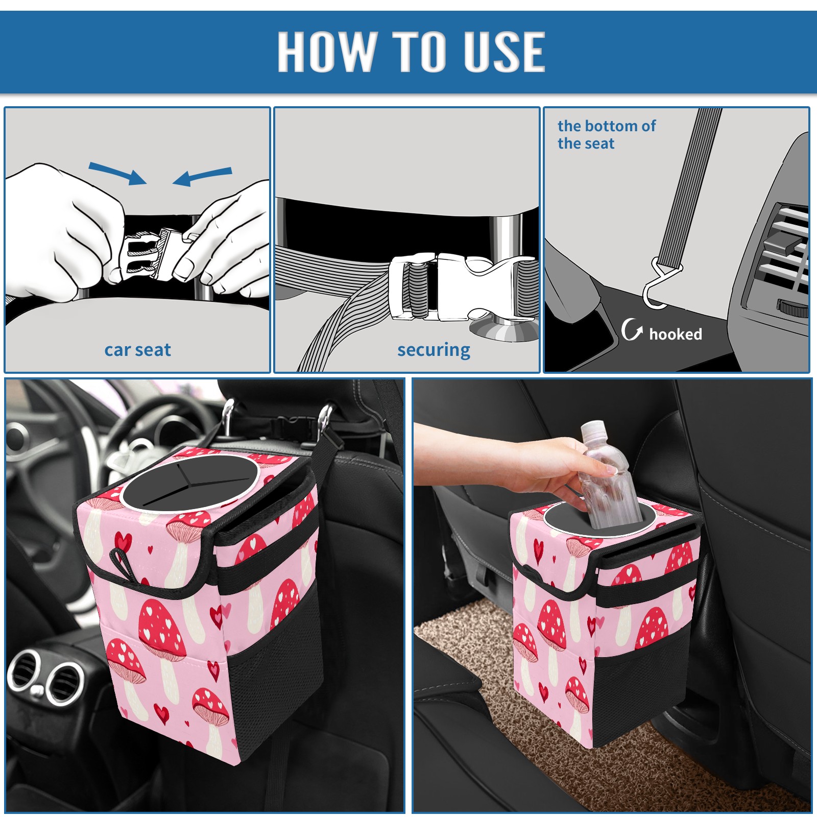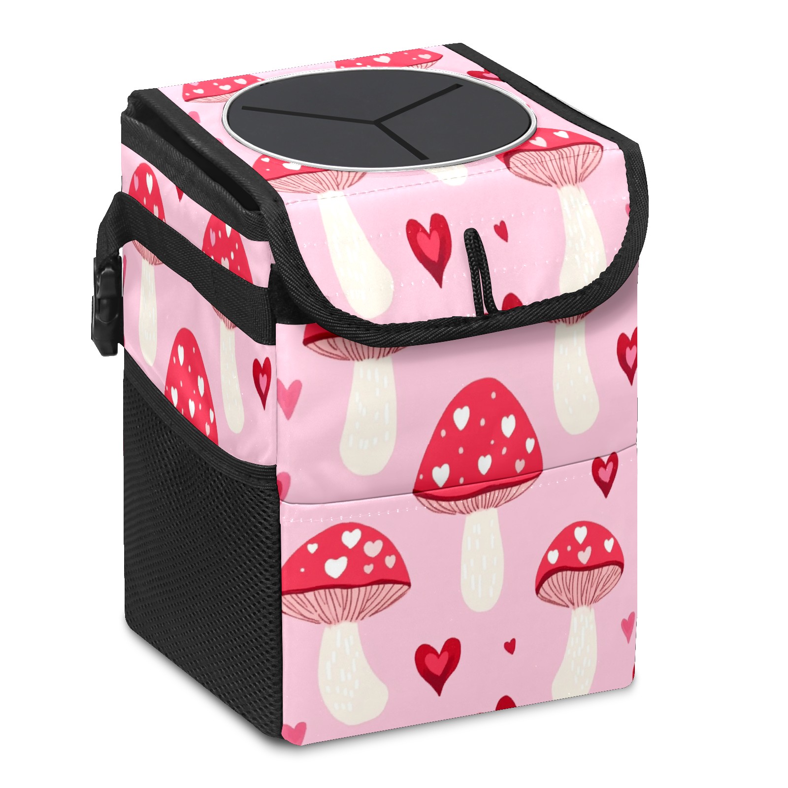 Car Trash Can with Lid, Small Portable Hanging Automotive Garbage Bin for Vehicles, Leakproof Waste Bag Container for SUV Truck Van Interior Auto Travel Road Trips(Pink Mushrooms)