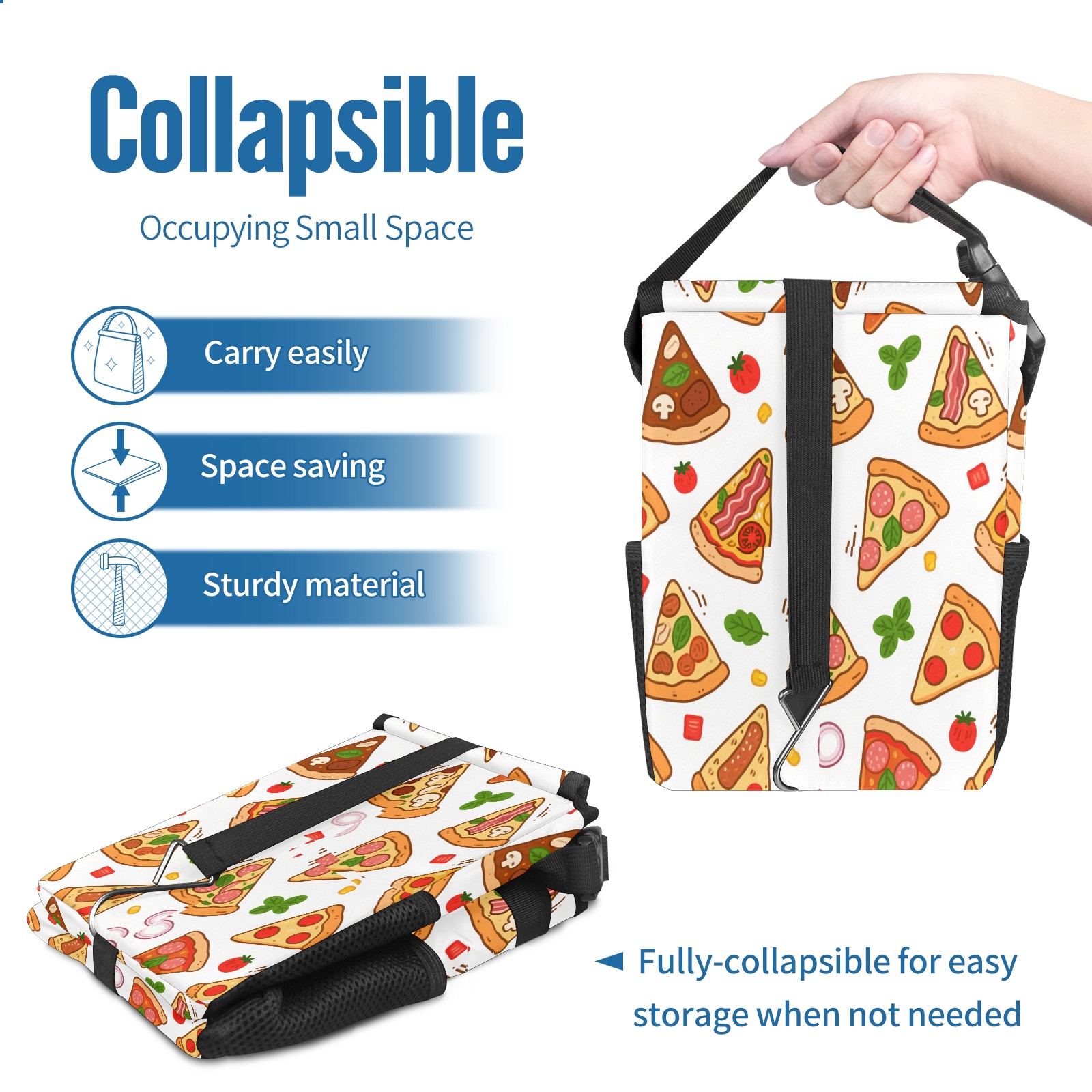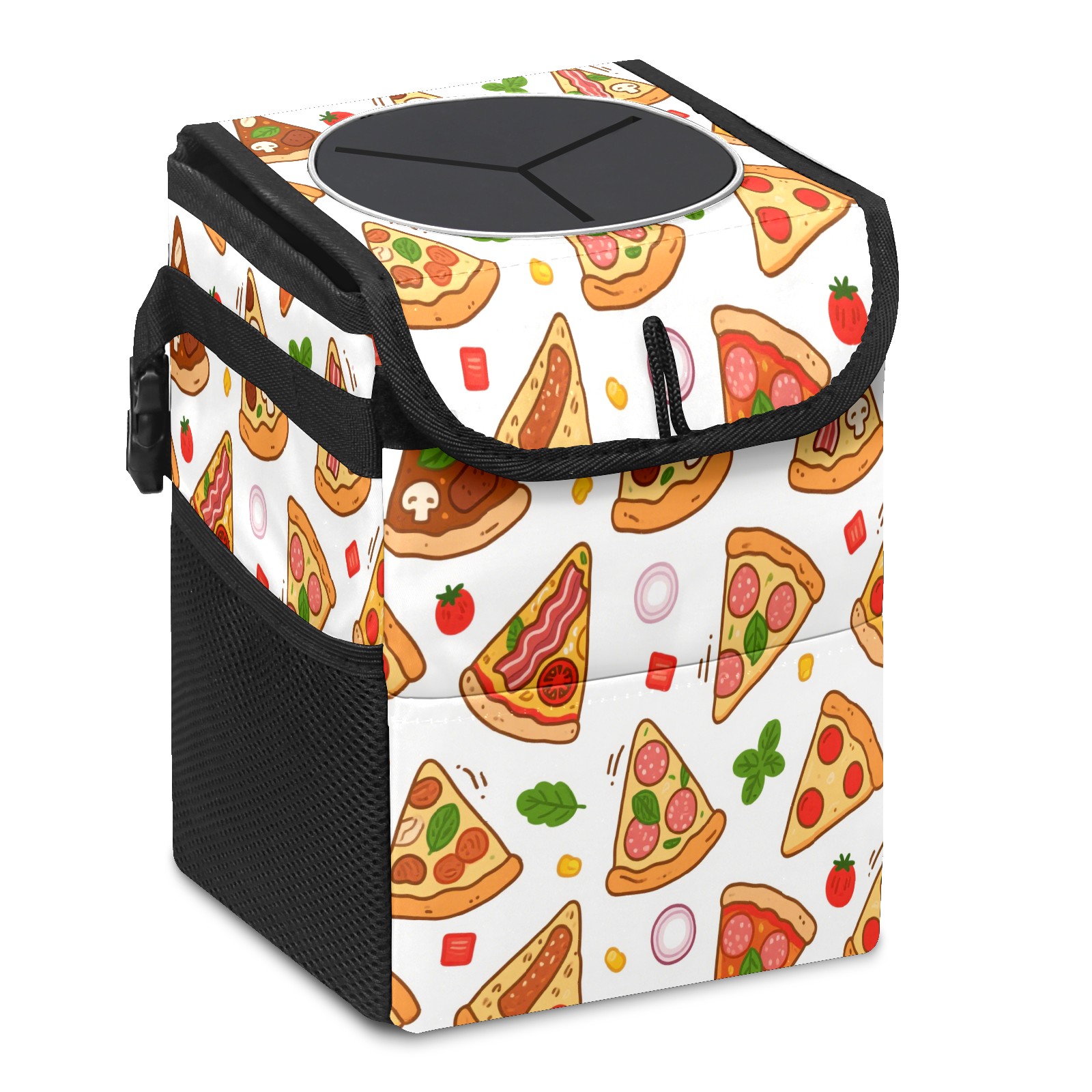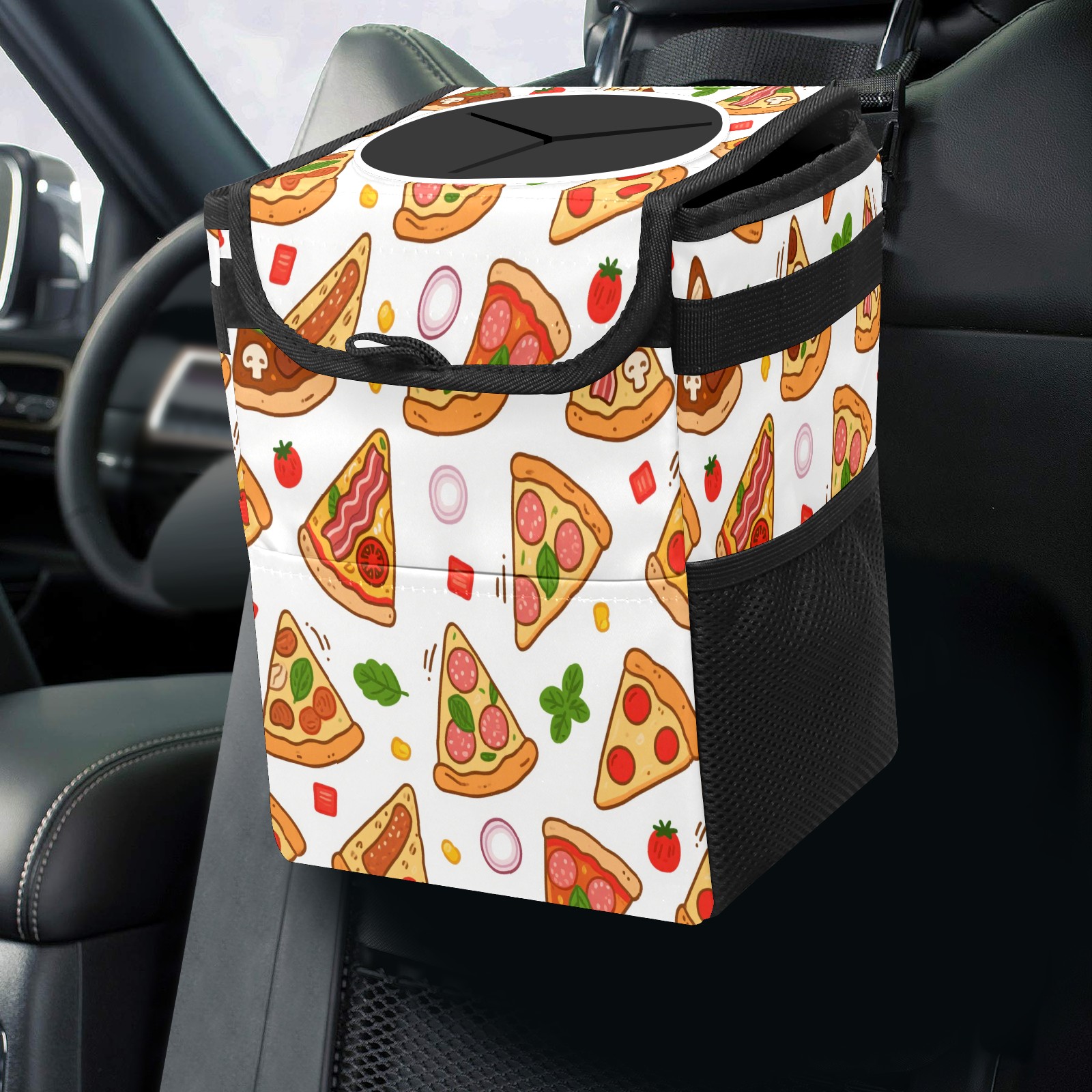 Car Trash Can with Lid, Small Portable Hanging Automotive Garbage Bin for Vehicles, Leakproof Waste Bag Container for SUV Truck Van Interior Auto Travel Road Trips(Pizza)