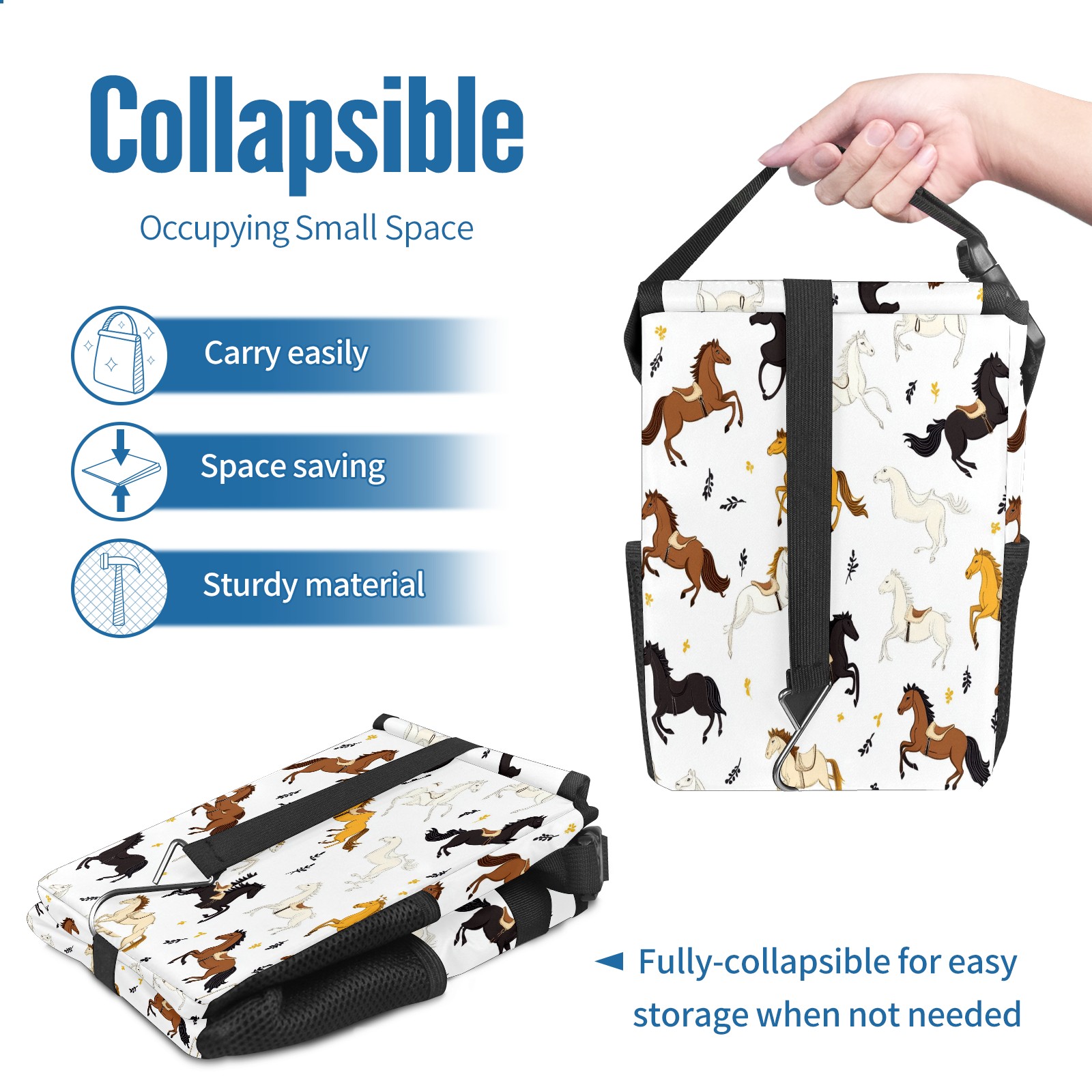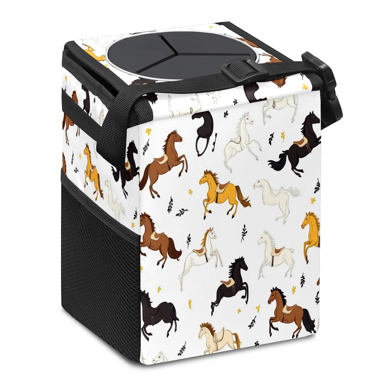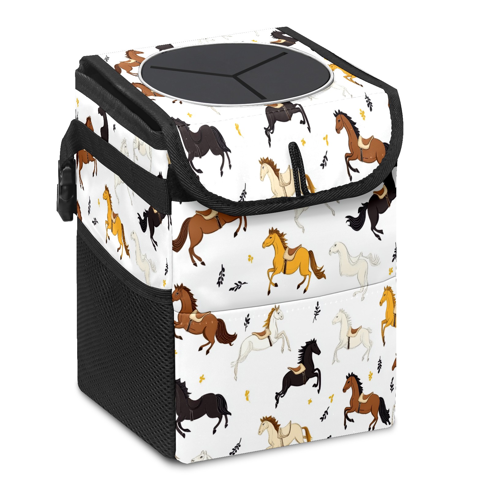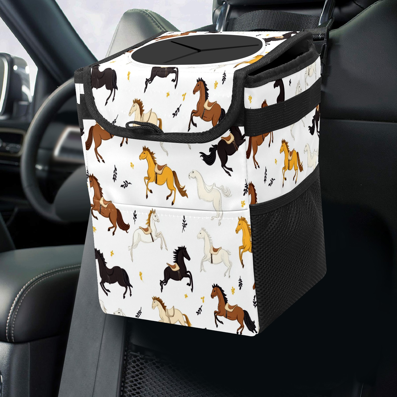 Car Trash Can with Lid, Small Portable Hanging Automotive Garbage Bin for Vehicles, Leakproof Waste Bag Container for SUV Truck Van Interior Auto Travel Road Trips(Horses)