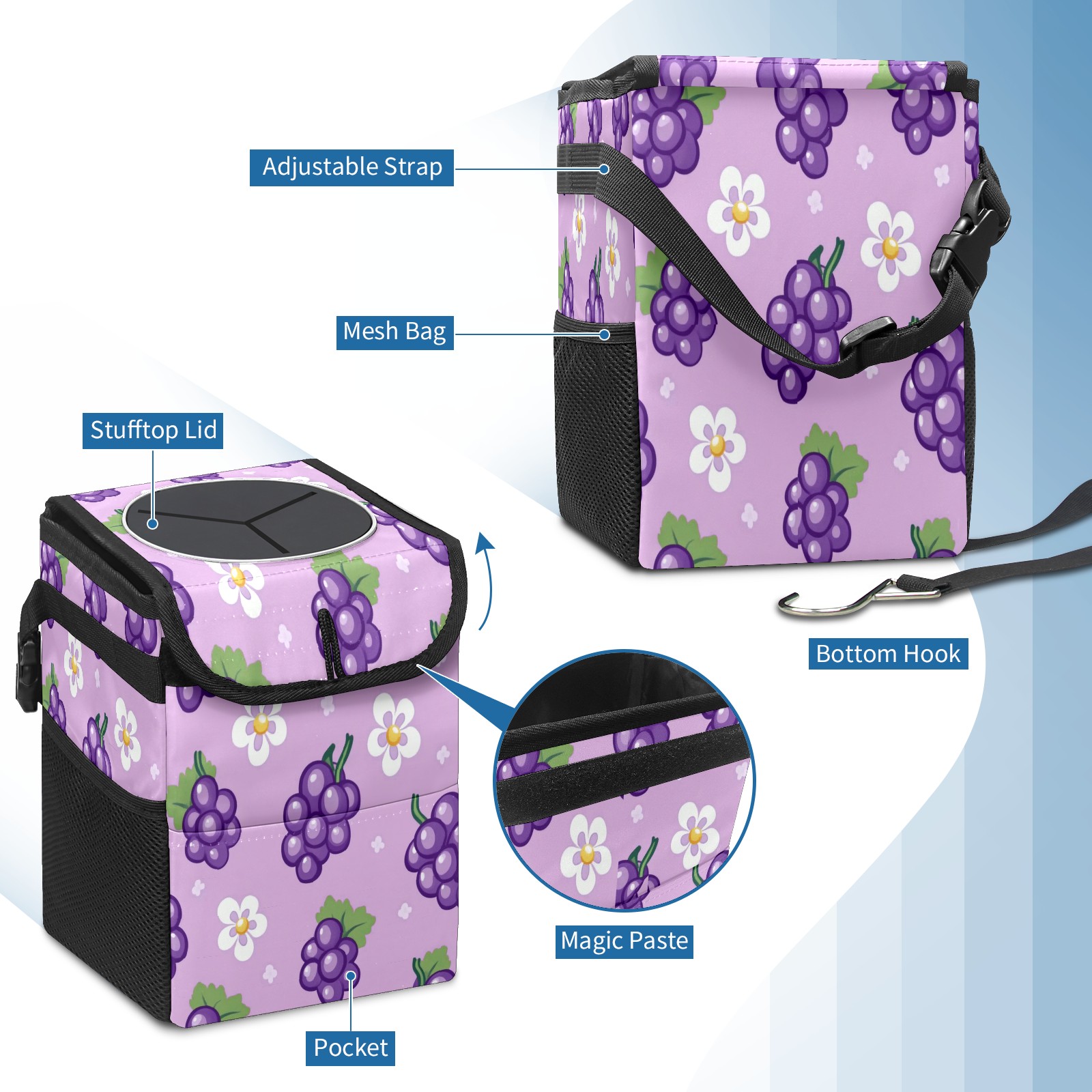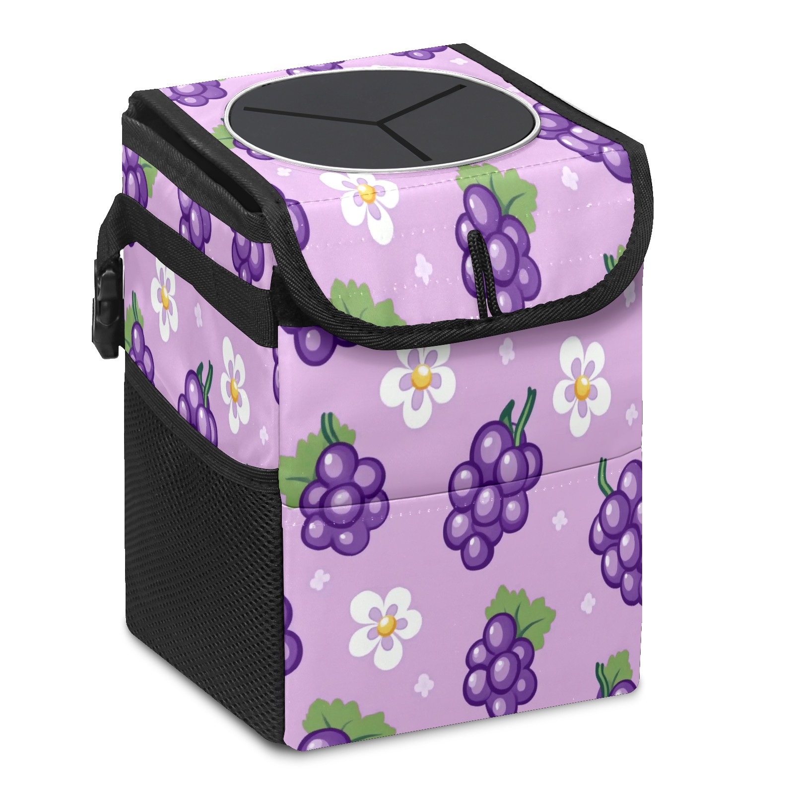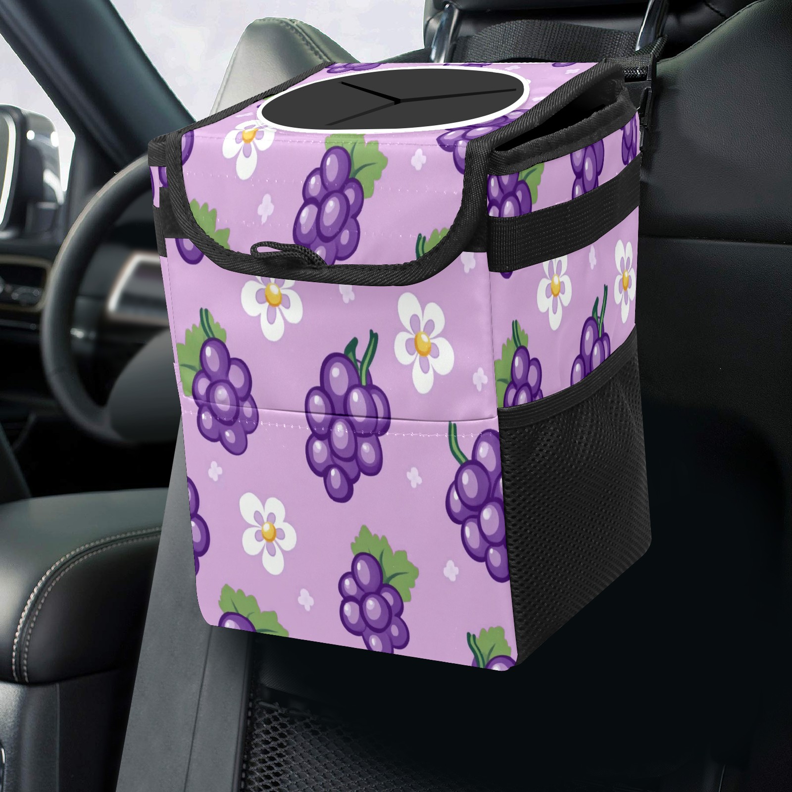 Car Trash Can with Lid, Small Portable Hanging Automotive Garbage Bin for Vehicles, Leakproof Waste Bag Container for SUV Truck Van Interior Auto Travel Road Trips(Grapes And White Flowers)