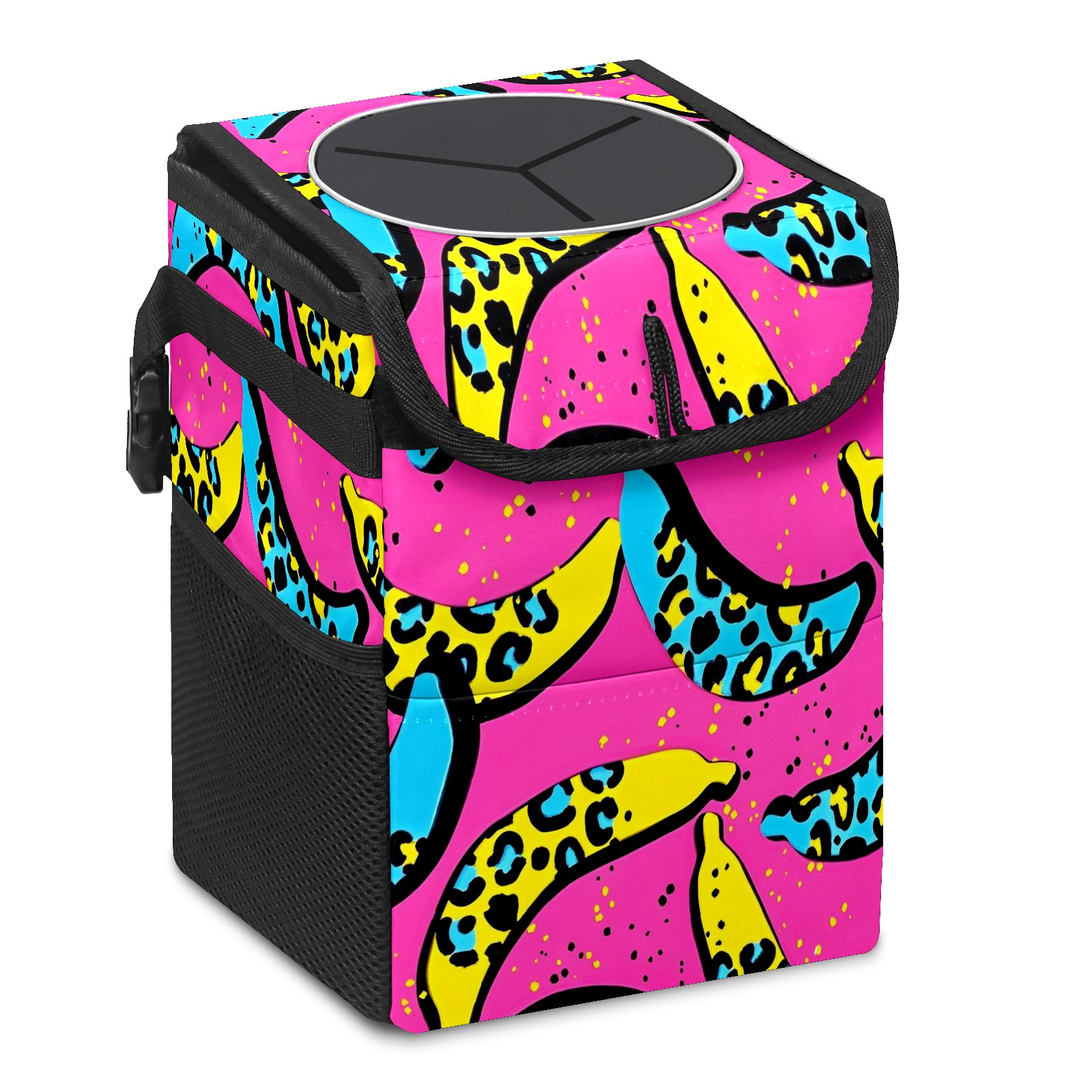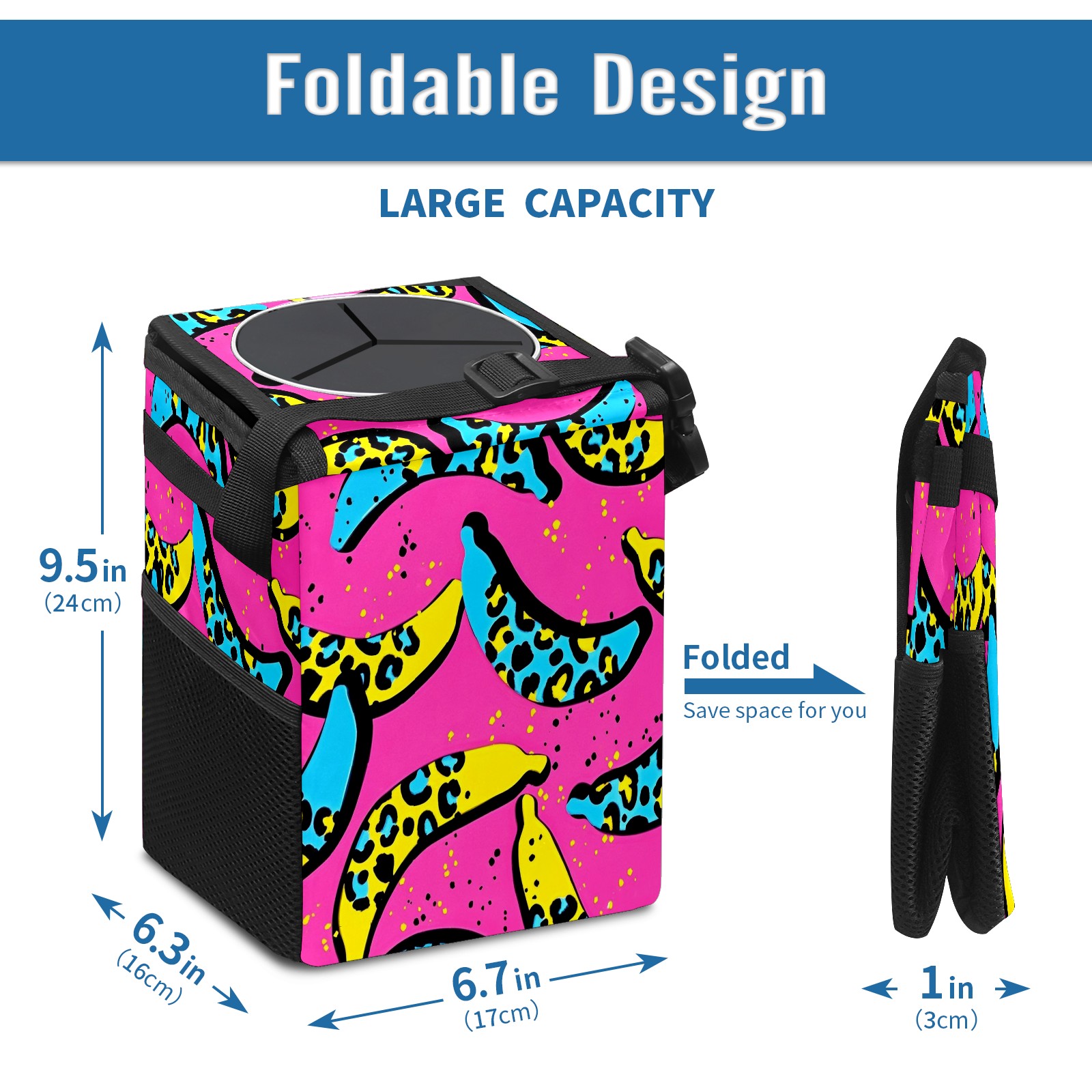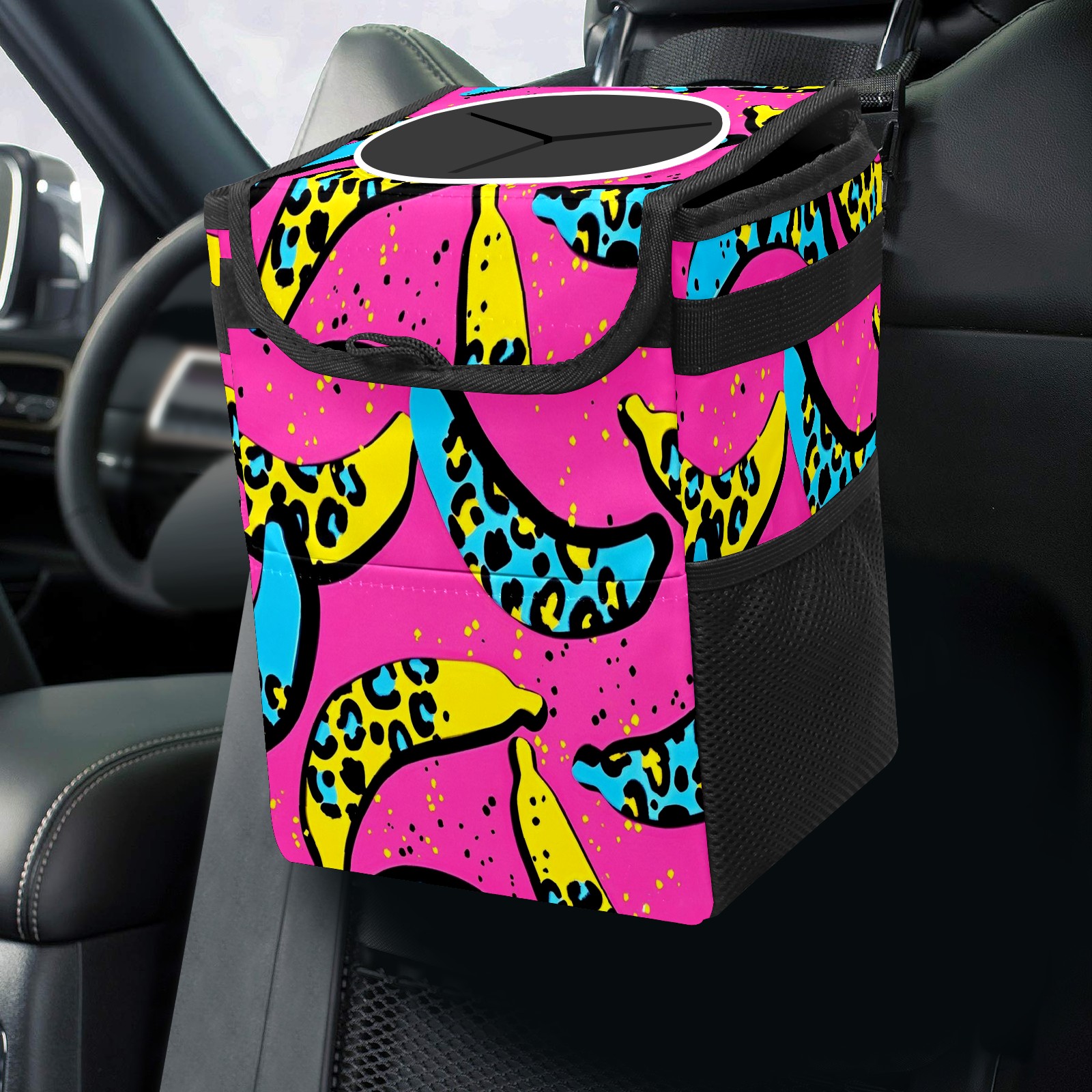 Car Trash Can with Lid, Small Portable Hanging Automotive Garbage Bin for Vehicles, Leakproof Waste Bag Container for SUV Truck Van Interior Auto Travel Road Trips(Leopard Banana)