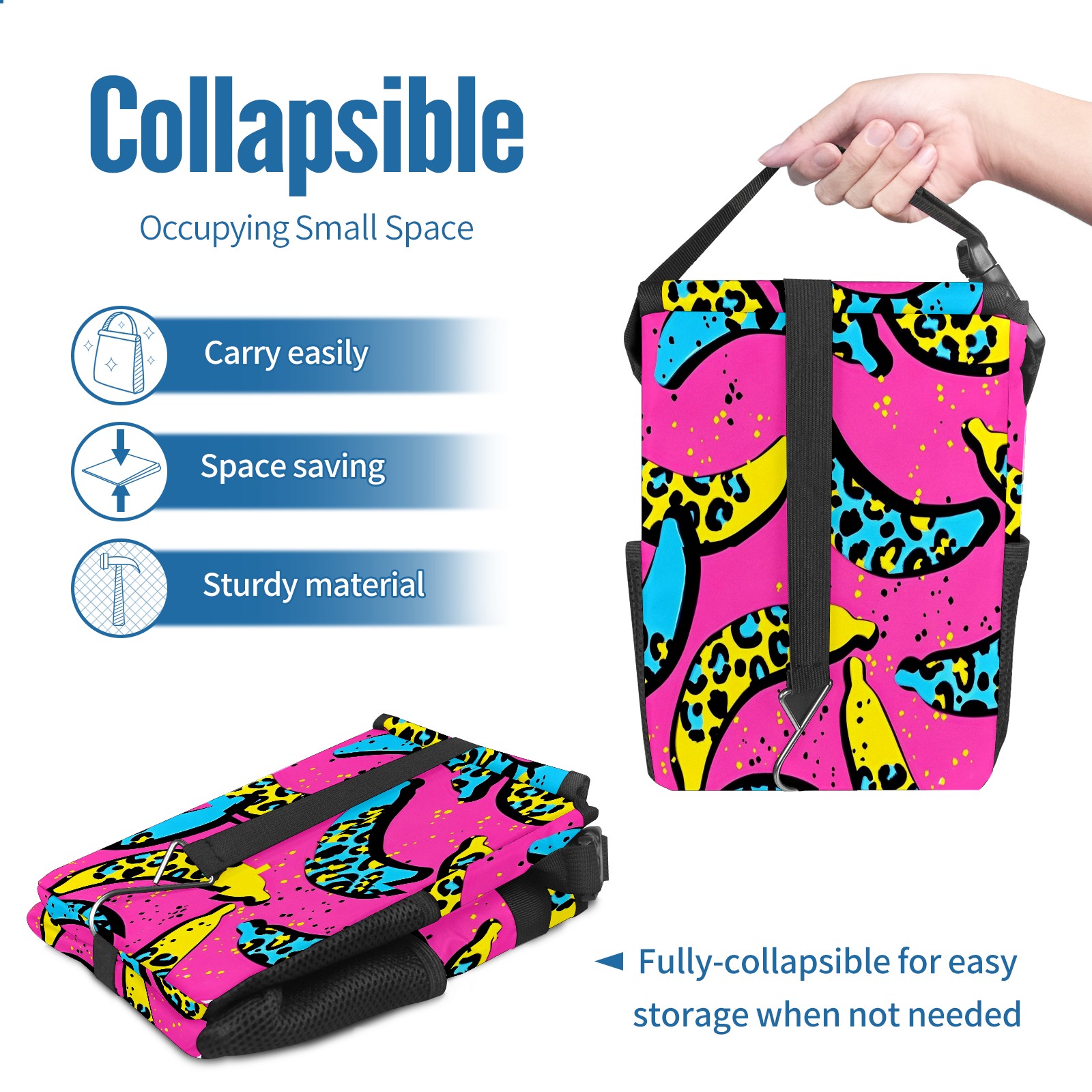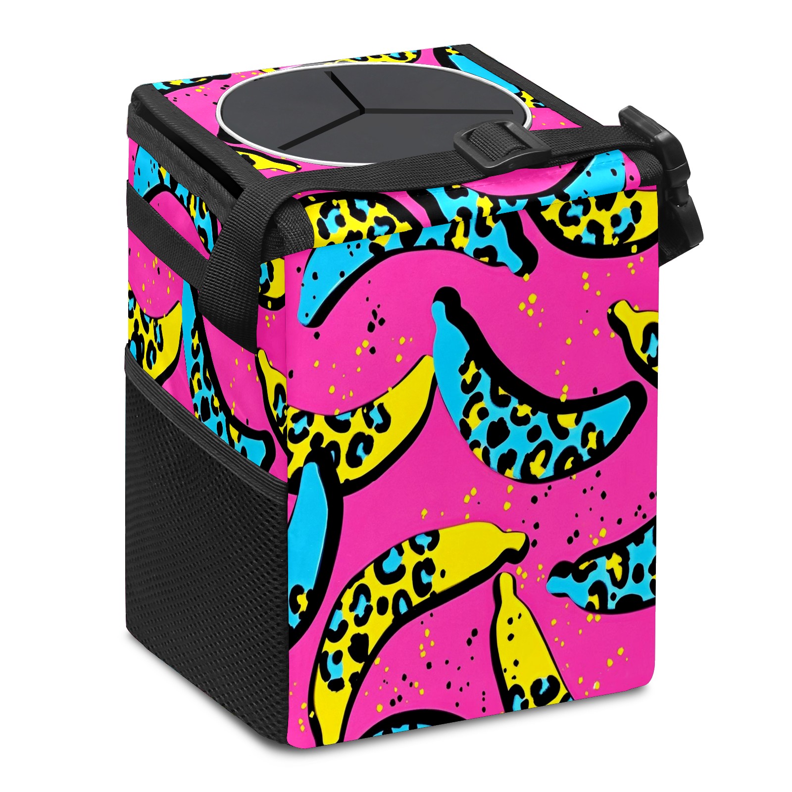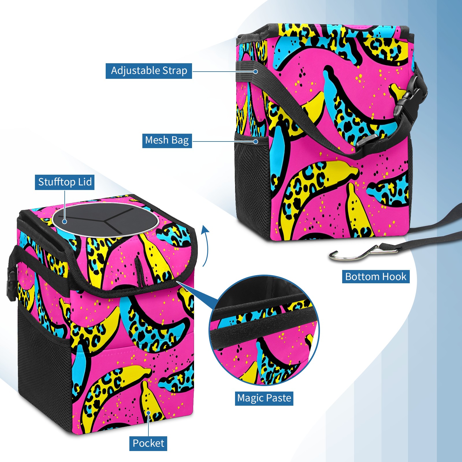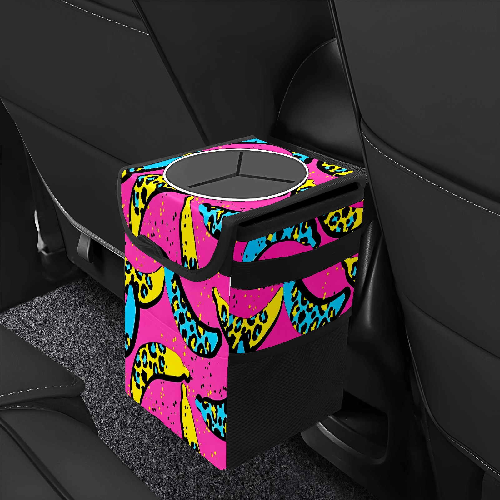 Car Trash Can with Lid, Small Portable Hanging Automotive Garbage Bin for Vehicles, Leakproof Waste Bag Container for SUV Truck Van Interior Auto Travel Road Trips(Leopard Banana)