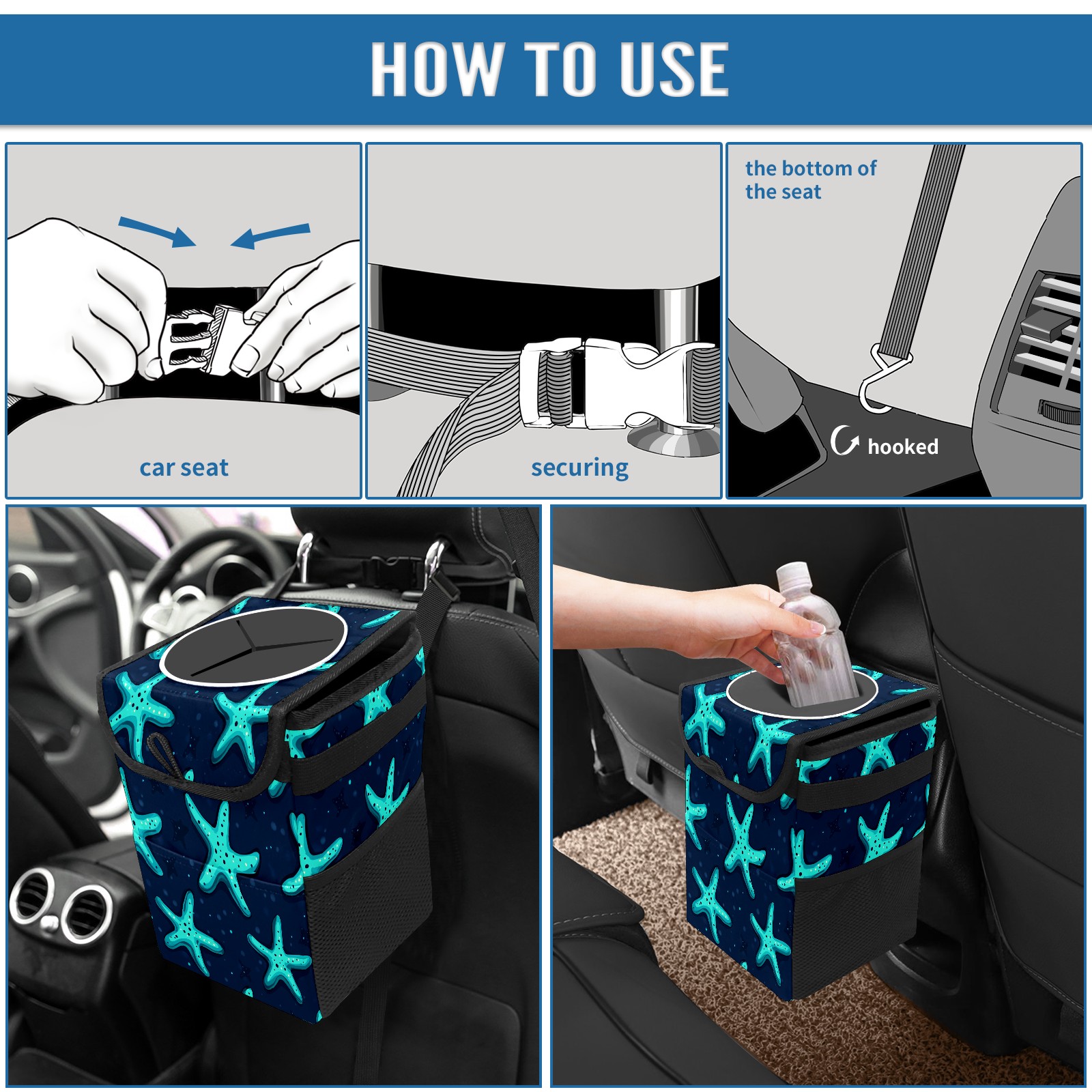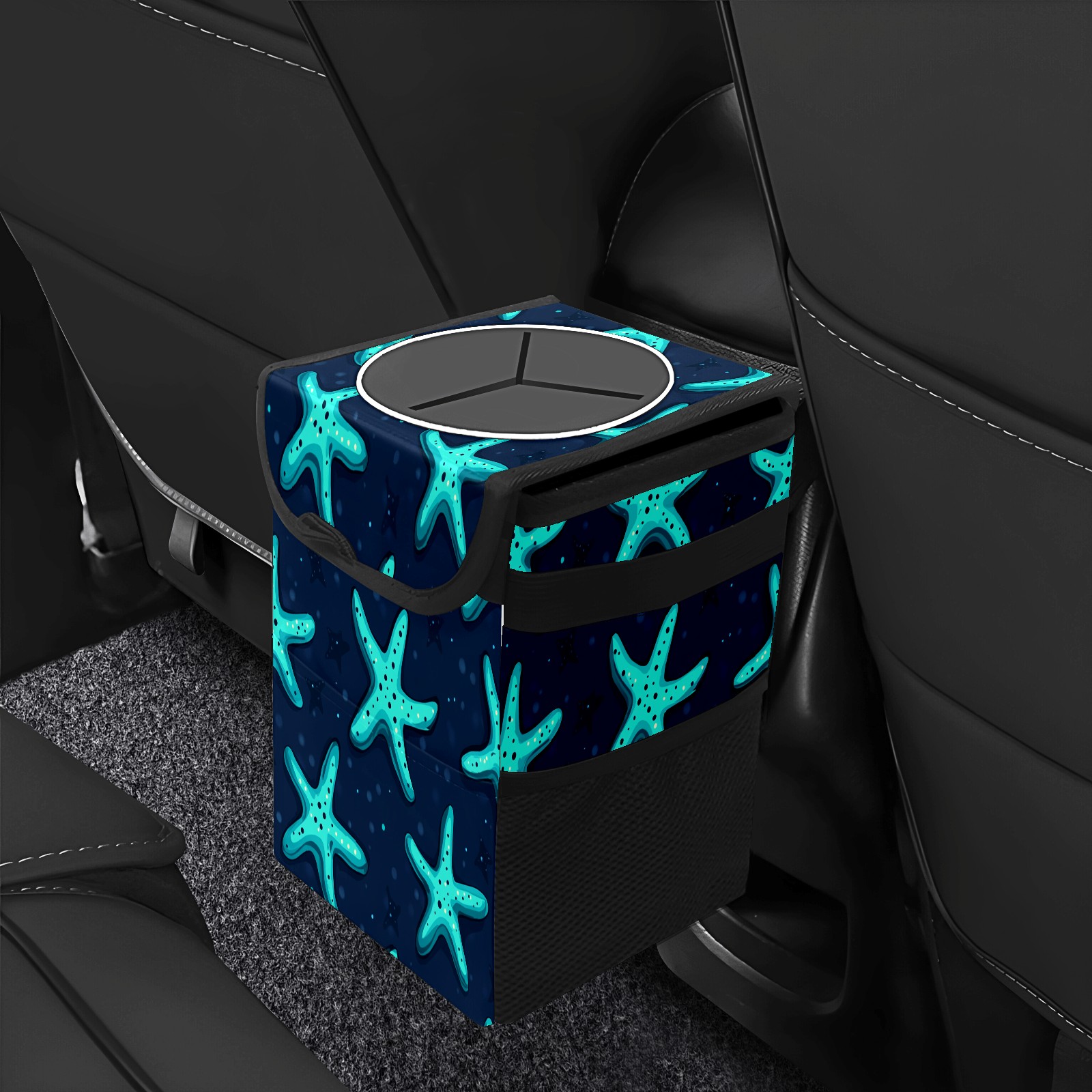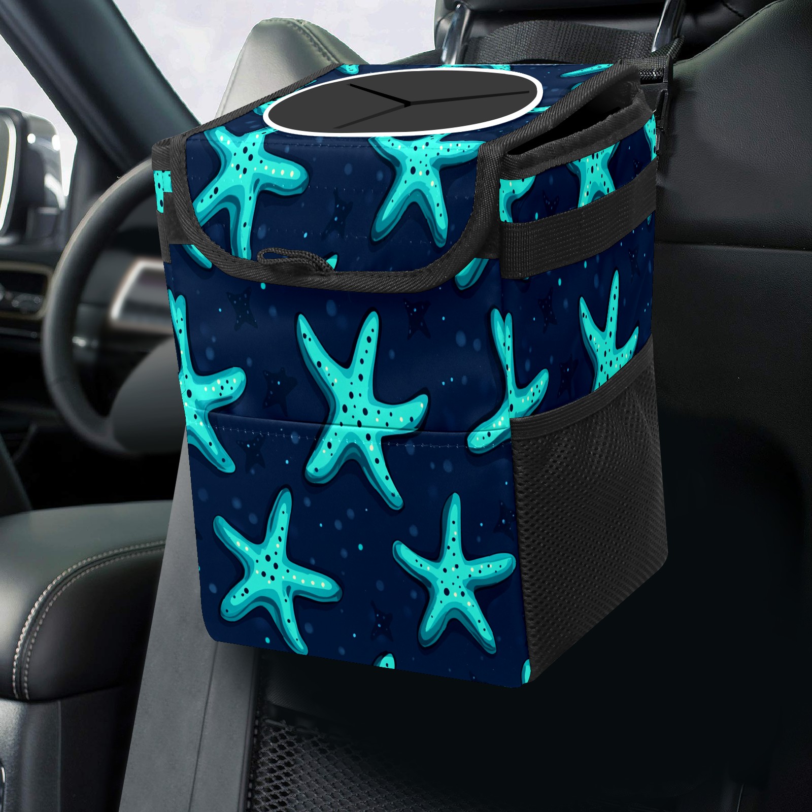 Car Trash Can with Lid, Small Portable Hanging Automotive Garbage Bin for Vehicles, Leakproof Waste Bag Container for SUV Truck Van Interior Auto Travel Road Trips(Starfish)