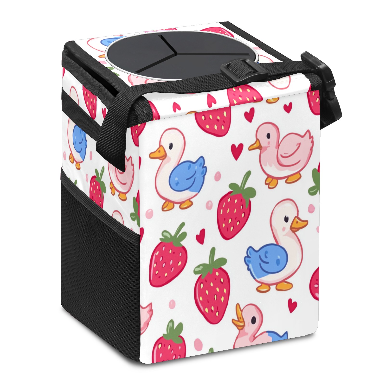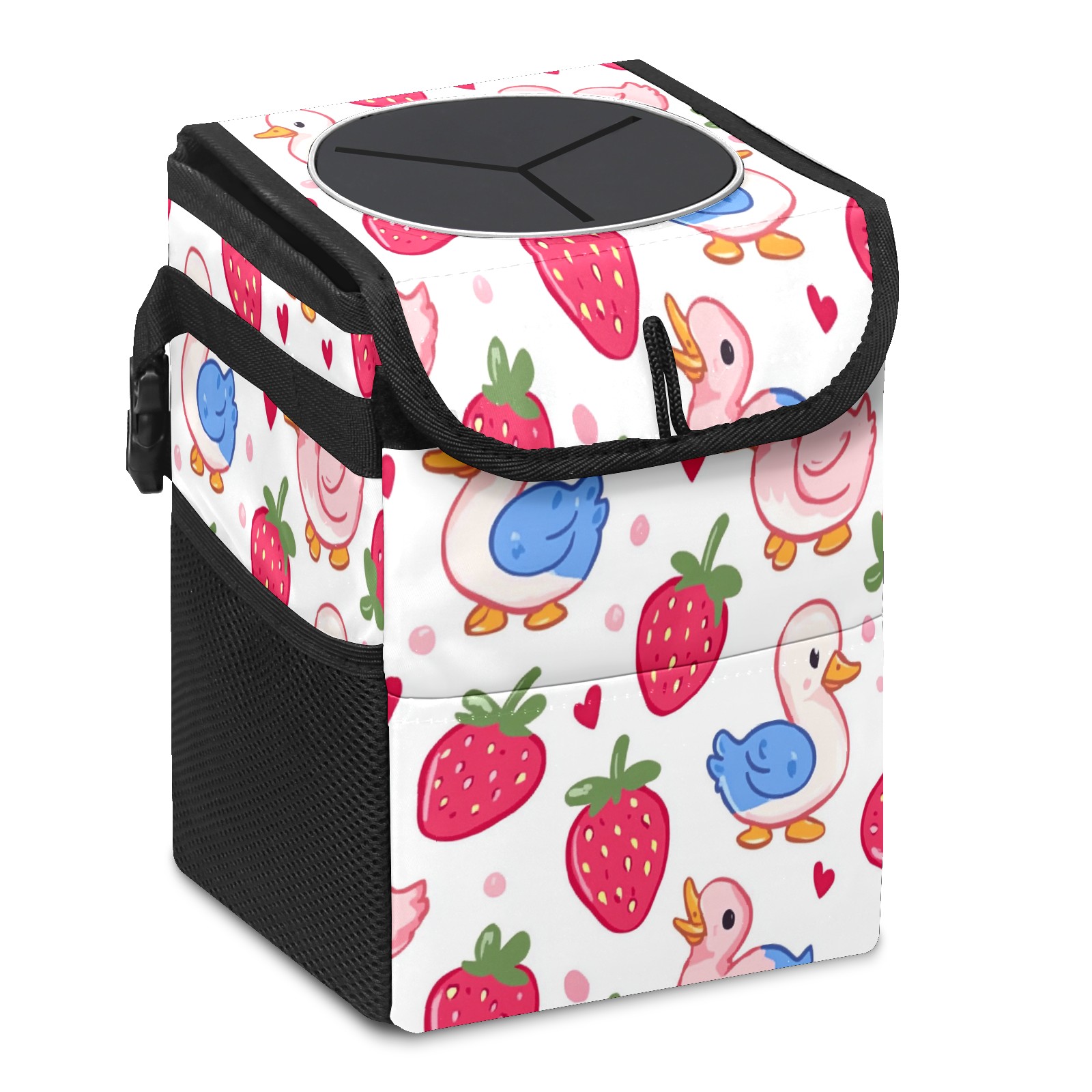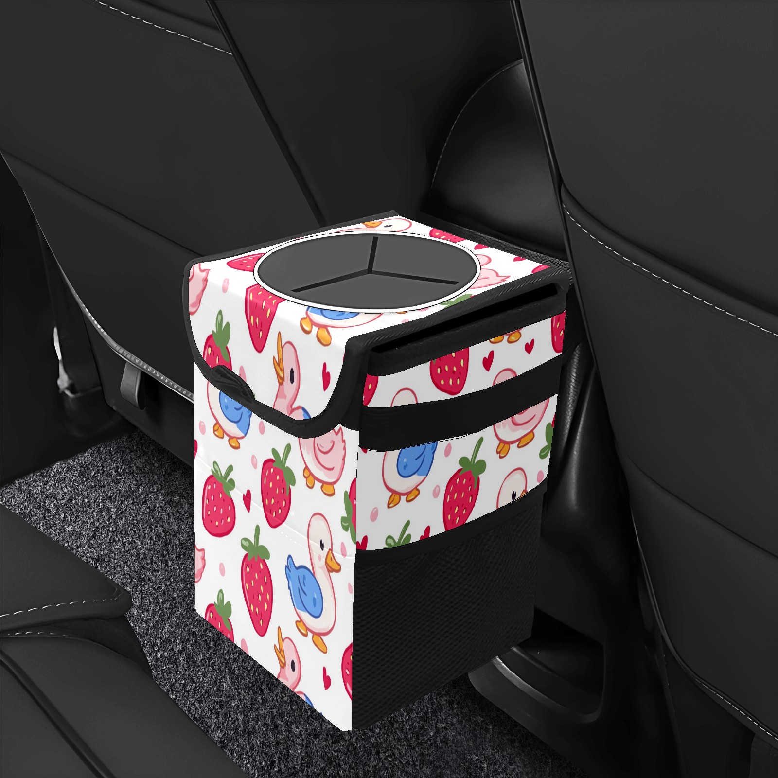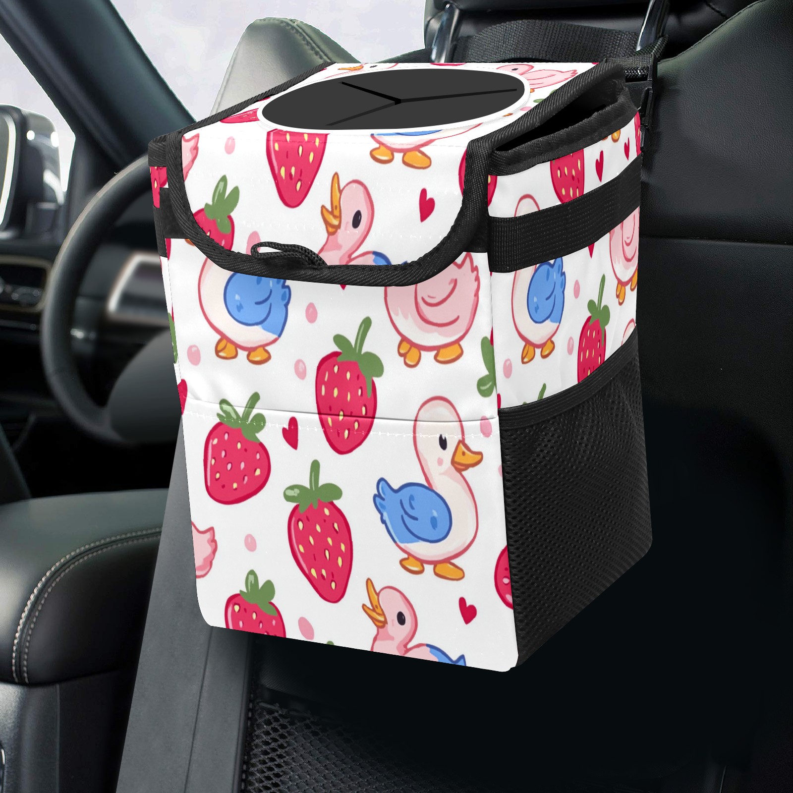 Car Trash Can with Lid, Small Portable Hanging Automotive Garbage Bin for Vehicles, Leakproof Waste Bag Container for SUV Truck Van Interior Auto Travel Road Trips(Strawberry Duck)