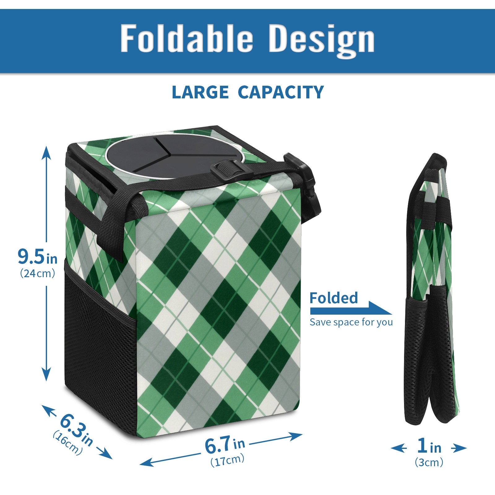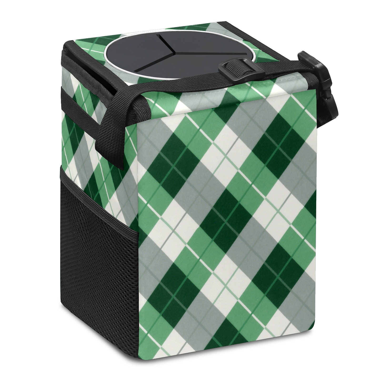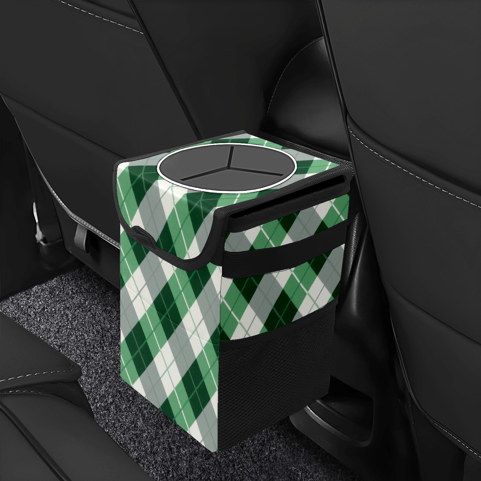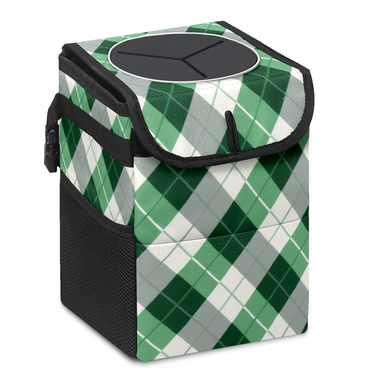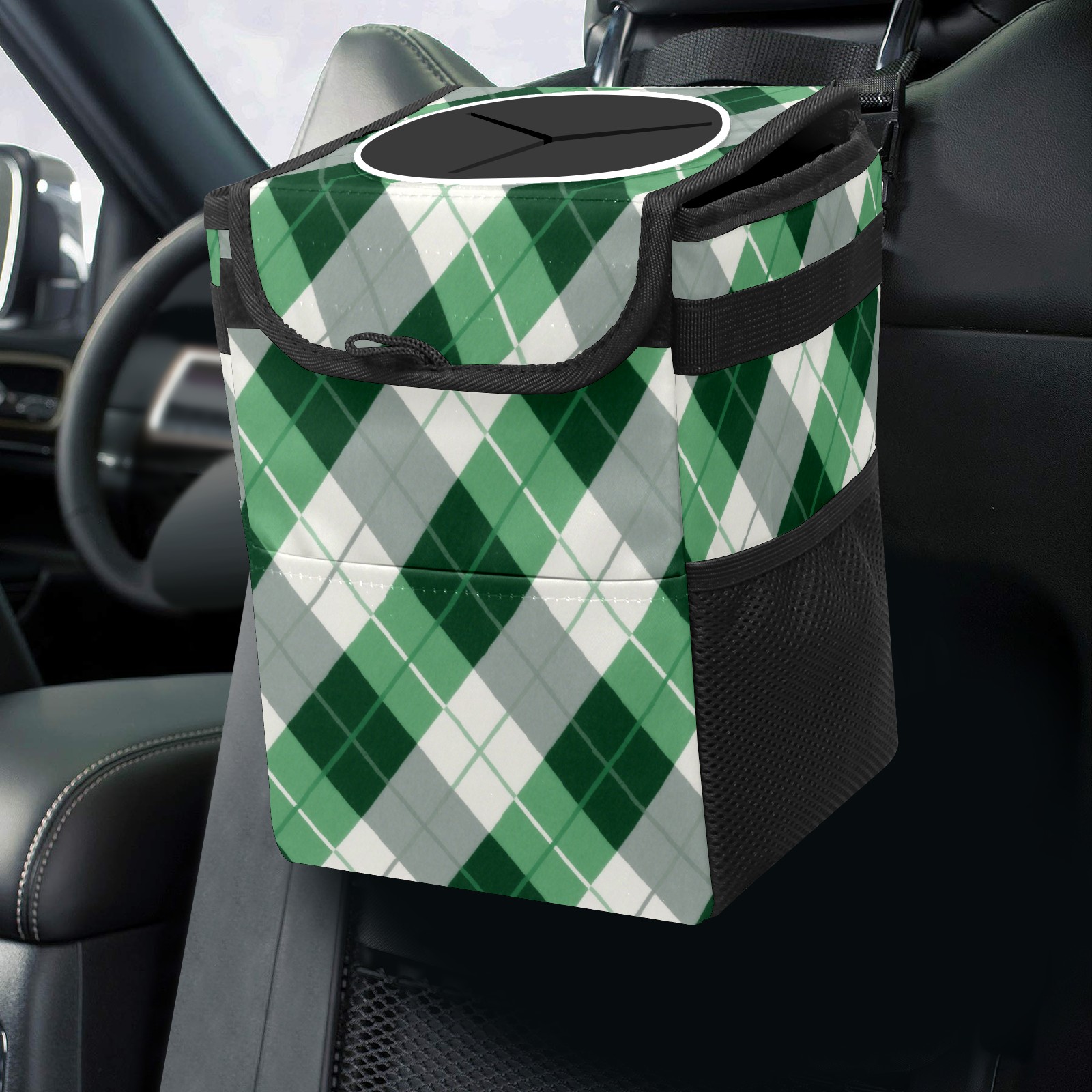 Car Trash Can with Lid, Small Portable Hanging Automotive Garbage Bin for Vehicles, Leakproof Waste Bag Container for SUV Truck Van Interior Auto Travel Road Trips(Green Checkered)
