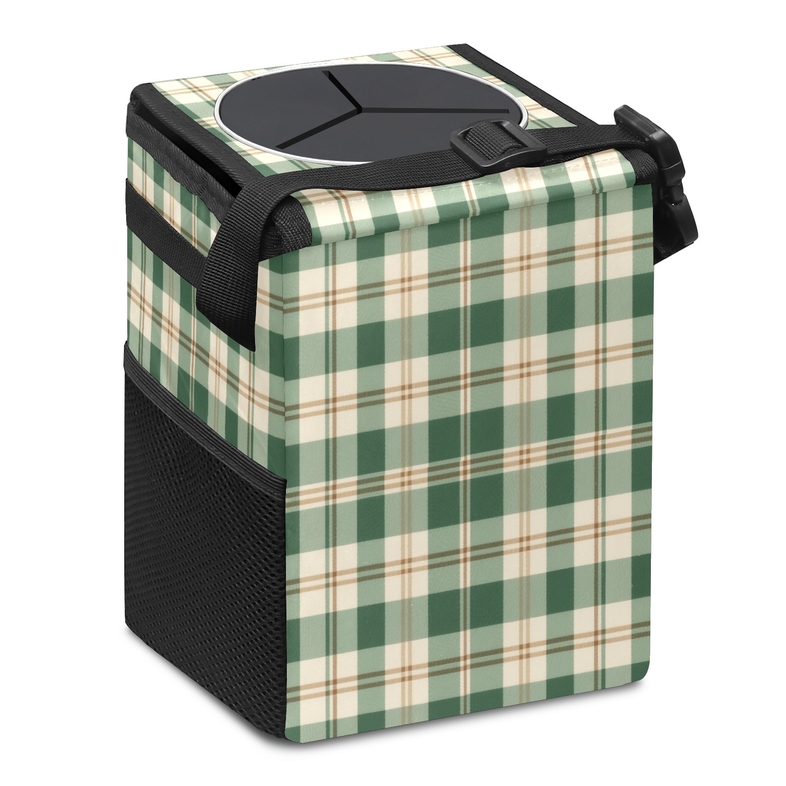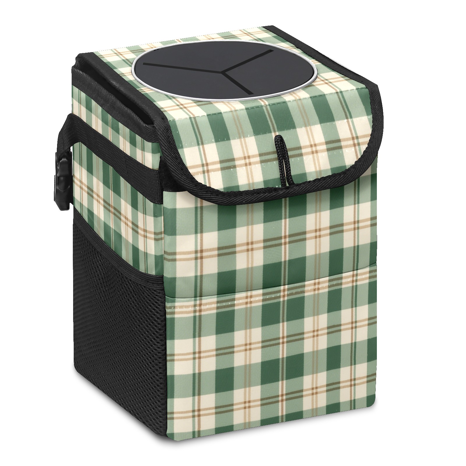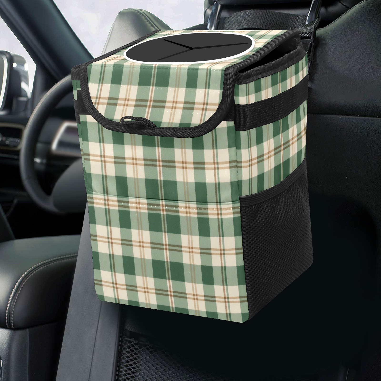 Car Trash Can with Lid, Small Portable Hanging Automotive Garbage Bin for Vehicles, Leakproof Waste Bag Container for SUV Truck Van Interior Auto Travel Road Trips(Green And White Checkered)