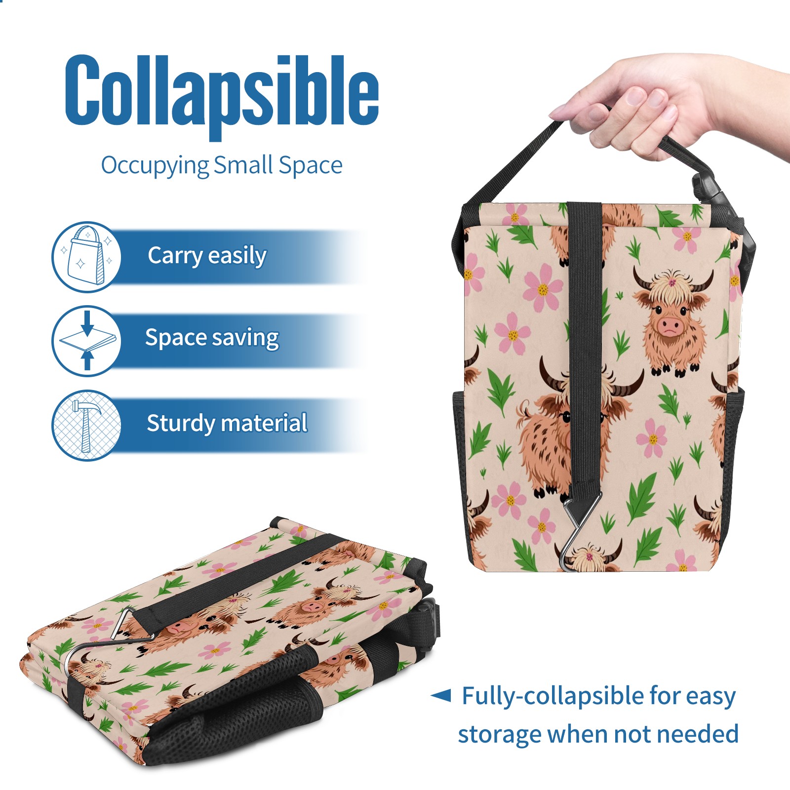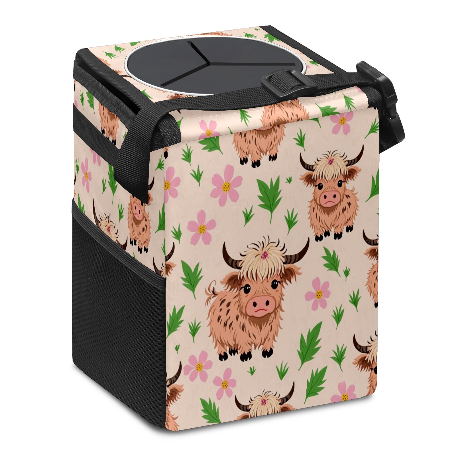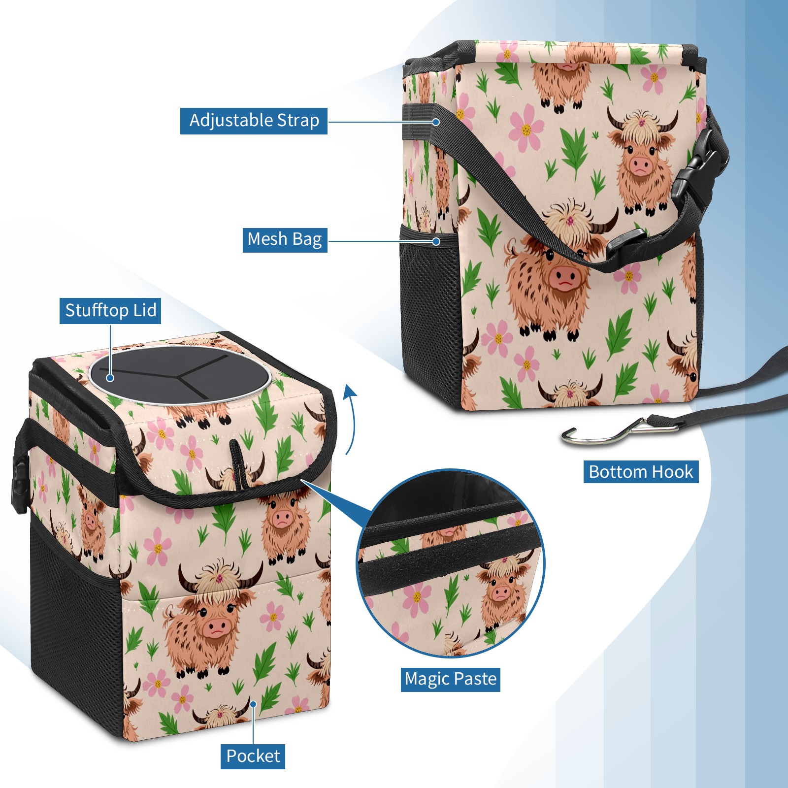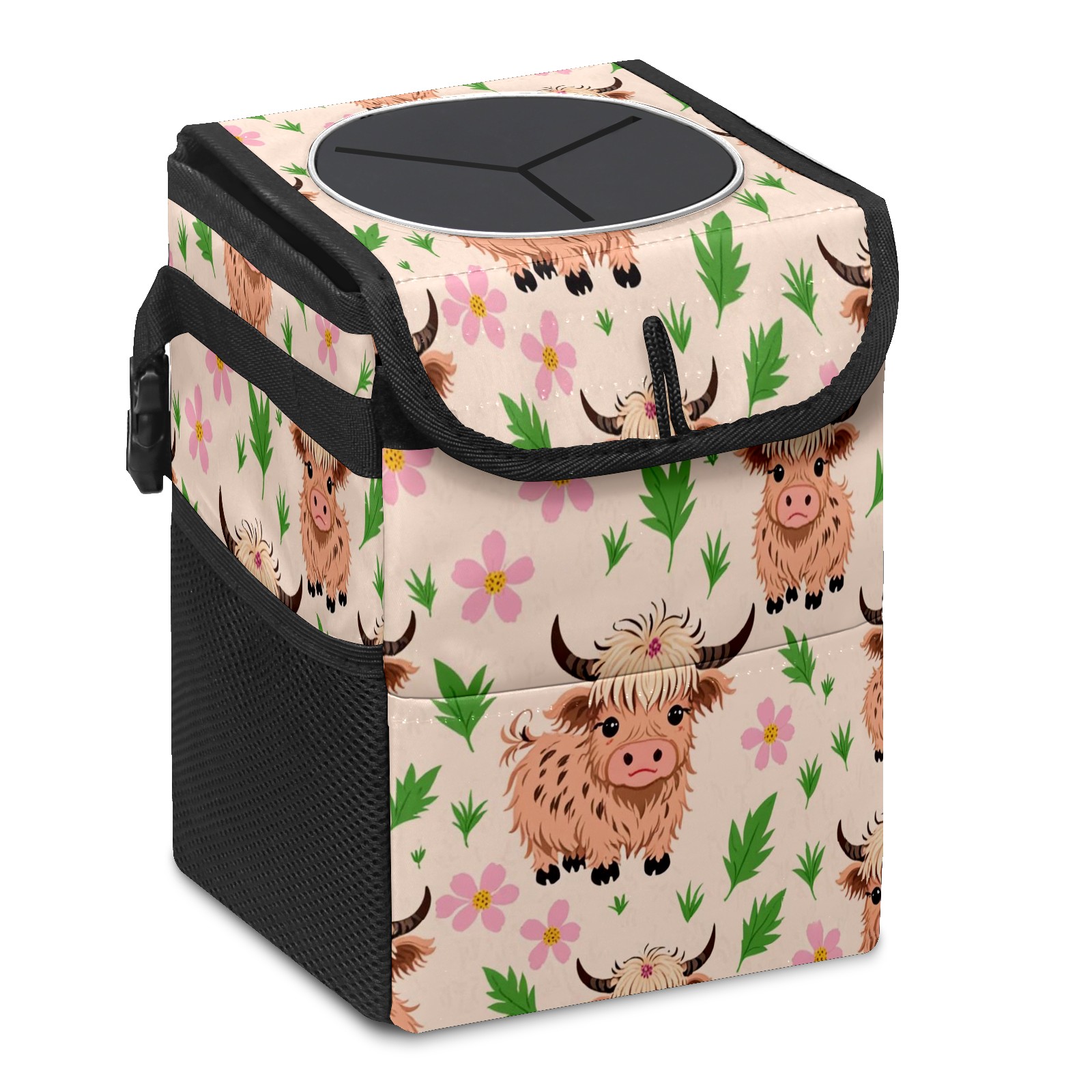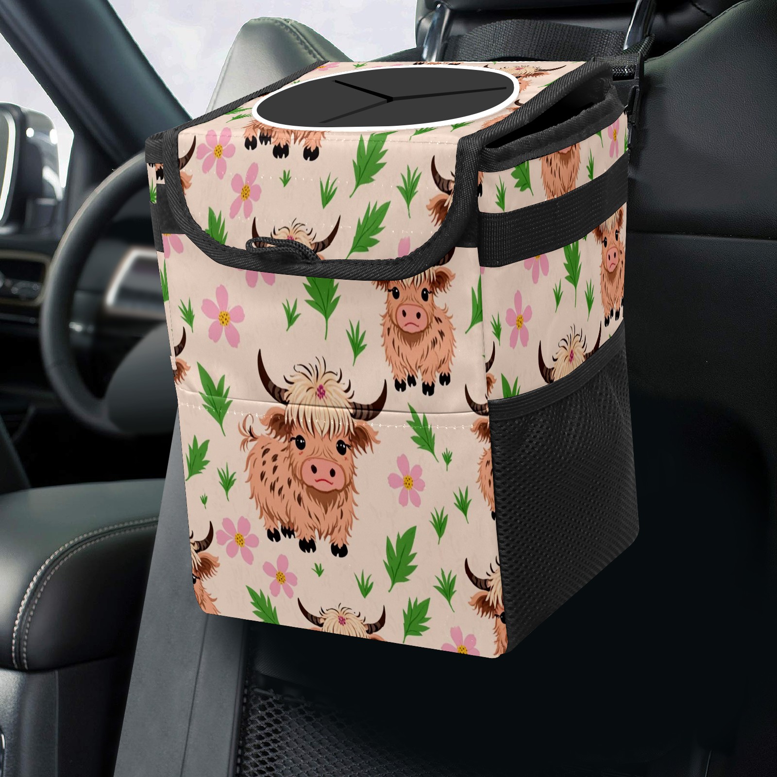 Car Trash Can with Lid, Small Portable Hanging Automotive Garbage Bin for Vehicles, Leakproof Waste Bag Container for SUV Truck Van Interior Auto Travel Road Trips(Highland Cattle)