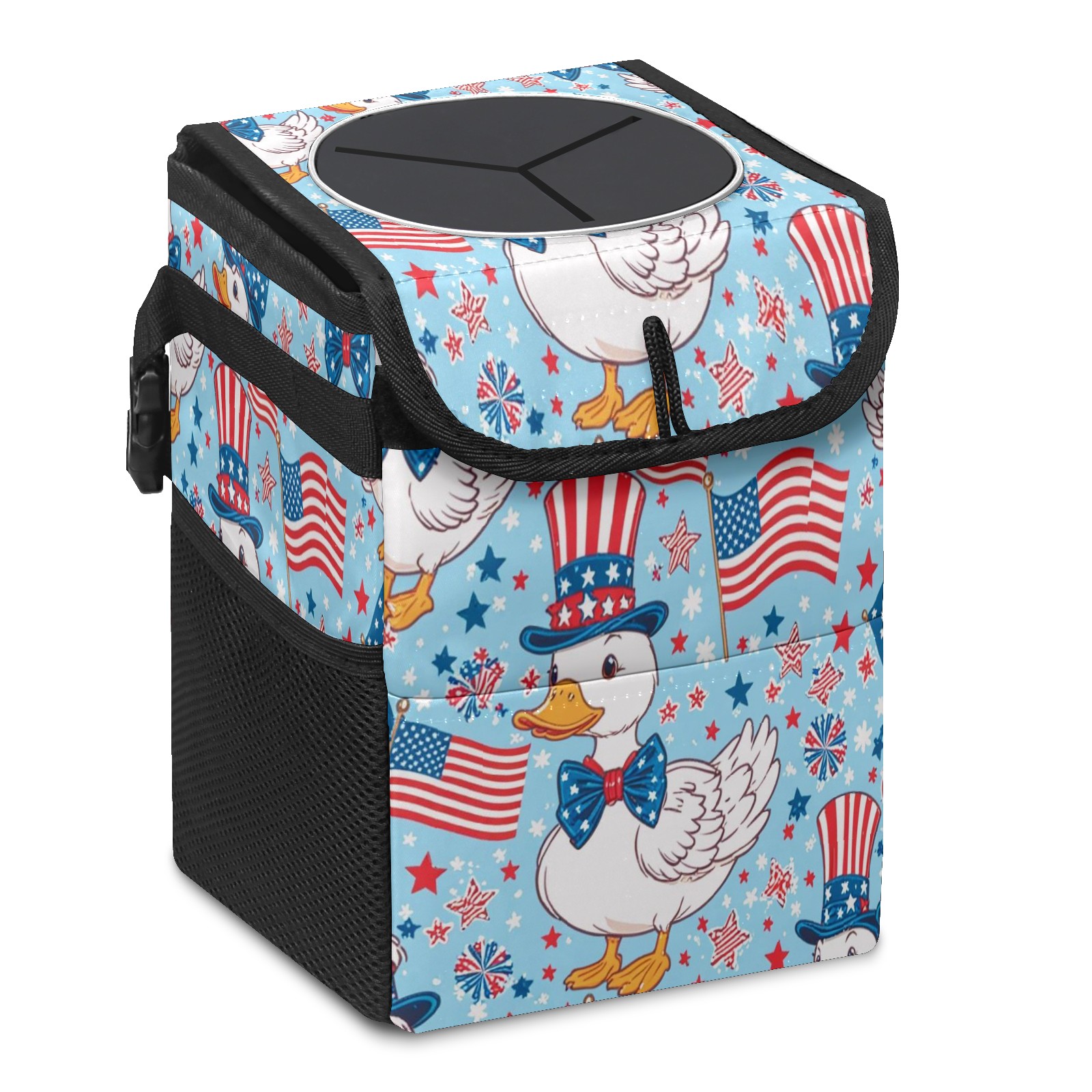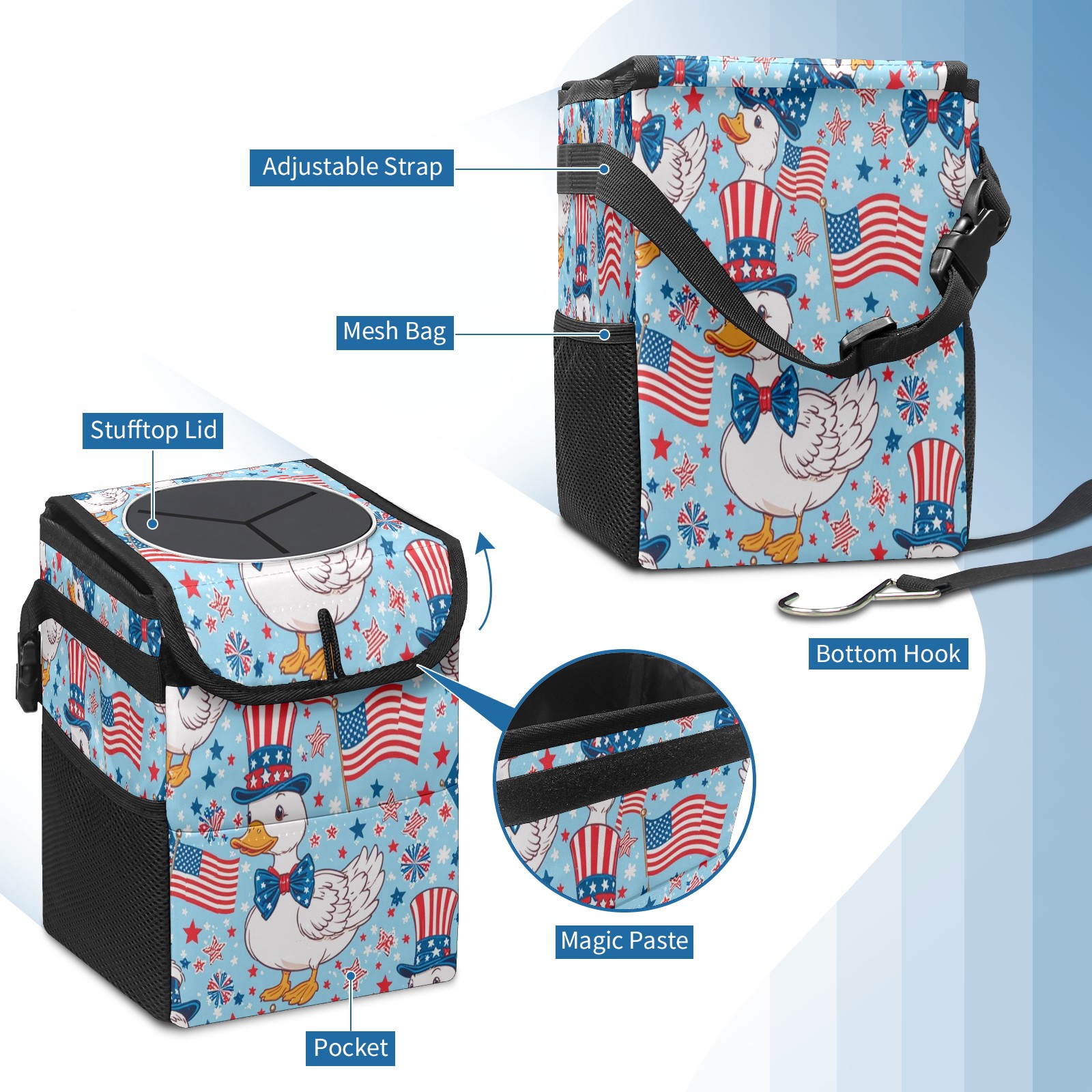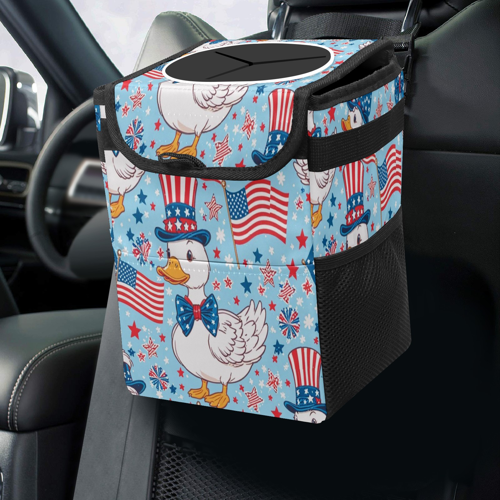 Car Trash Can with Lid, Small Portable Hanging Automotive Garbage Bin for Vehicles, Leakproof Waste Bag Container for SUV Truck Van Interior Auto Travel Road Trips(American Flag And Ducks)