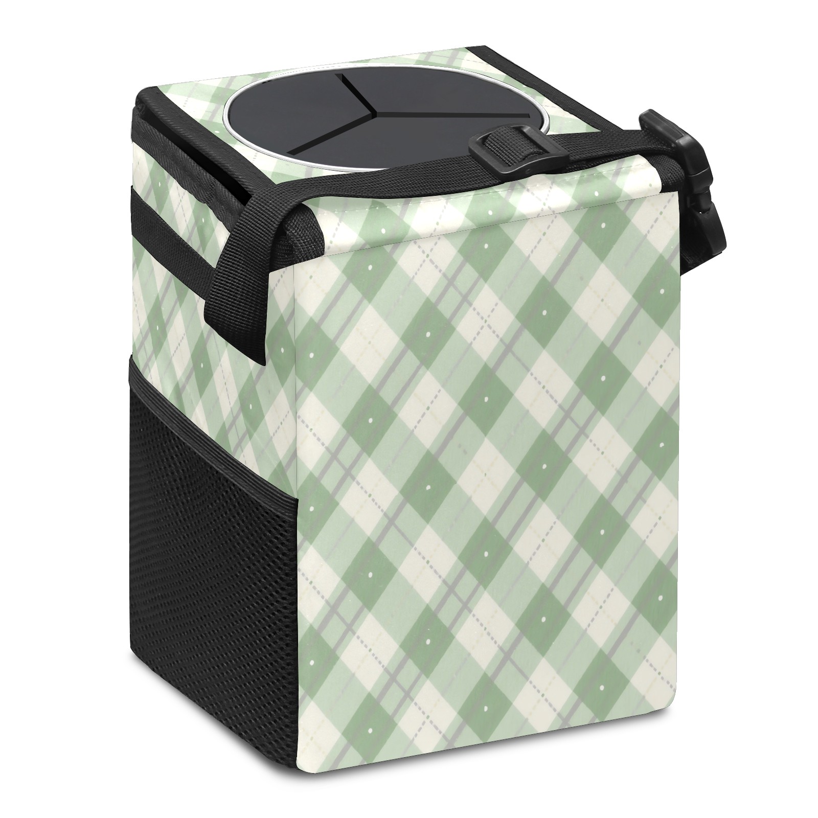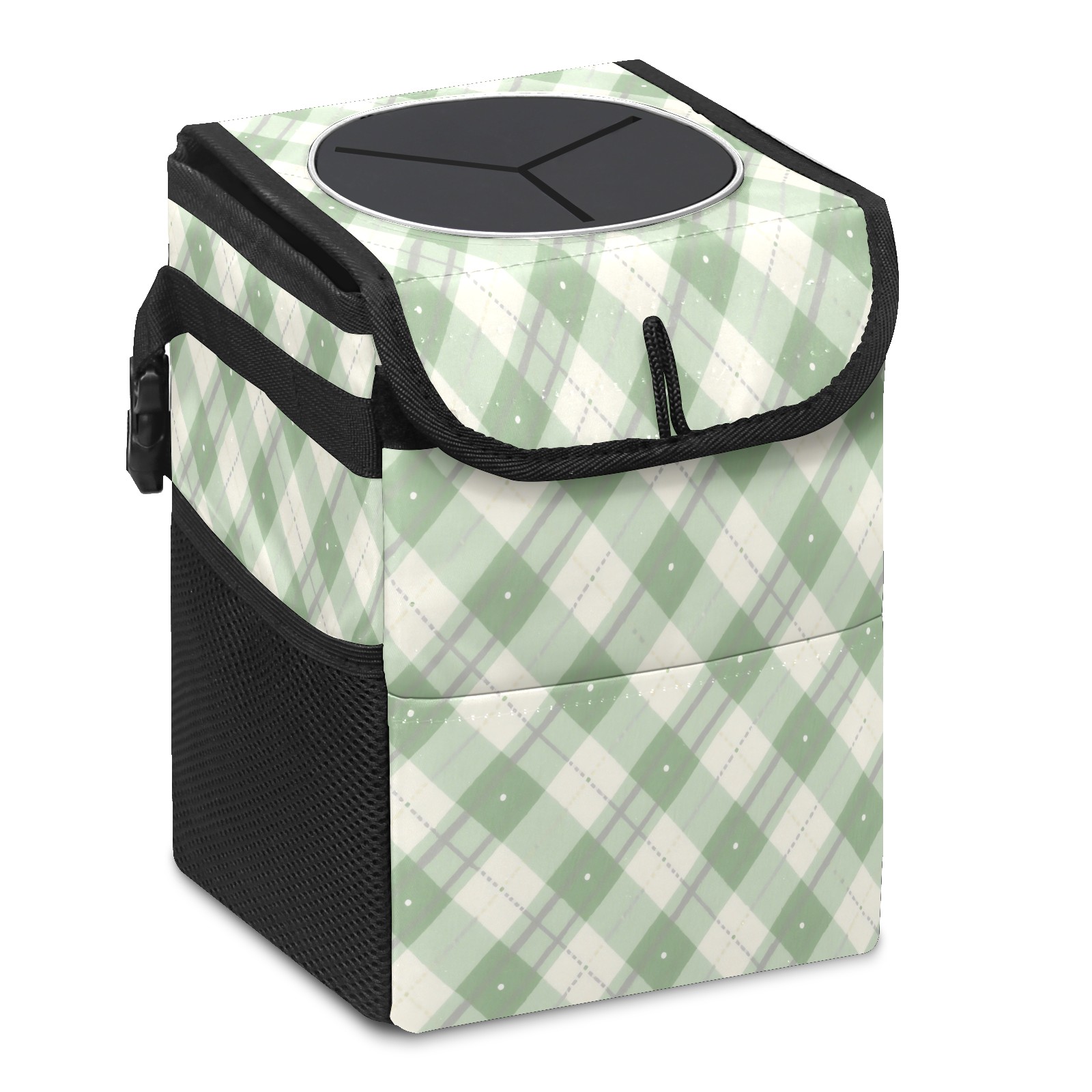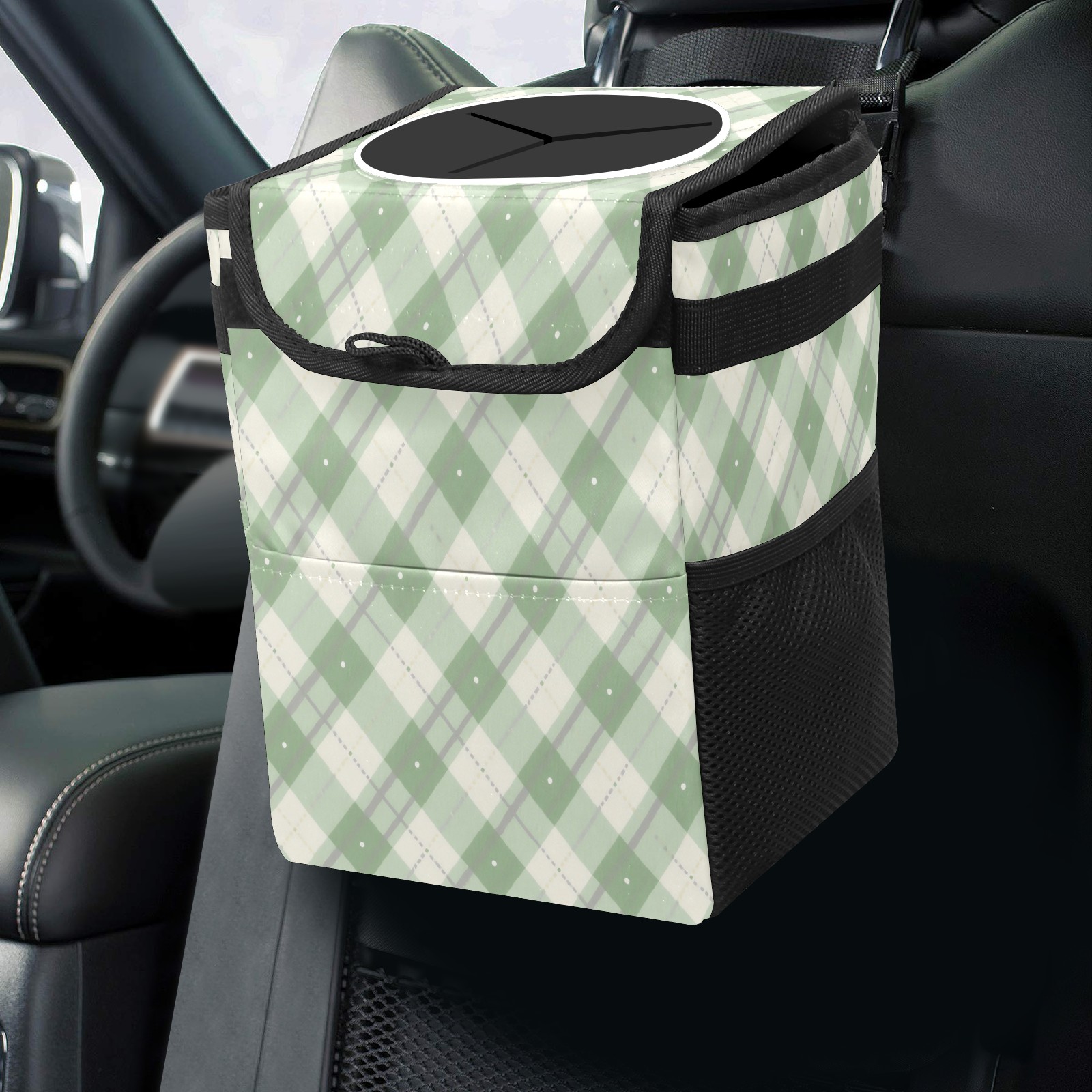 Car Trash Can with Lid, Small Portable Hanging Automotive Garbage Bin for Vehicles, Leakproof Waste Bag Container for SUV Truck Van Interior Auto Travel Road Trips(White Green Checkered)