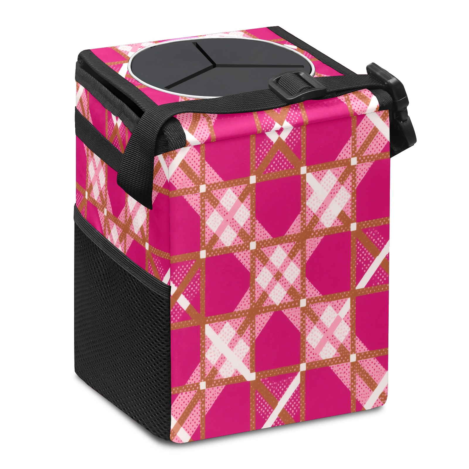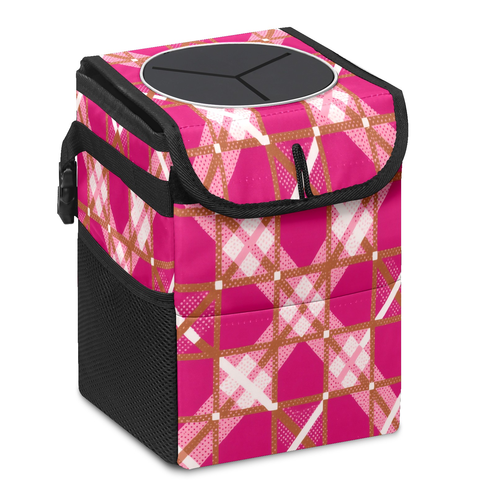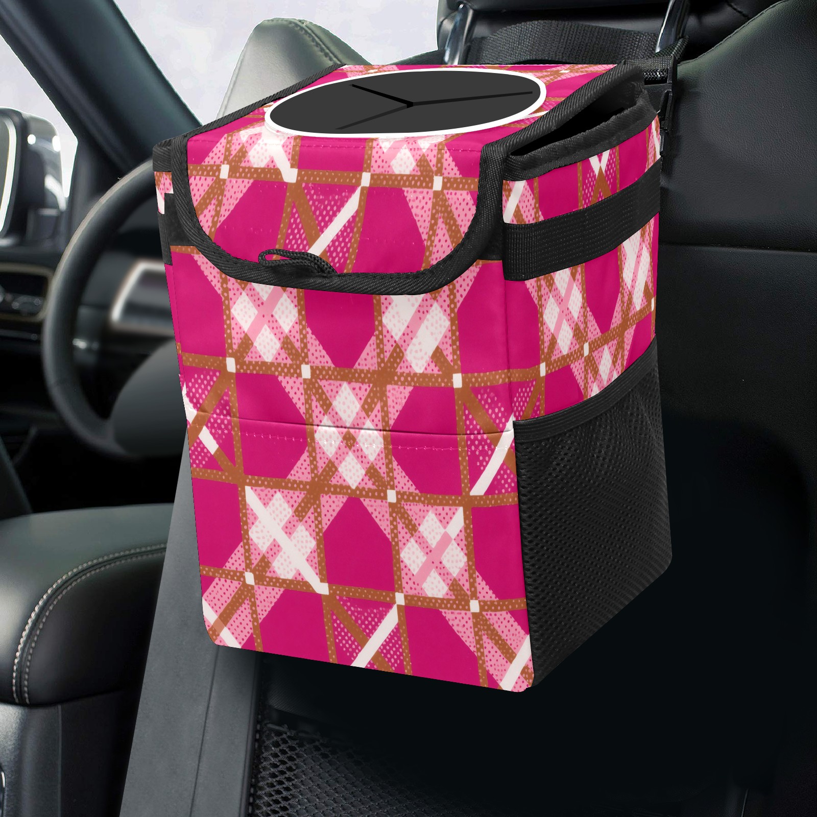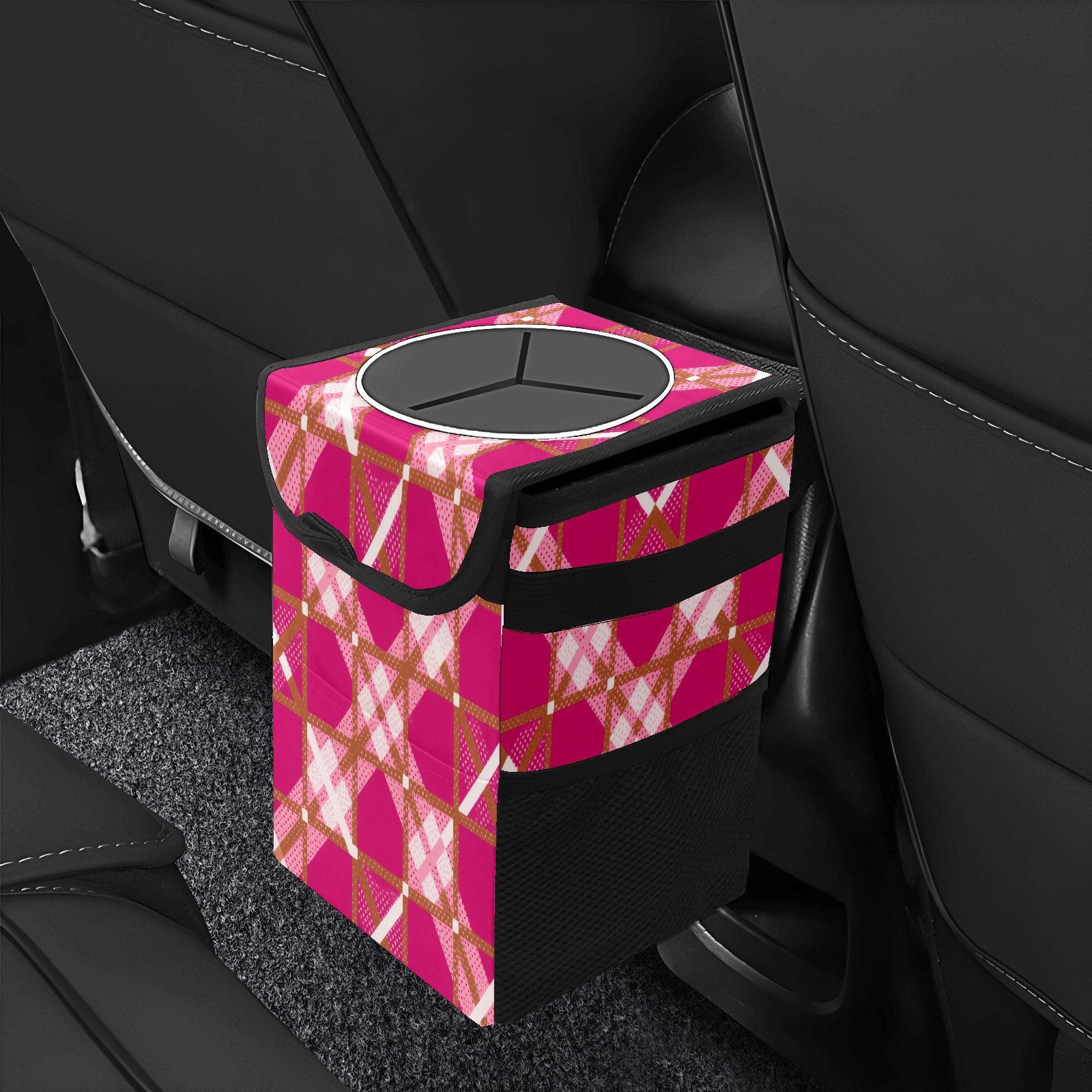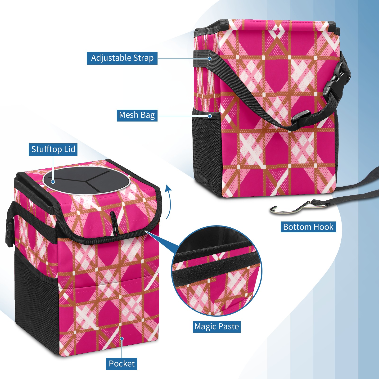 Car Trash Can with Lid, Small Portable Hanging Automotive Garbage Bin for Vehicles, Leakproof Waste Bag Container for SUV Truck Van Interior Auto Travel Road Trips(Rose Red Checkered)