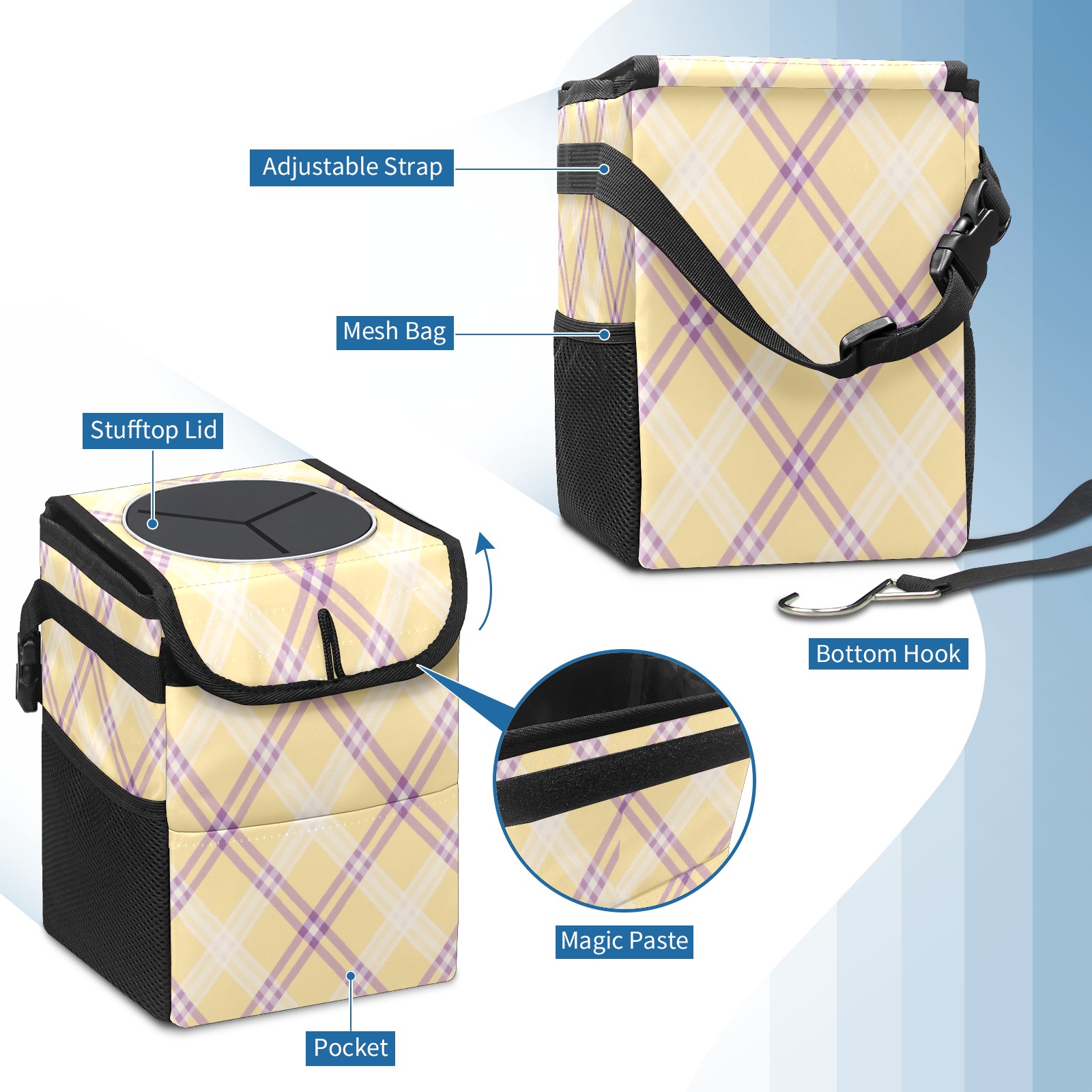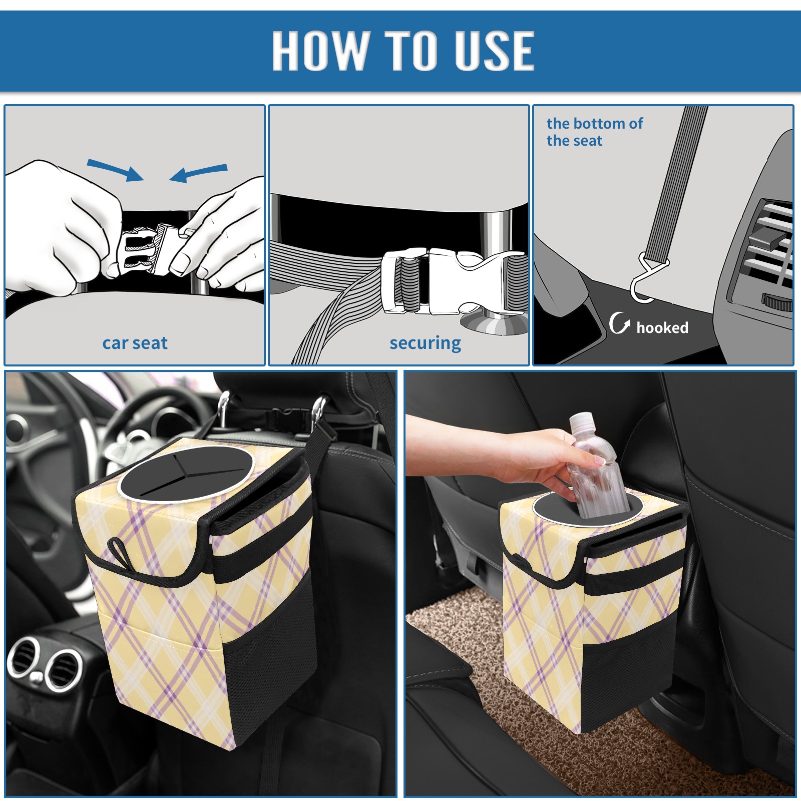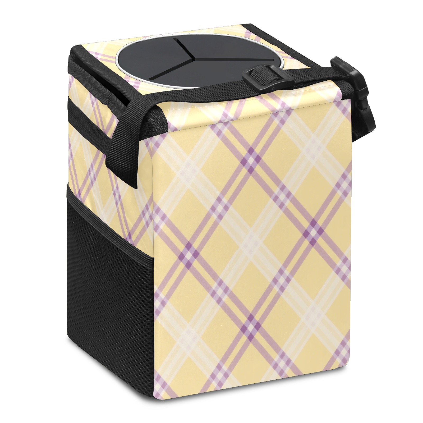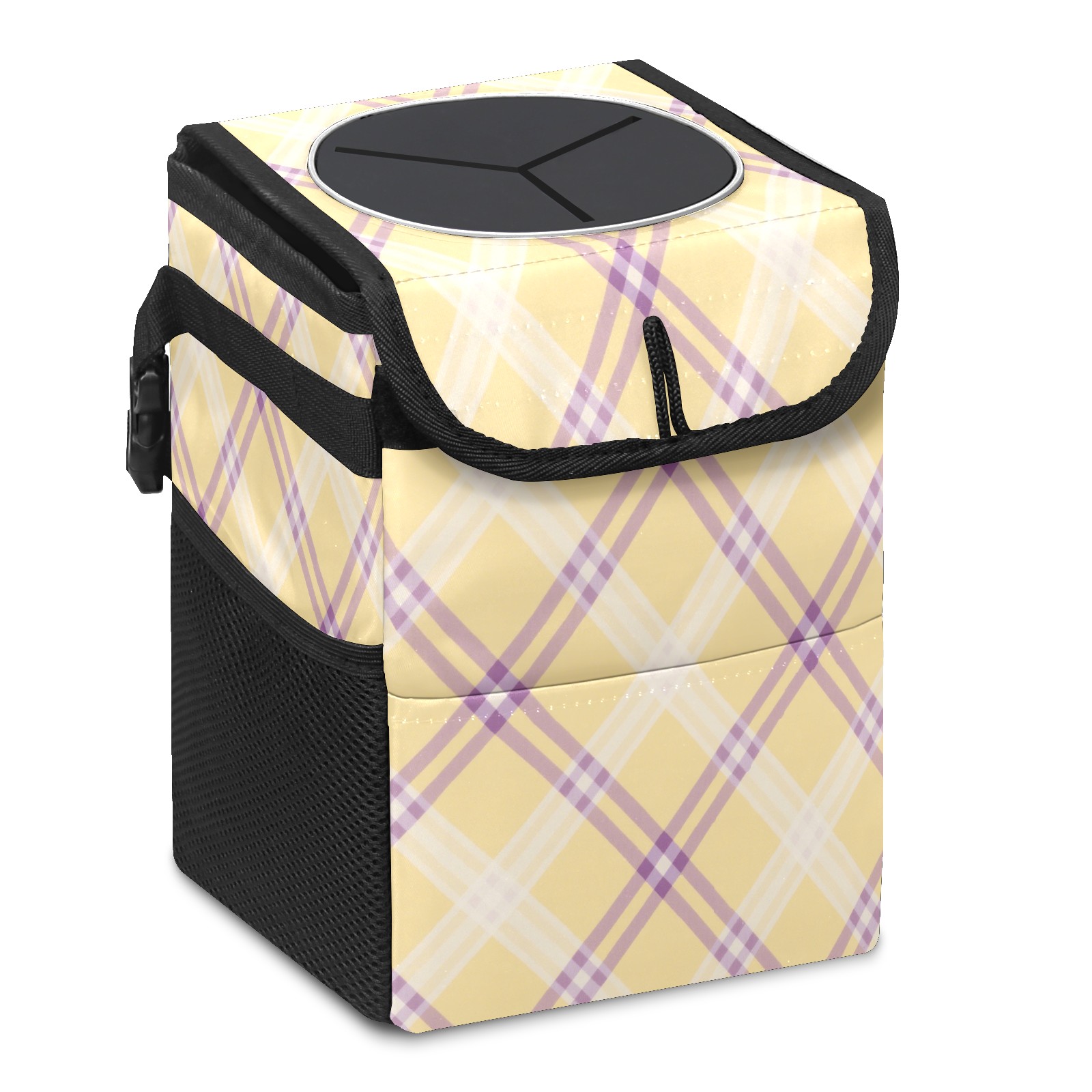 Car Trash Can with Lid, Small Portable Hanging Automotive Garbage Bin for Vehicles, Leakproof Waste Bag Container for SUV Truck Van Interior Auto Travel Road Trips(Yellow Purple Checkered)