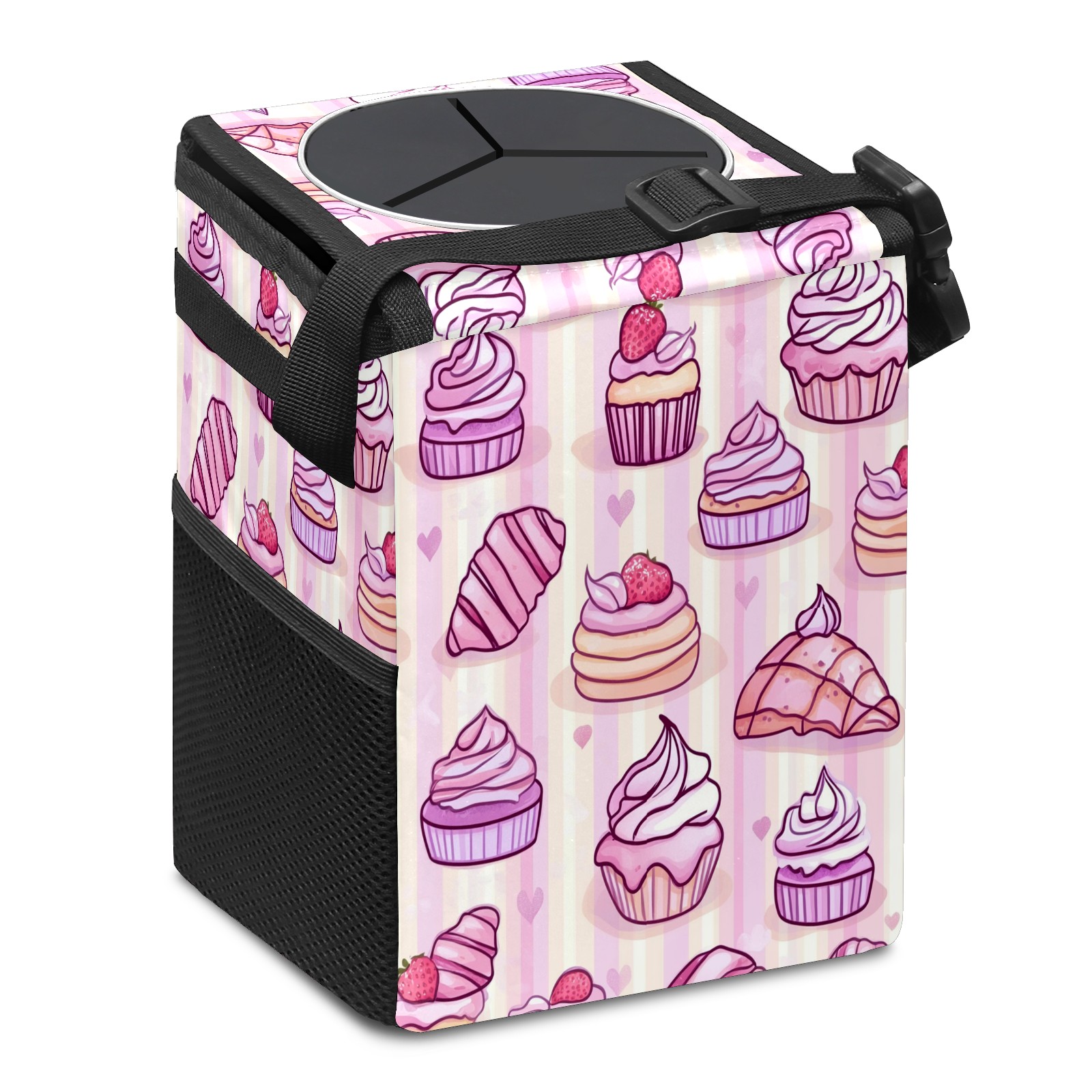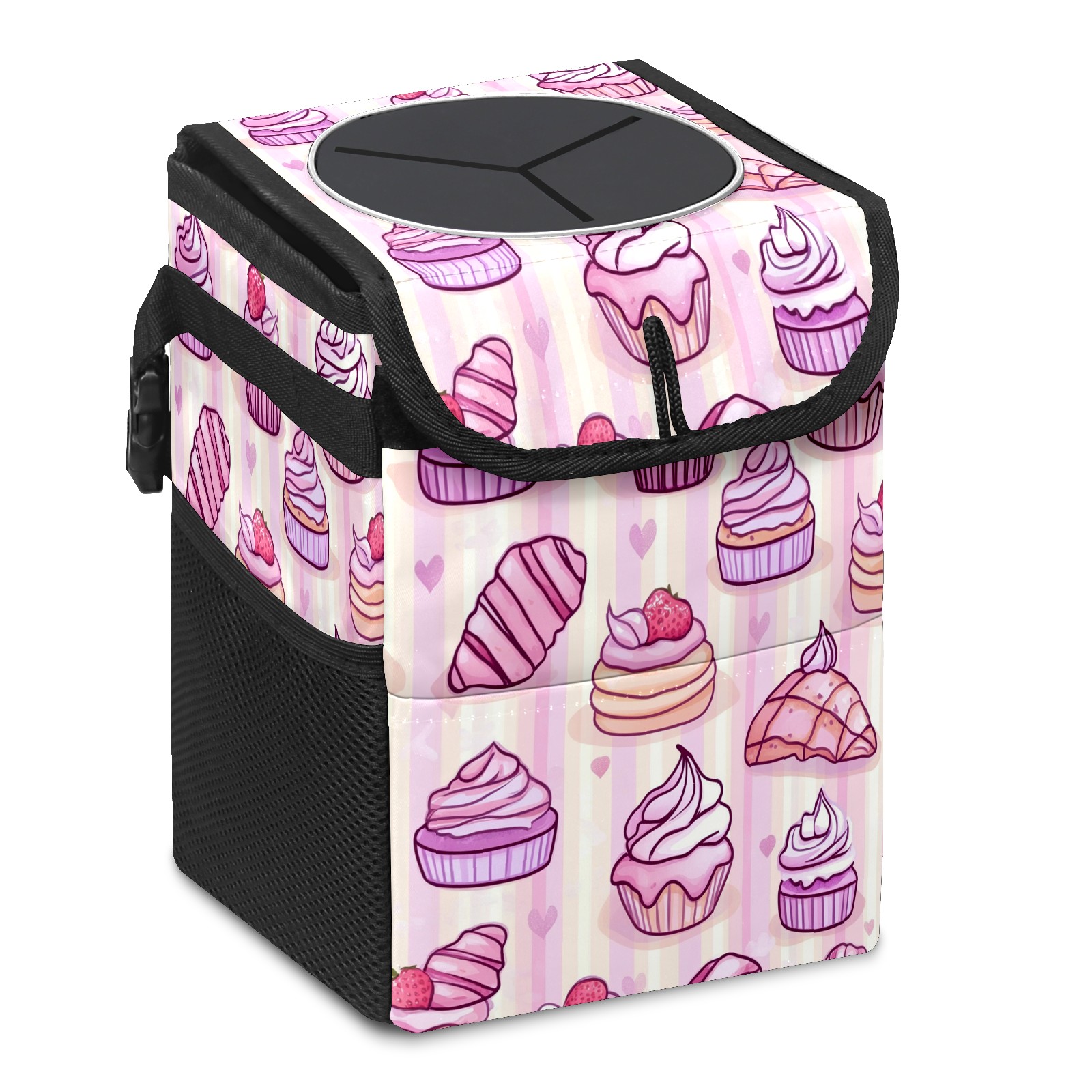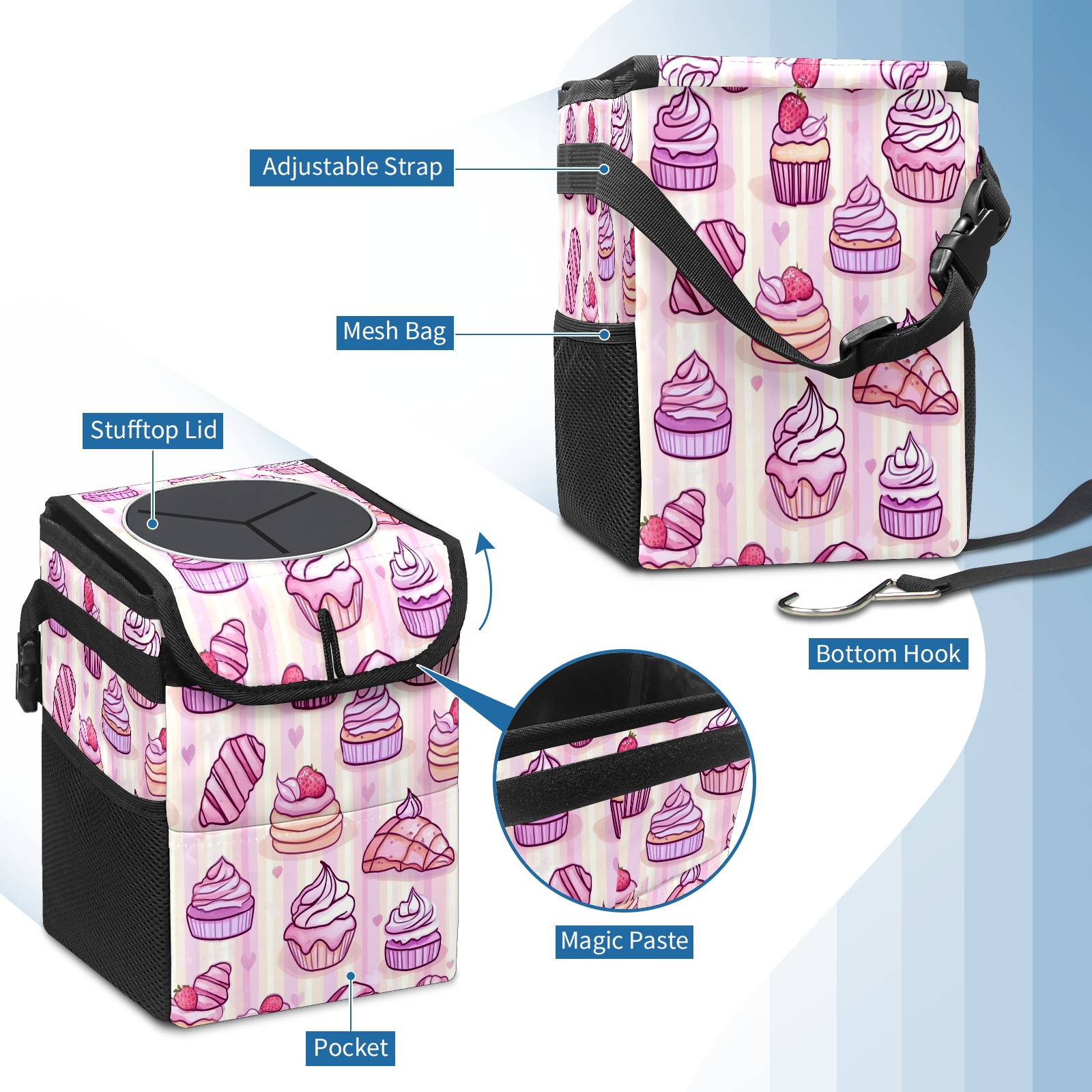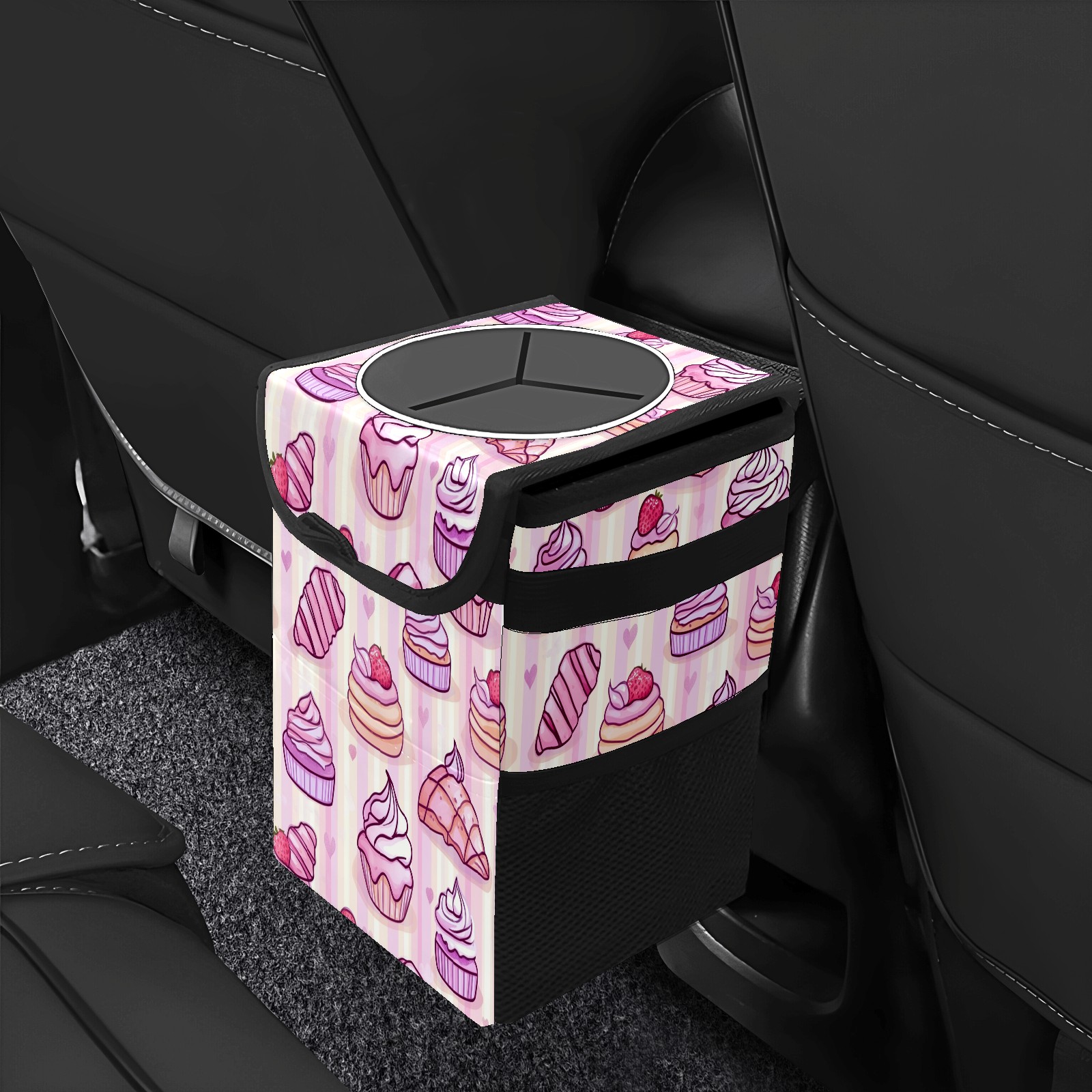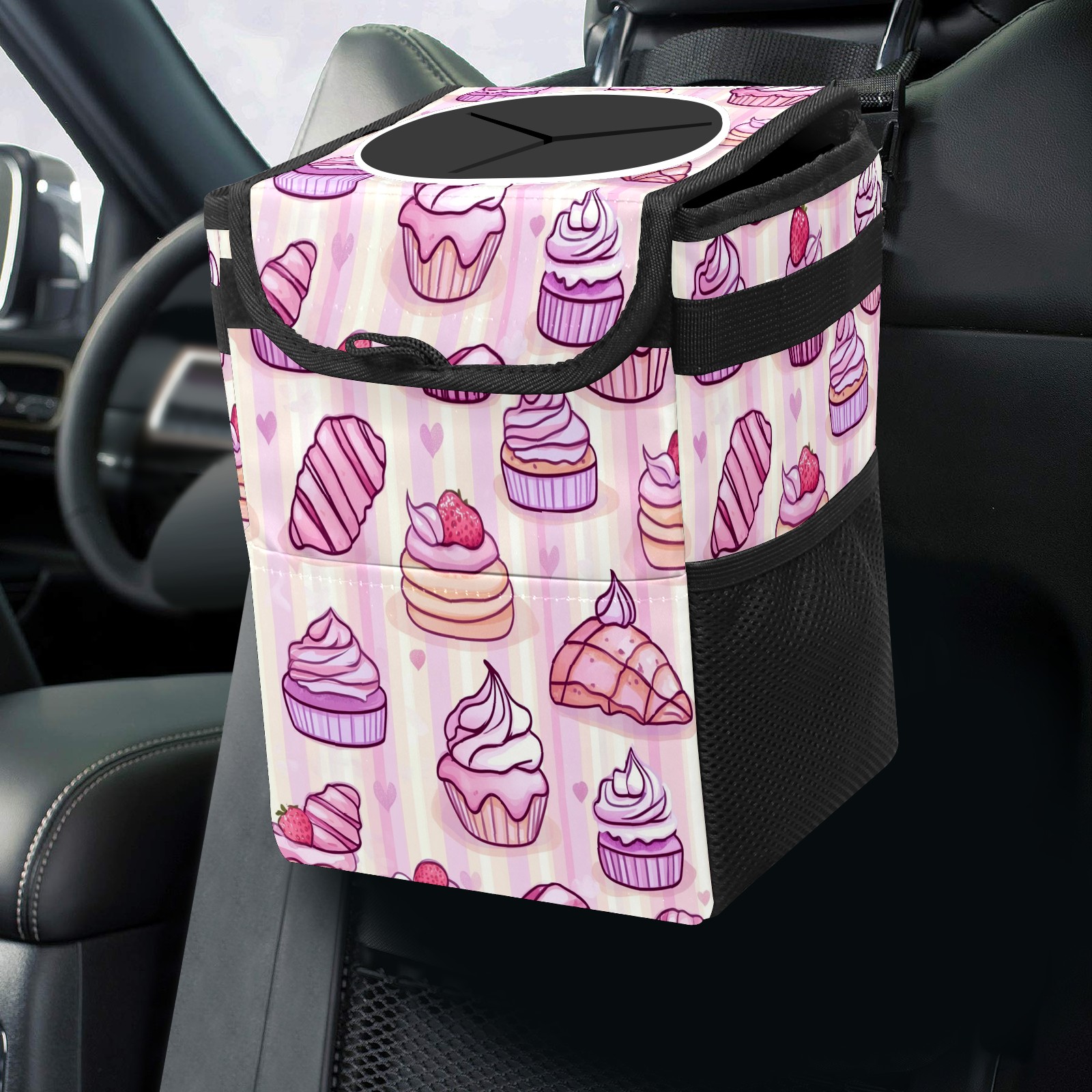 Car Trash Can with Lid, Small Portable Hanging Automotive Garbage Bin for Vehicles, Leakproof Waste Bag Container for SUV Truck Van Interior Auto Travel Road Trips(Pink And Lavender Cakes)