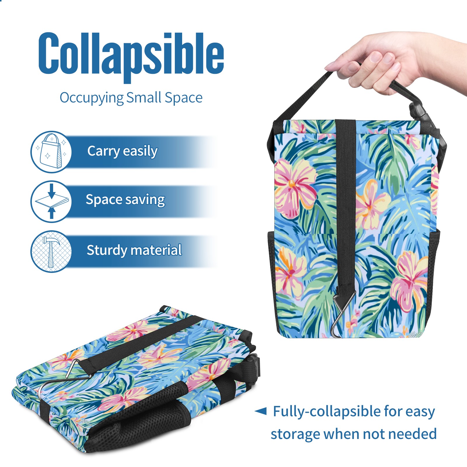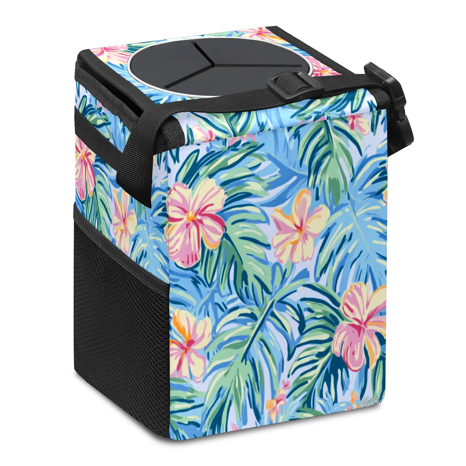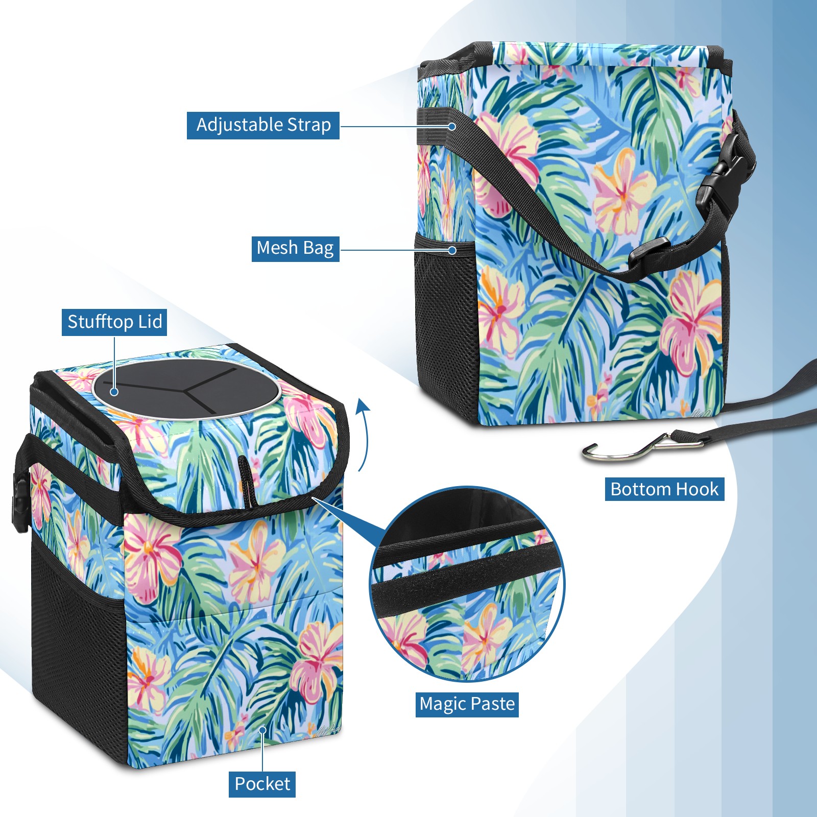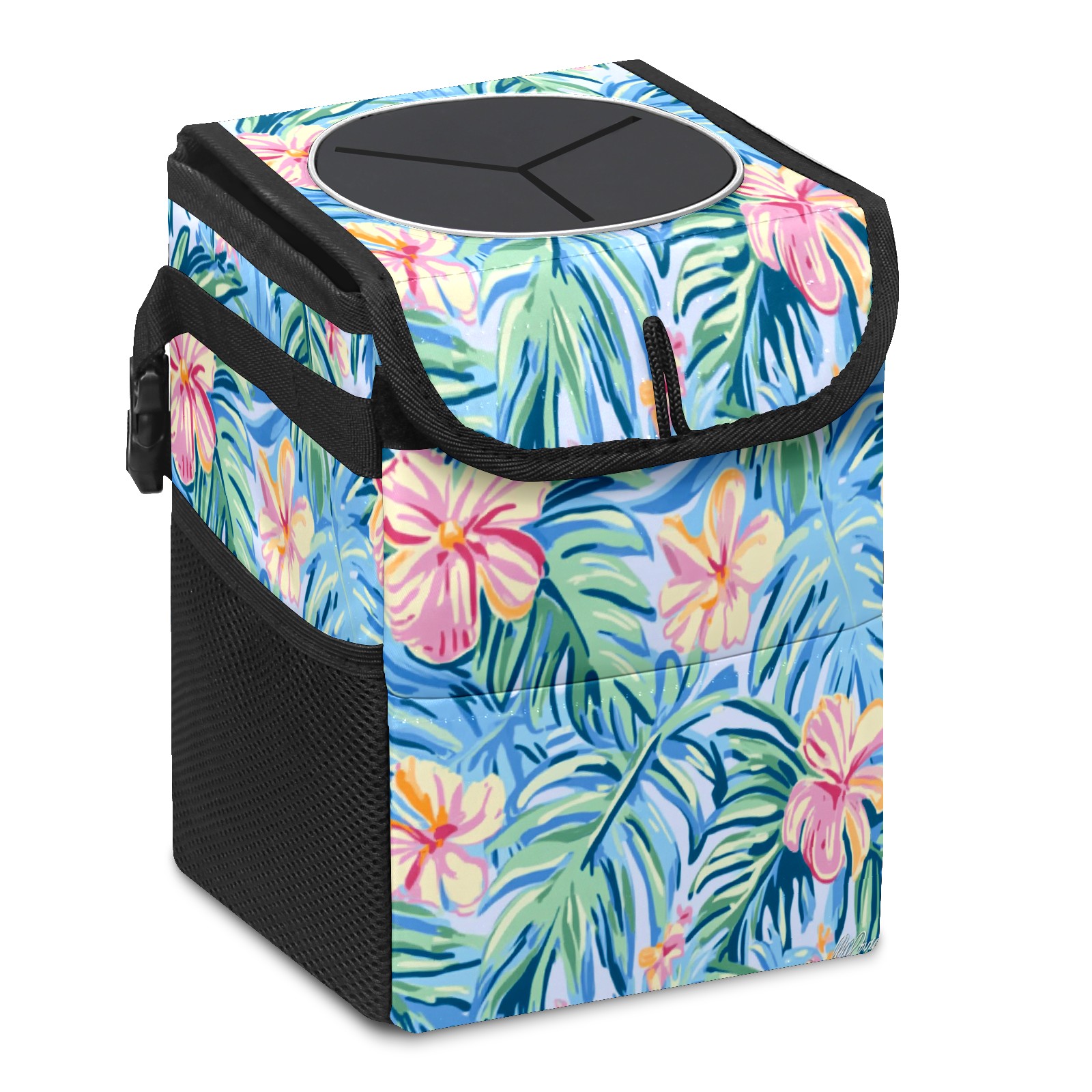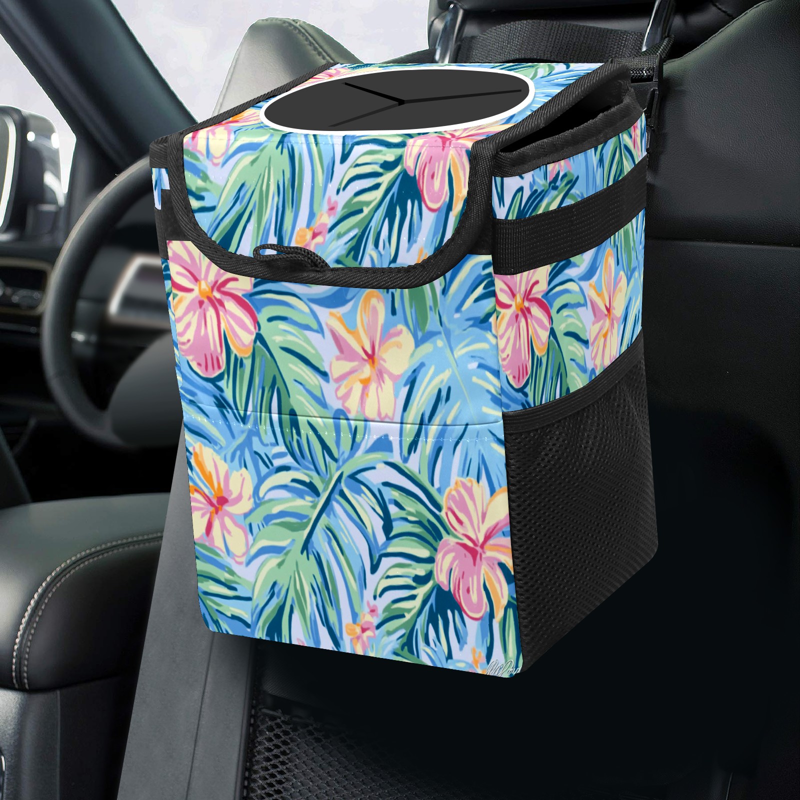 Car Trash Can with Lid, Small Portable Hanging Automotive Garbage Bin for Vehicles, Leakproof Waste Bag Container for SUV Truck Van Interior Auto Travel Road Trips(Palm Leaves And Flowers)