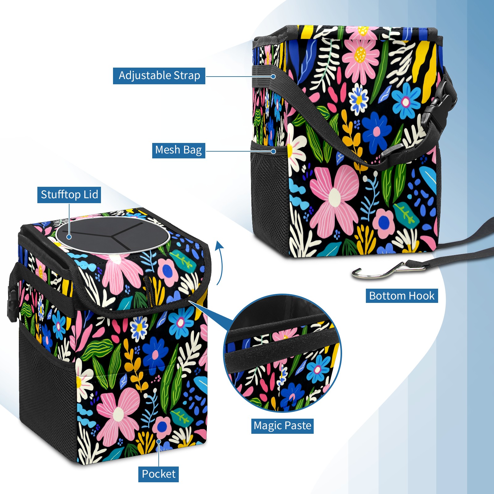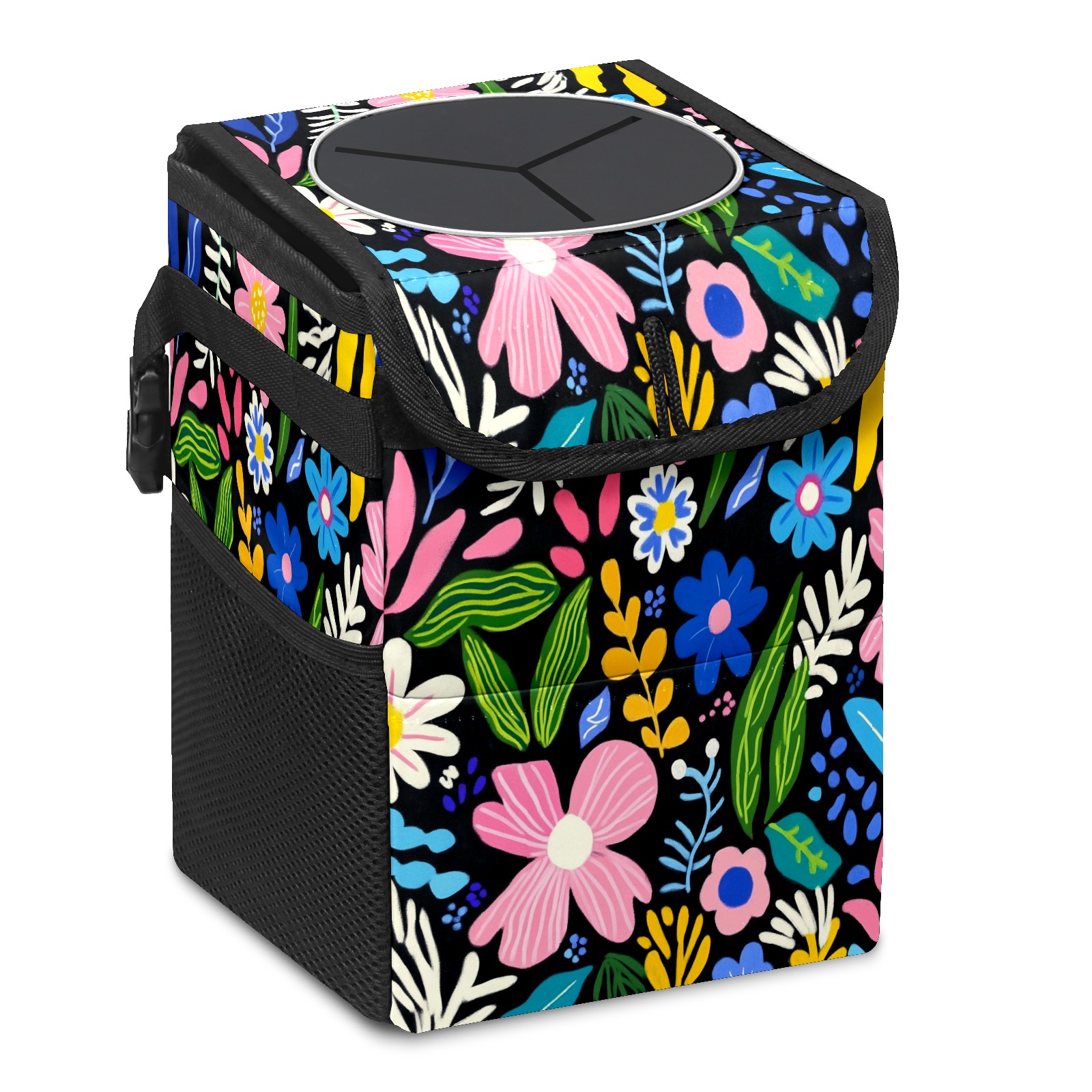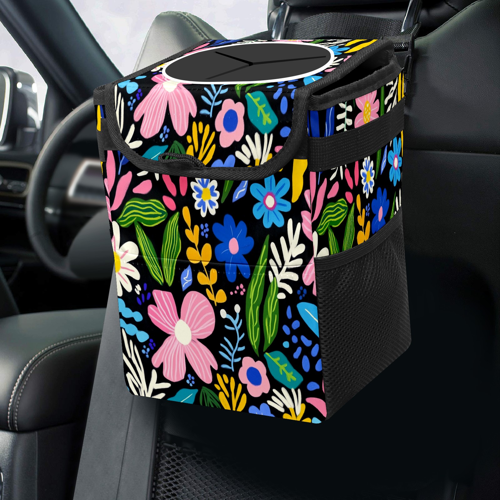 Car Trash Can with Lid, Small Portable Hanging Automotive Garbage Bin for Vehicles, Leakproof Waste Bag Container for SUV Truck Van Interior Auto Travel Road Trips(Various Flowers)