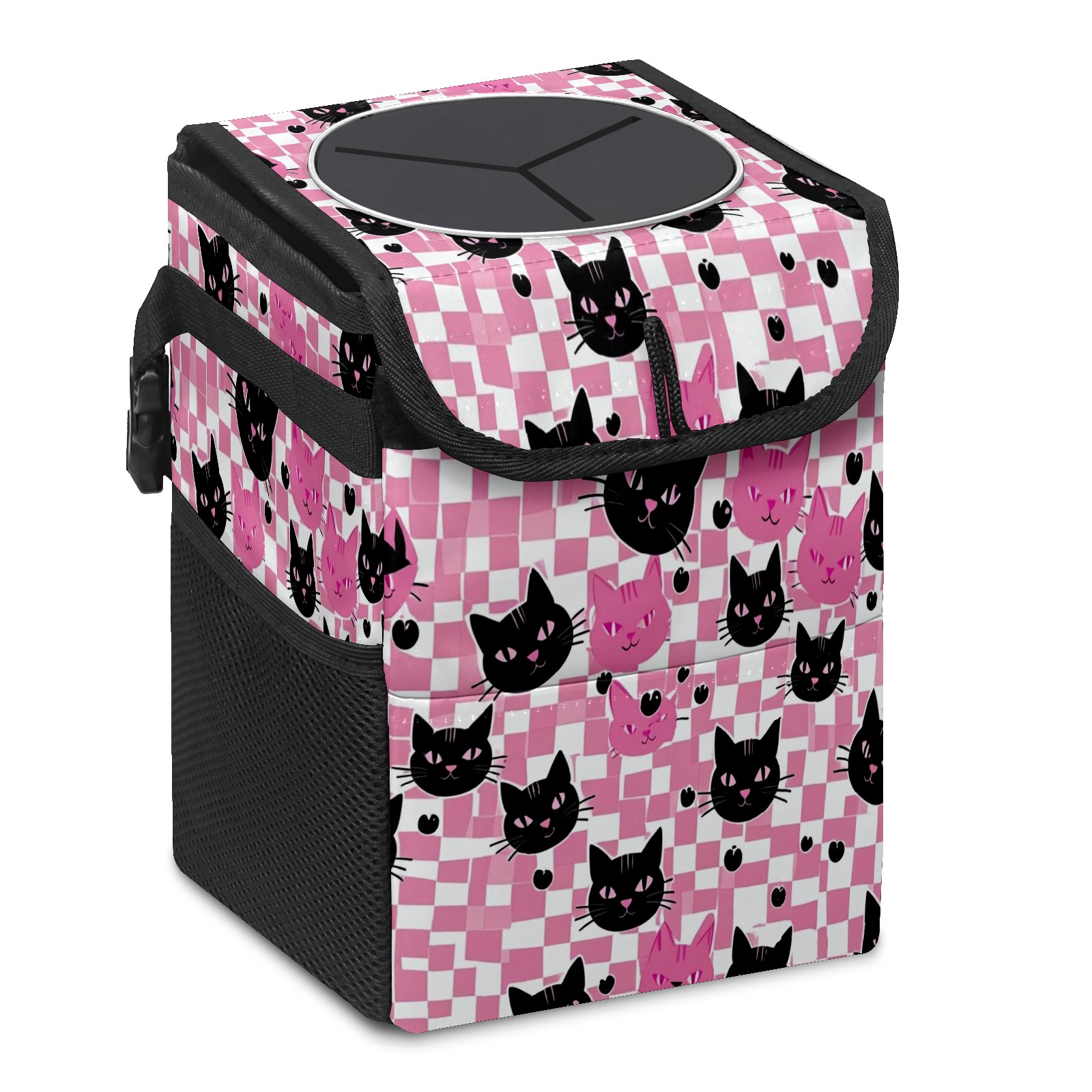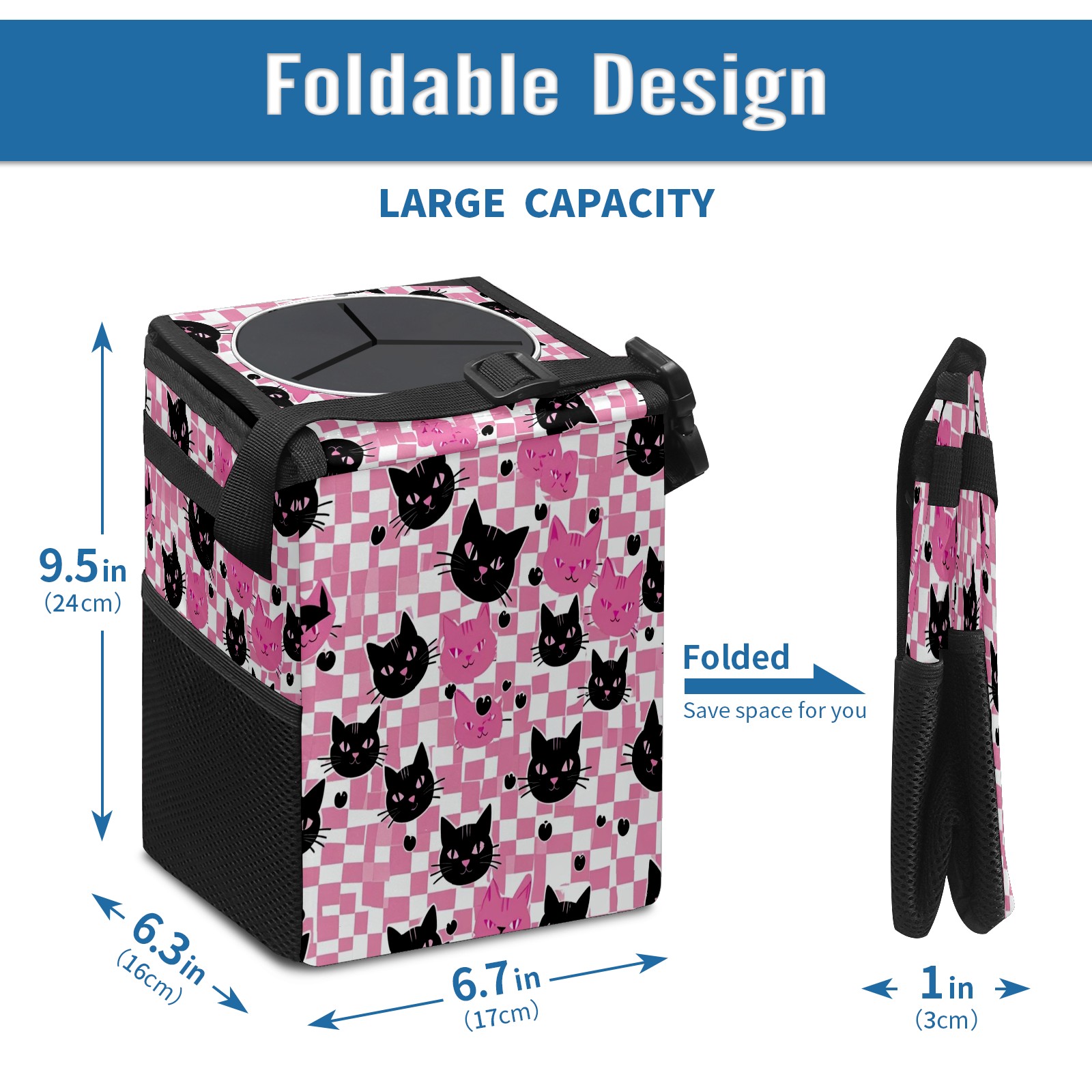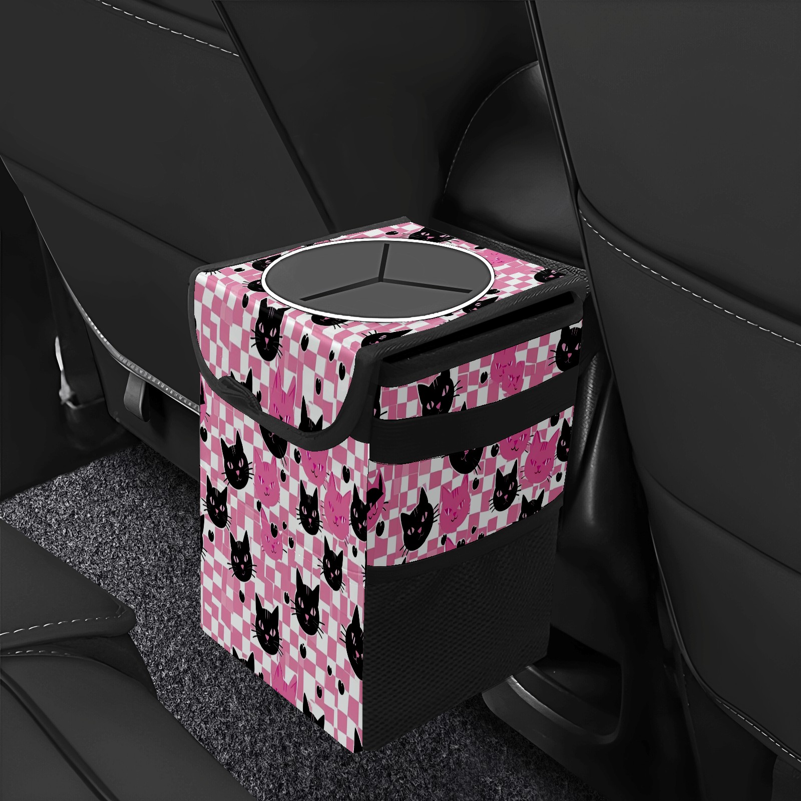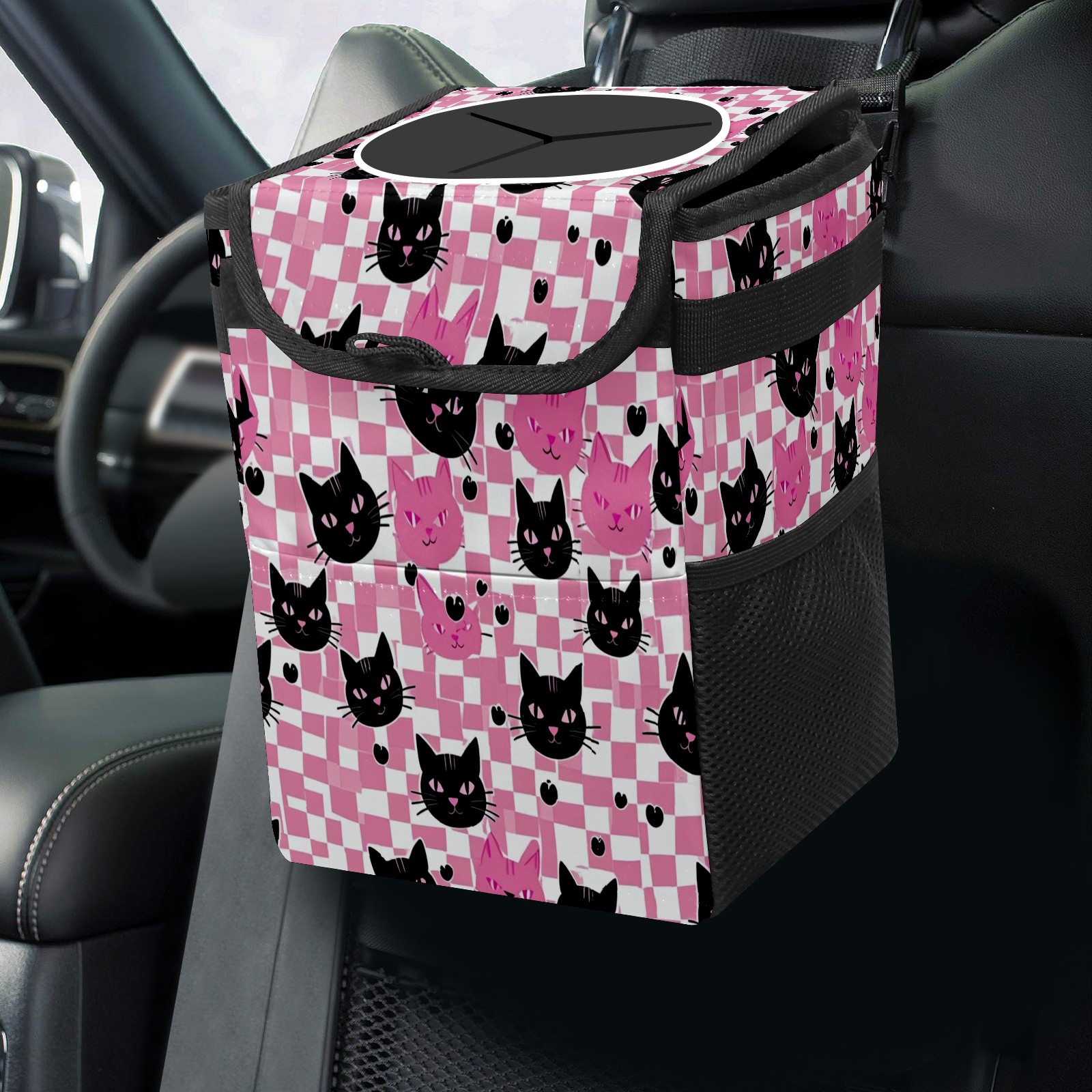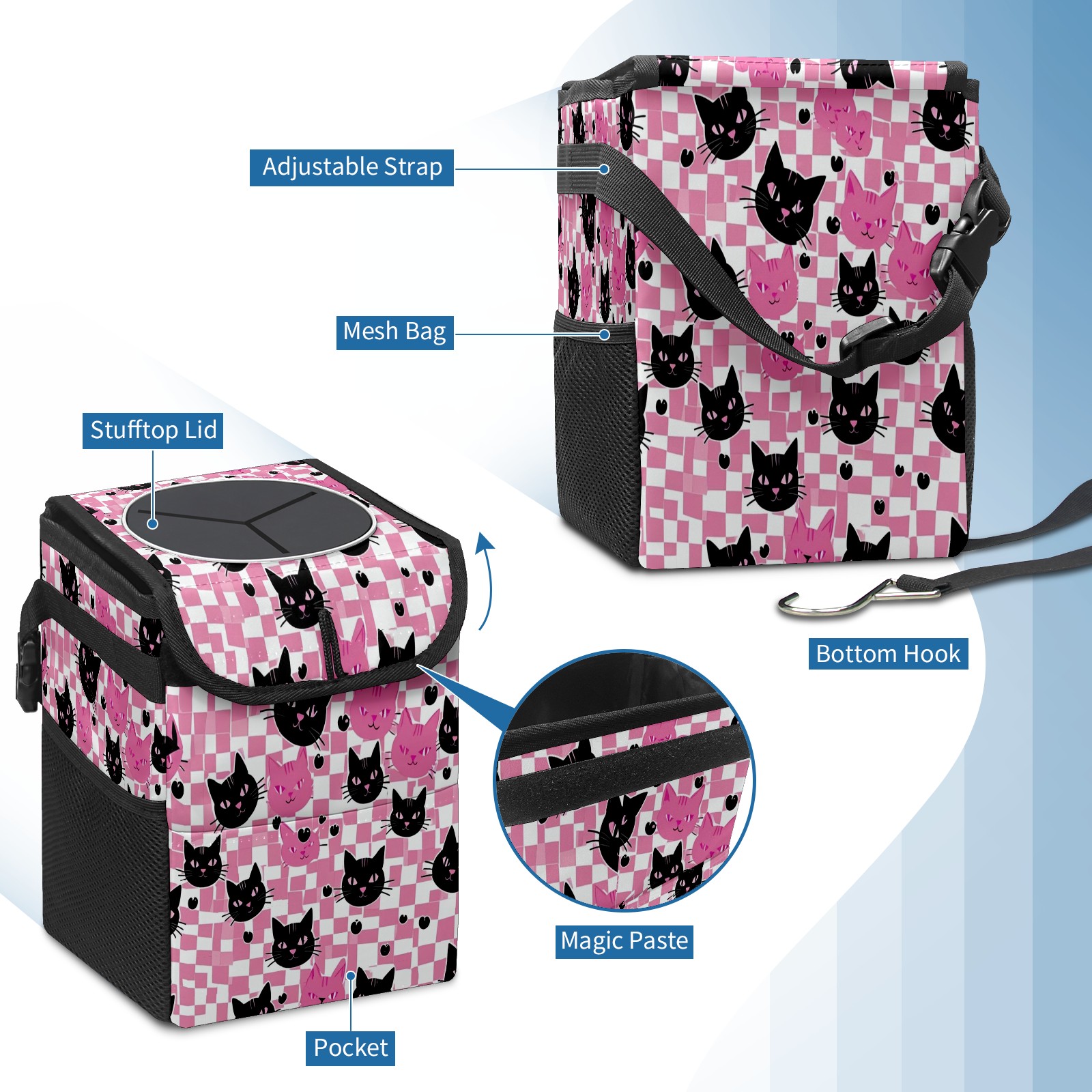 Car Trash Can with Lid, Small Portable Hanging Automotive Garbage Bin for Vehicles, Leakproof Waste Bag Container for SUV Truck Van Interior Auto Travel Road Trips(Pink Black Cat)