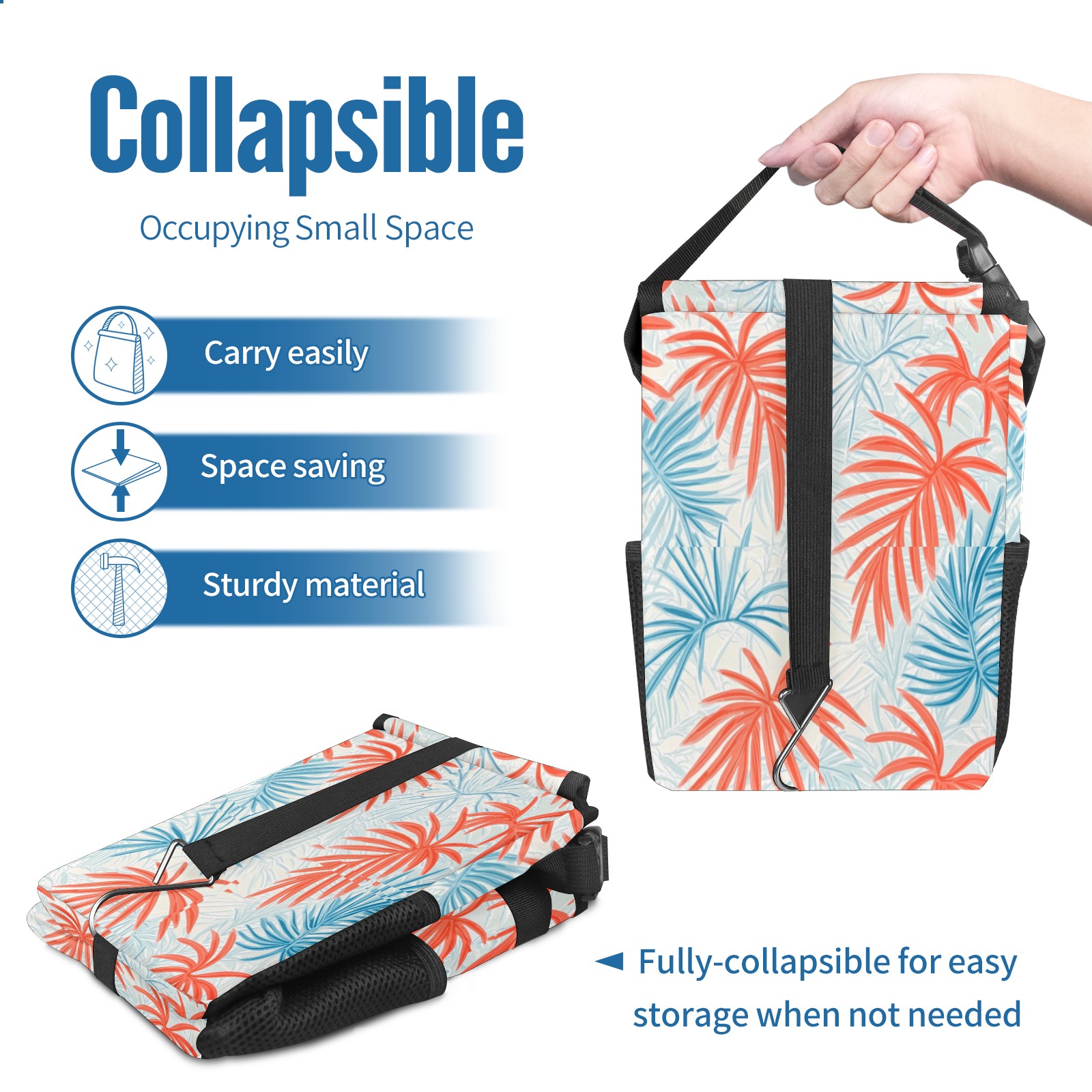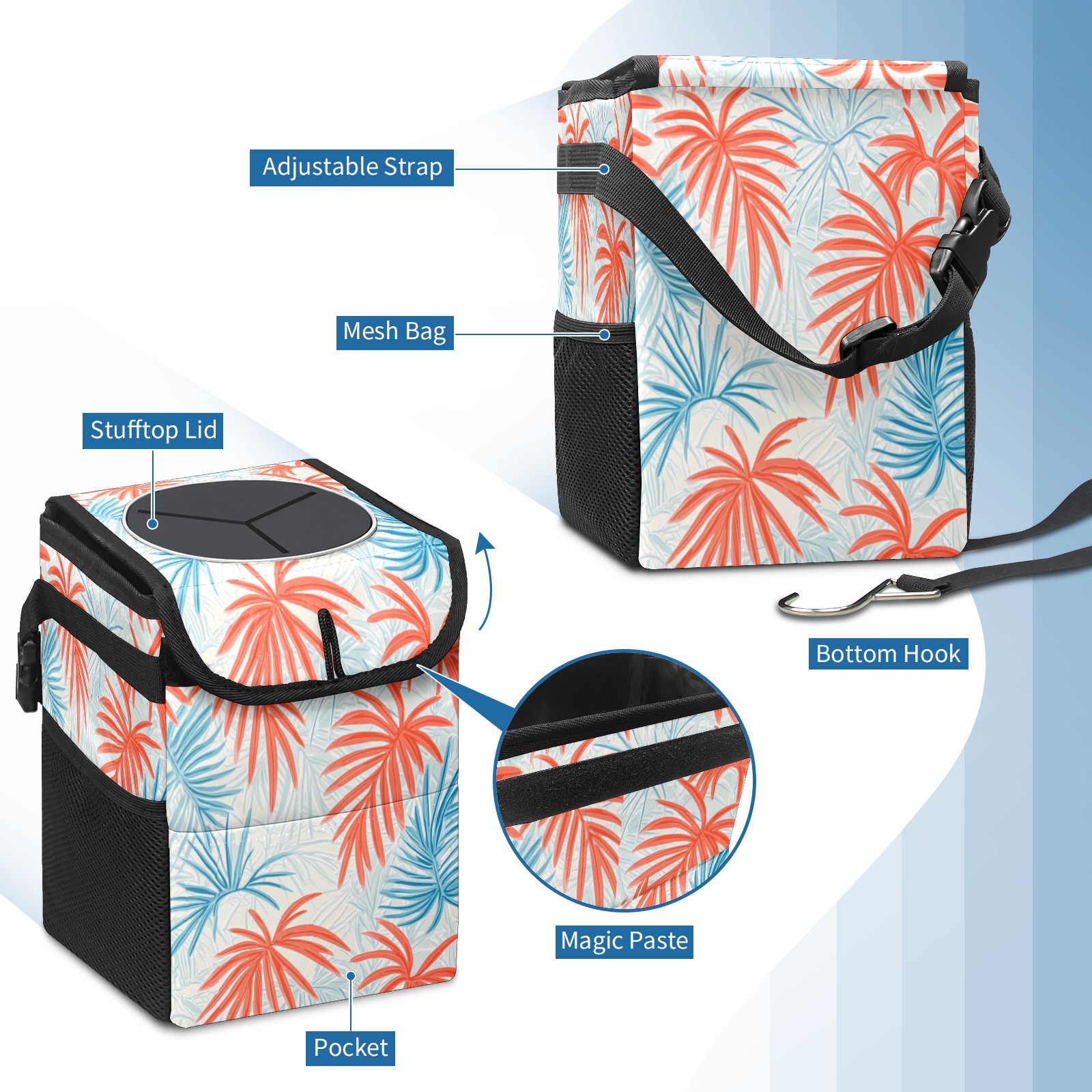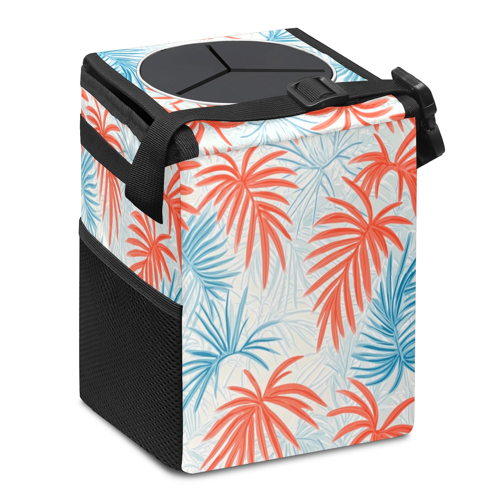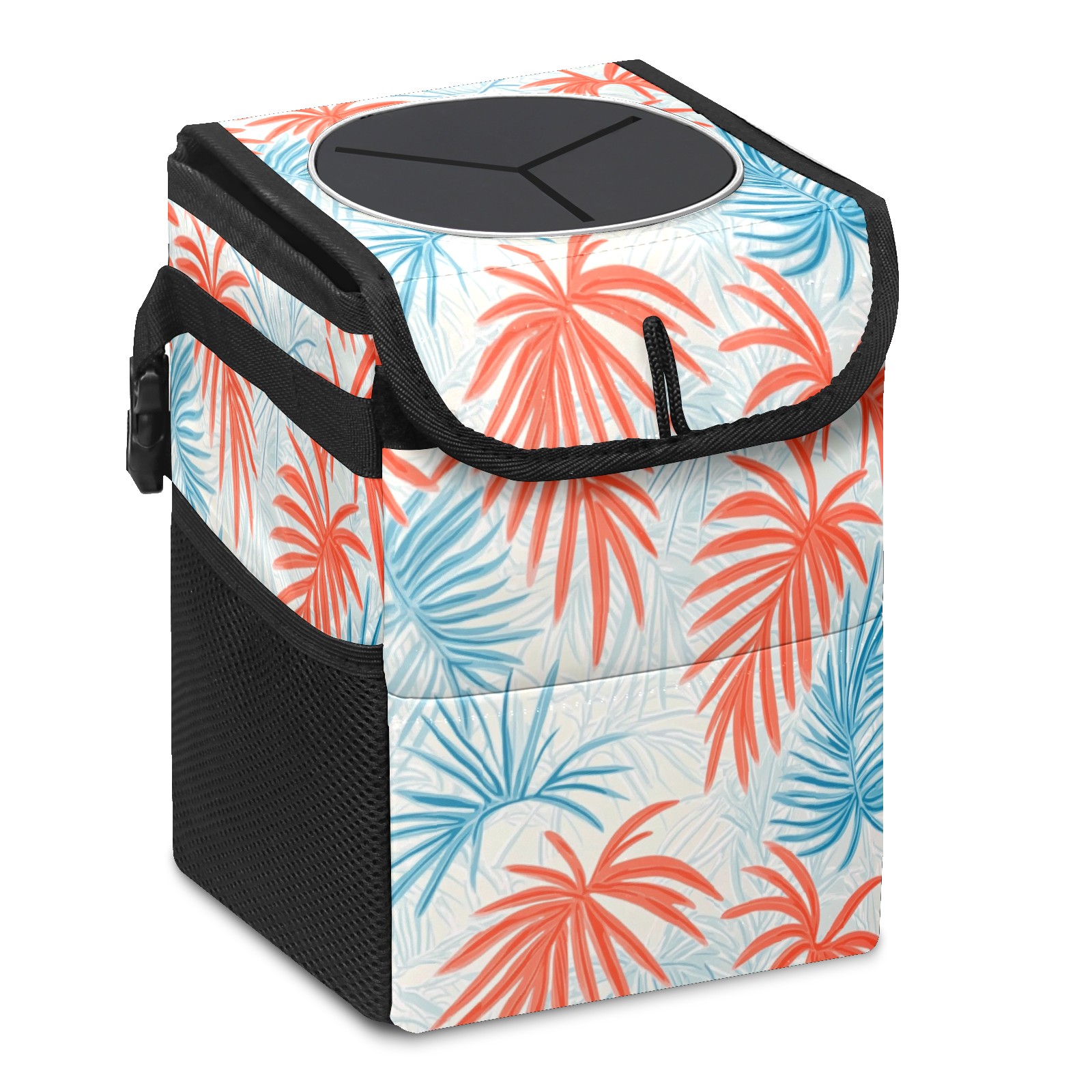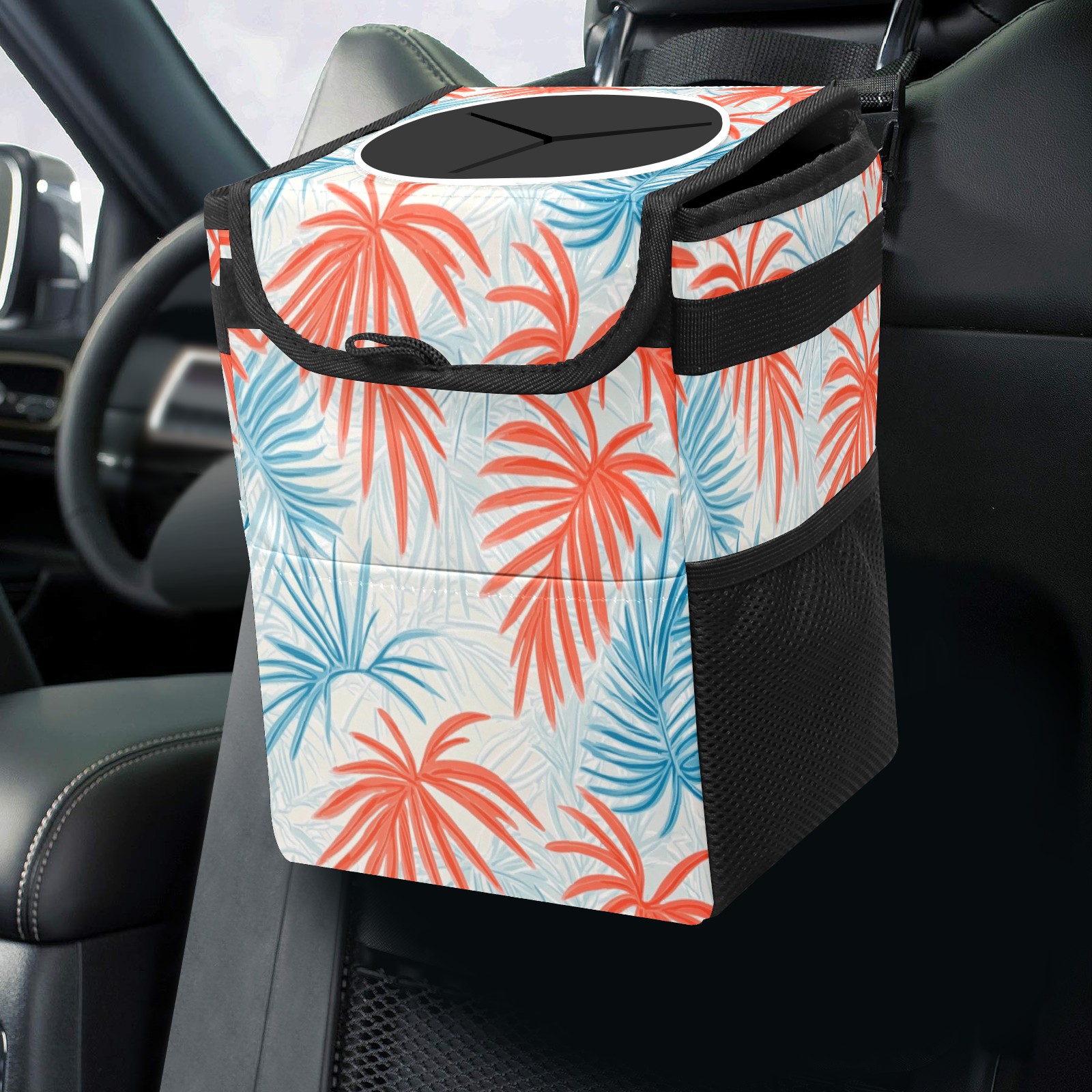 Car Trash Can with Lid, Small Portable Hanging Automotive Garbage Bin for Vehicles, Leakproof Waste Bag Container for SUV Truck Van Interior Auto Travel Road Trips(Tropical Leaves)