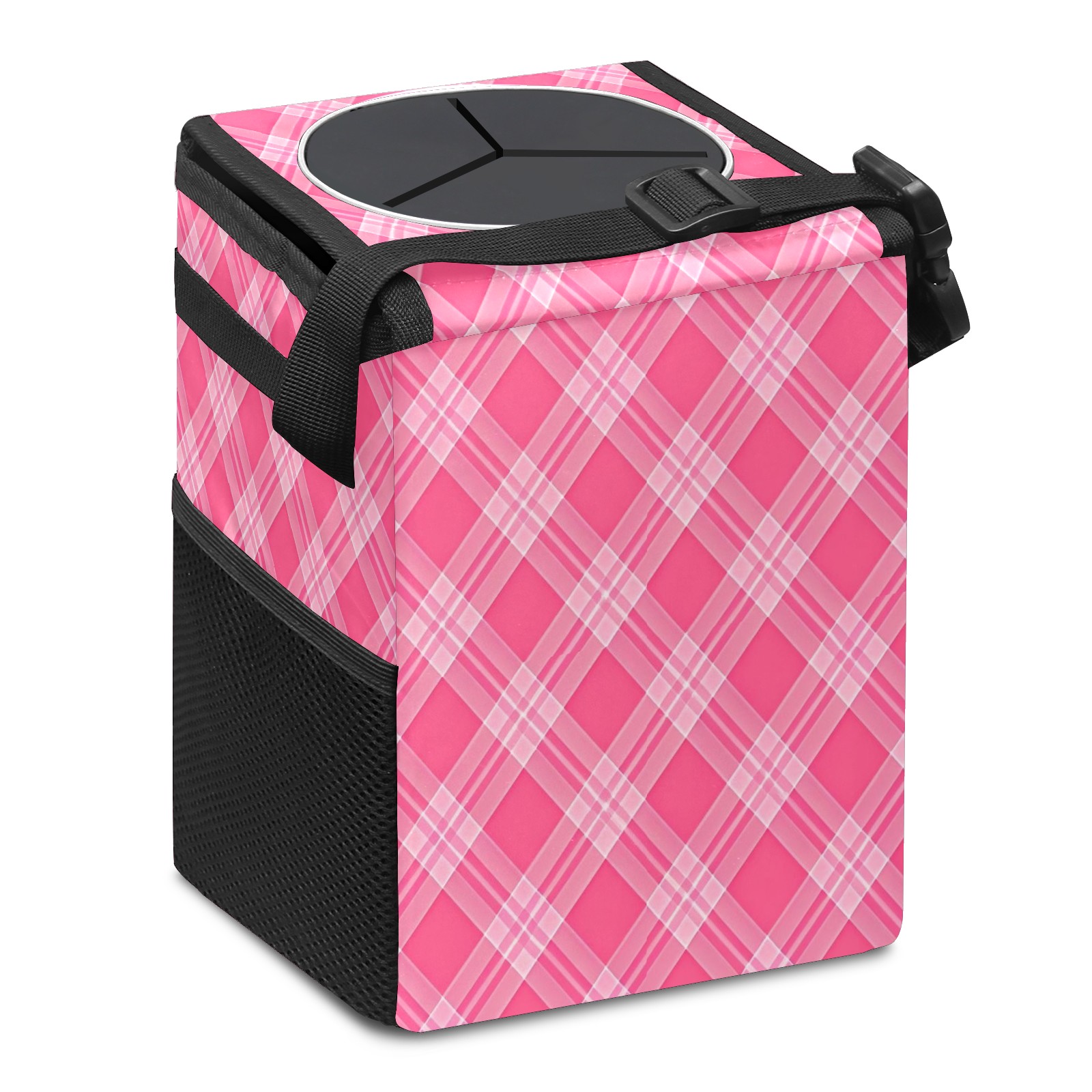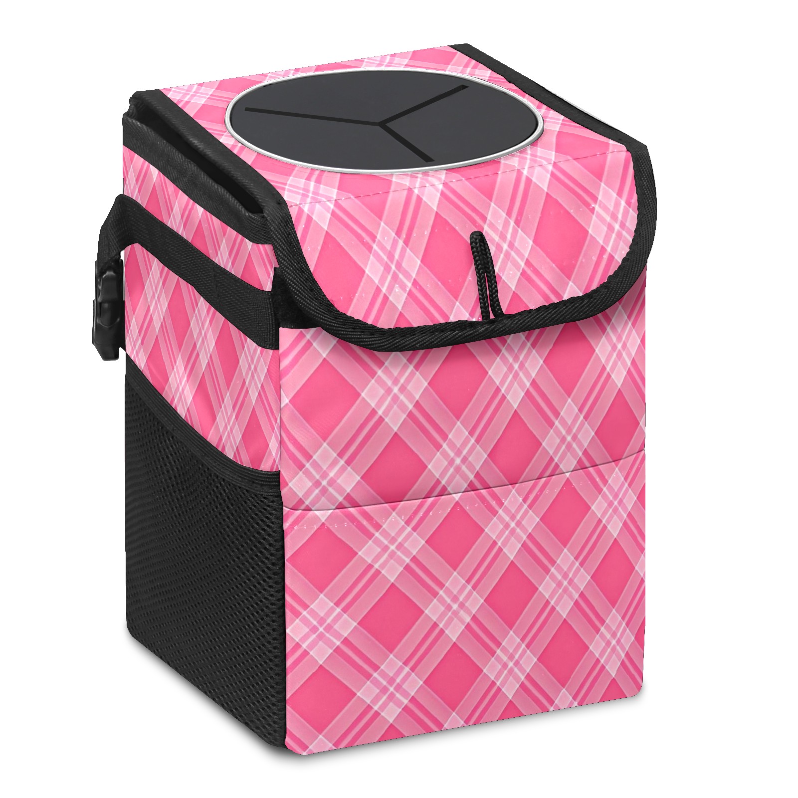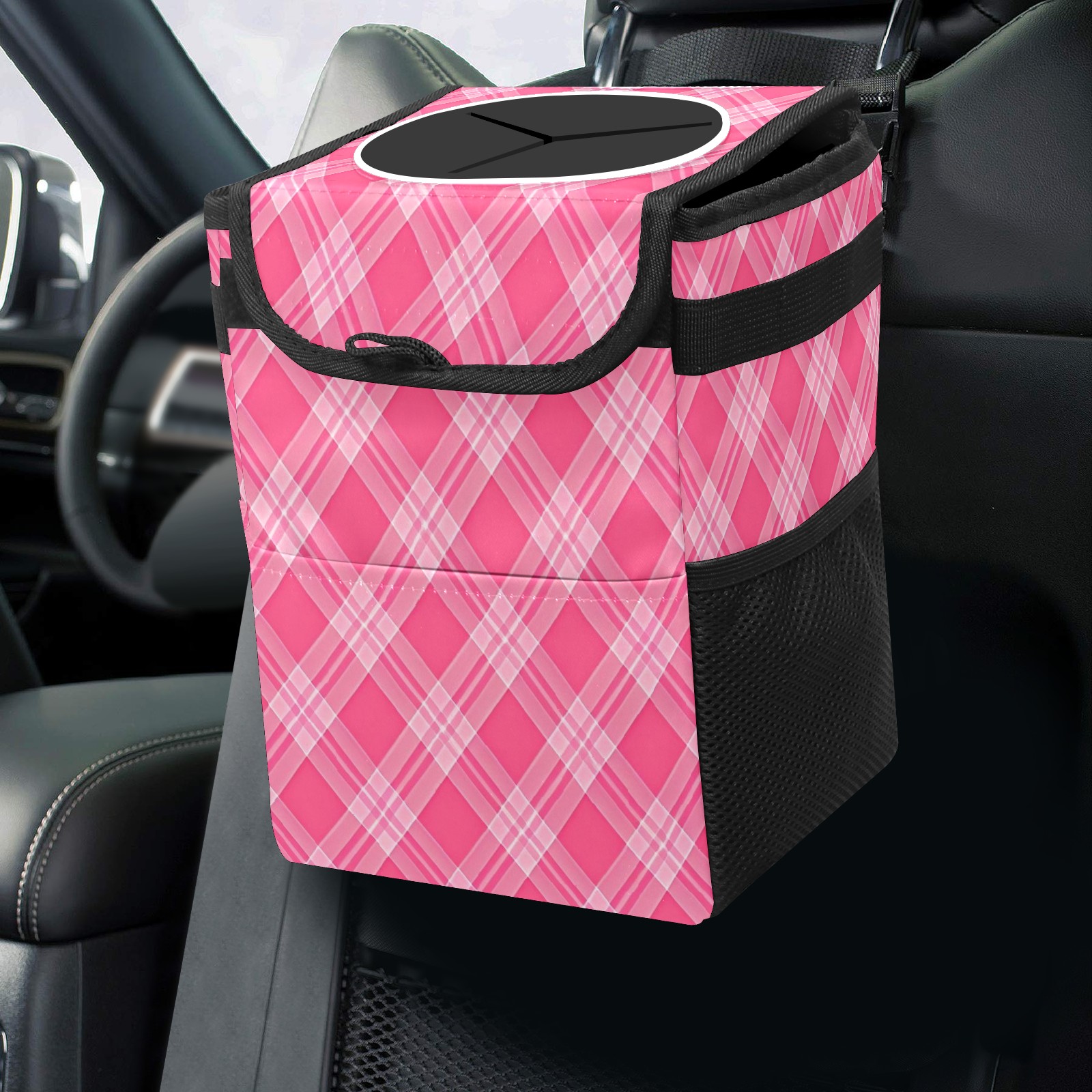 Car Trash Can with Lid, Small Portable Hanging Automotive Garbage Bin for Vehicles, Leakproof Waste Bag Container for SUV Truck Van Interior Auto Travel Road Trips(Pink White Checkered)