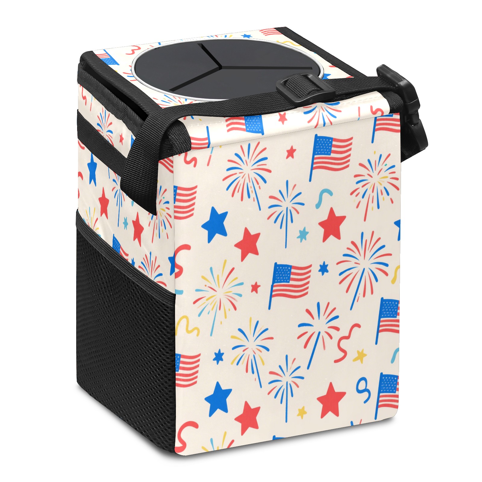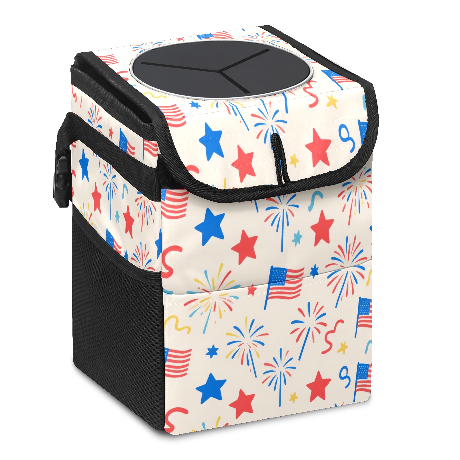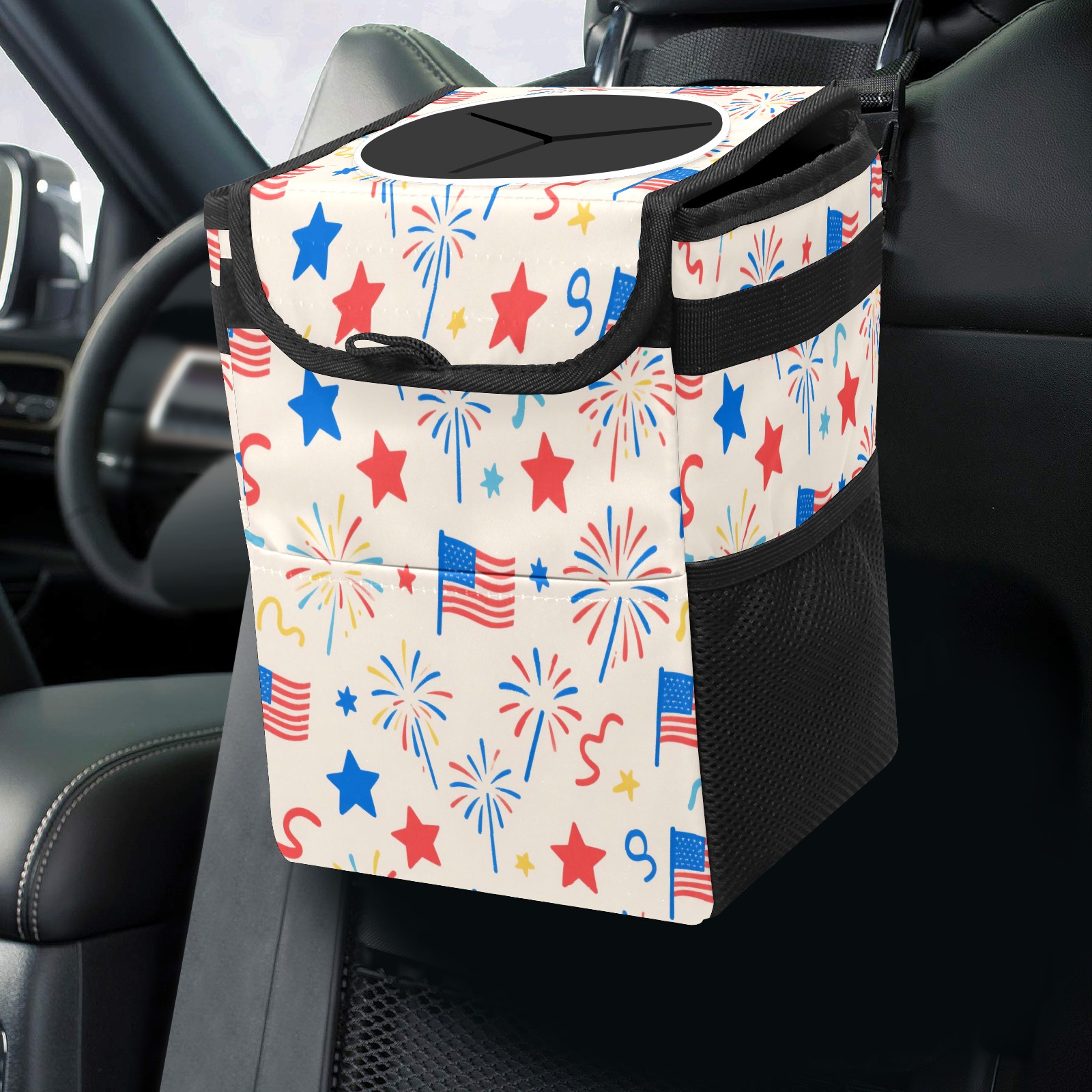 Car Trash Can with Lid, Small Portable Hanging Automotive Garbage Bin for Vehicles, Leakproof Waste Bag Container for SUV Truck Van Interior Auto Travel Road Trips(American Flag Firework)