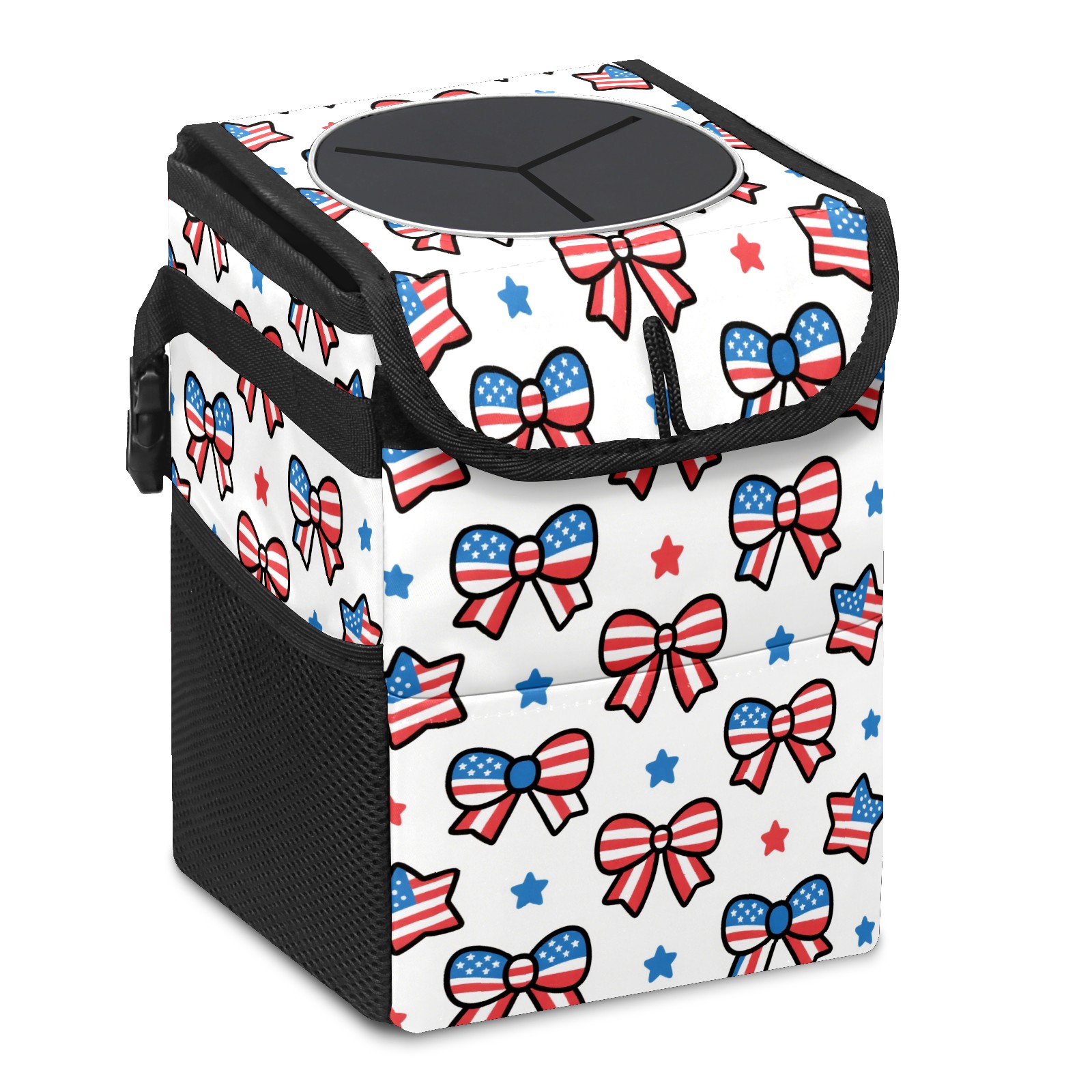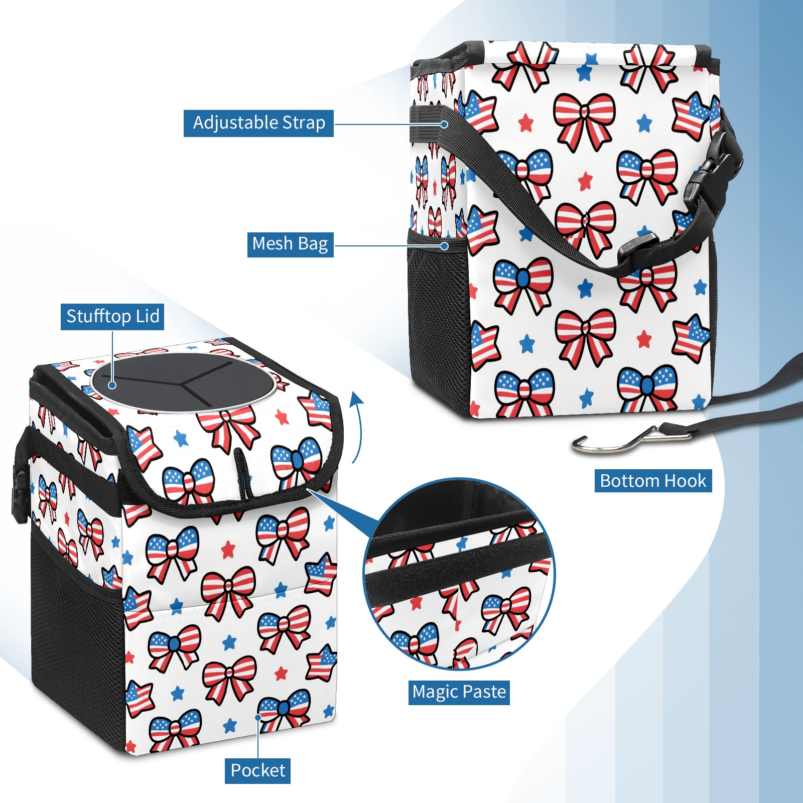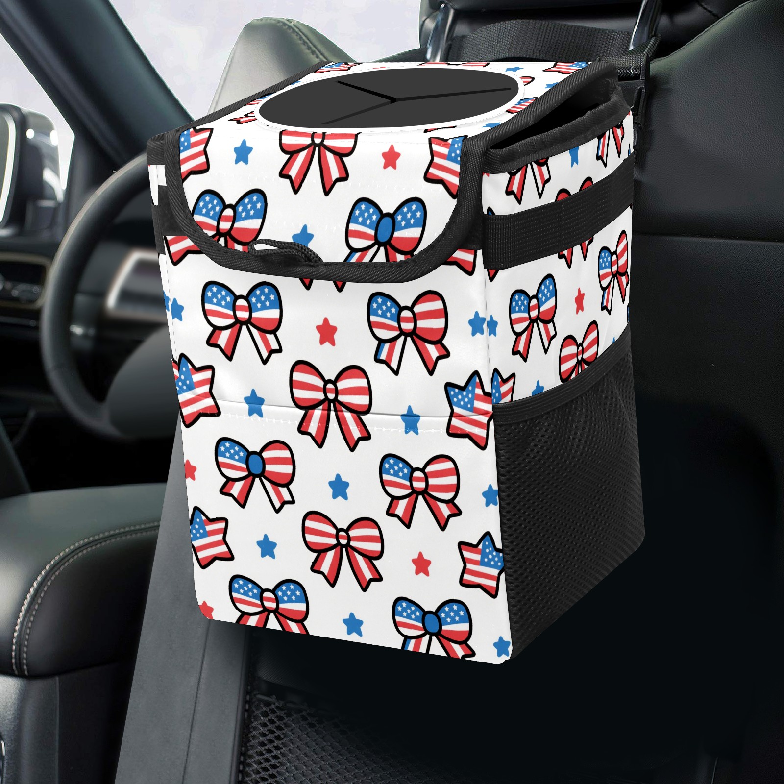 Car Trash Can with Lid, Small Portable Hanging Automotive Garbage Bin for Vehicles, Leakproof Waste Bag Container for SUV Truck Van Interior Auto Travel Road Trips(American Flag Star Bow)