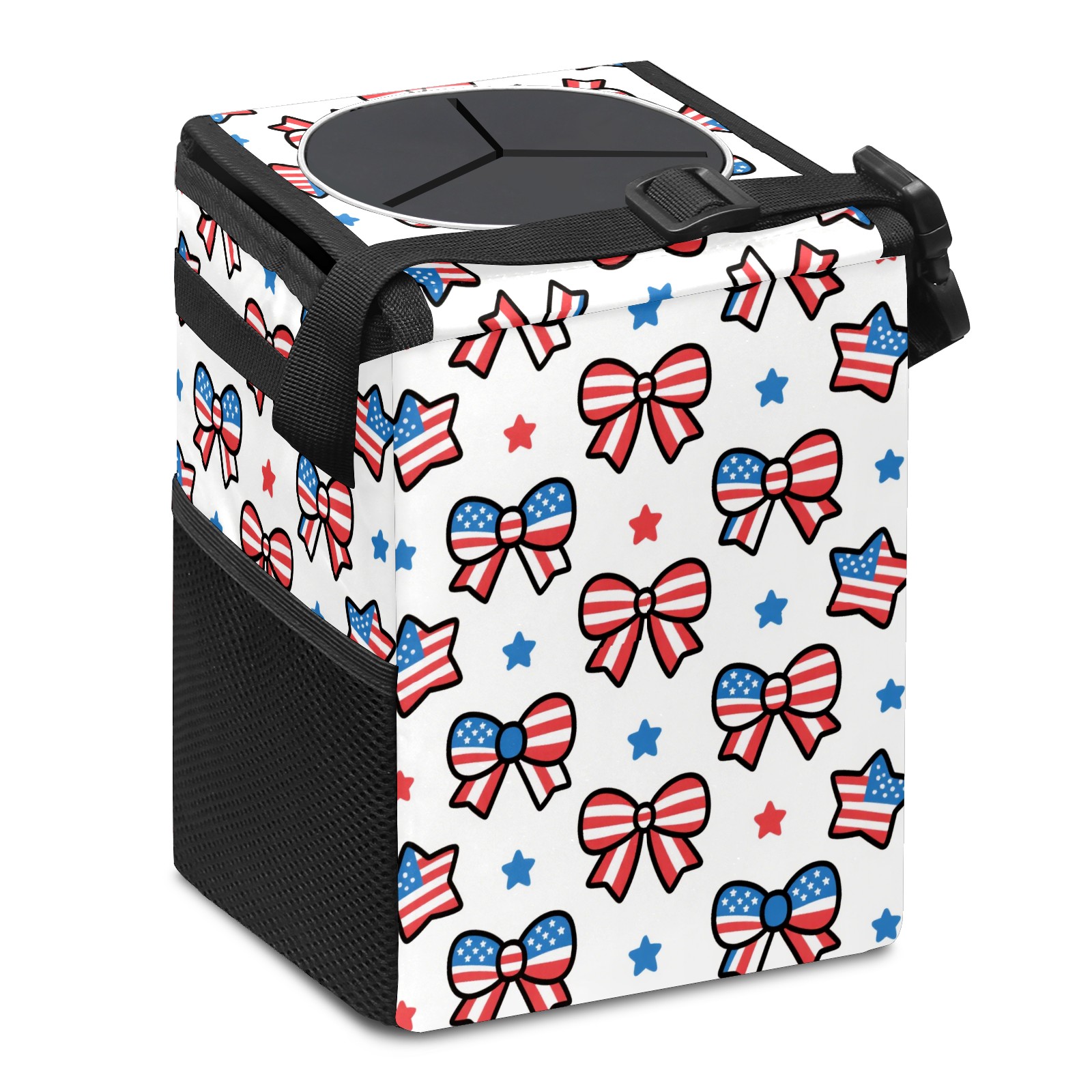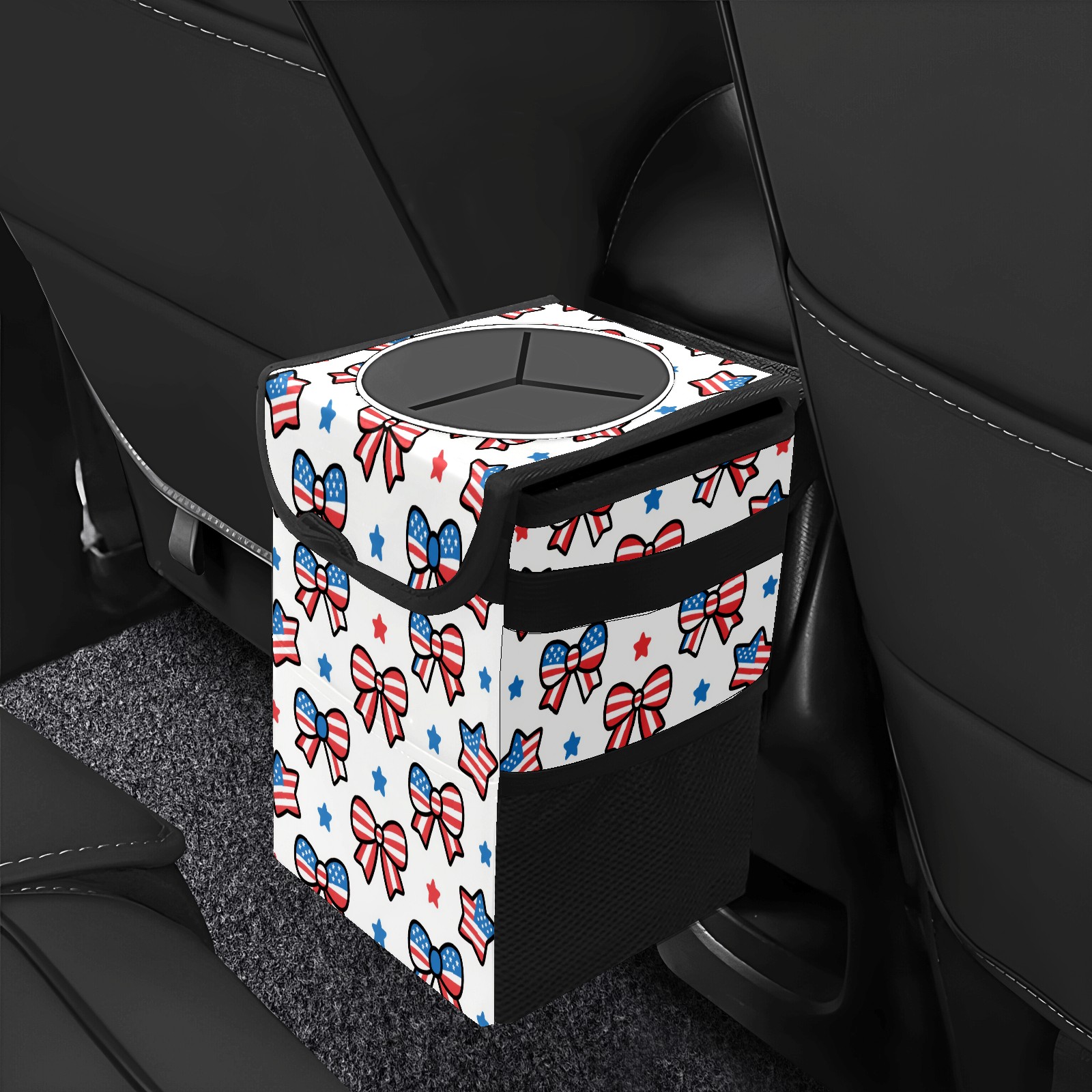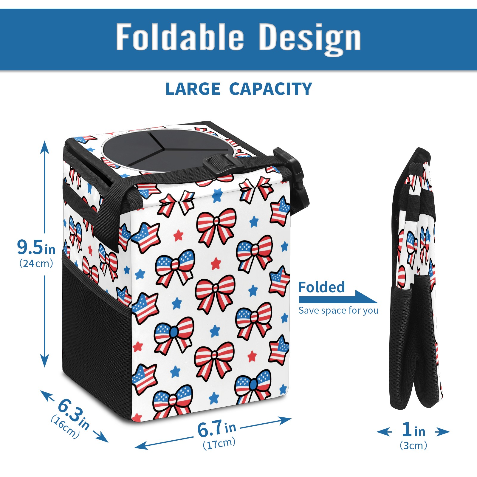 Car Trash Can with Lid, Small Portable Hanging Automotive Garbage Bin for Vehicles, Leakproof Waste Bag Container for SUV Truck Van Interior Auto Travel Road Trips(American Flag Star Bow)