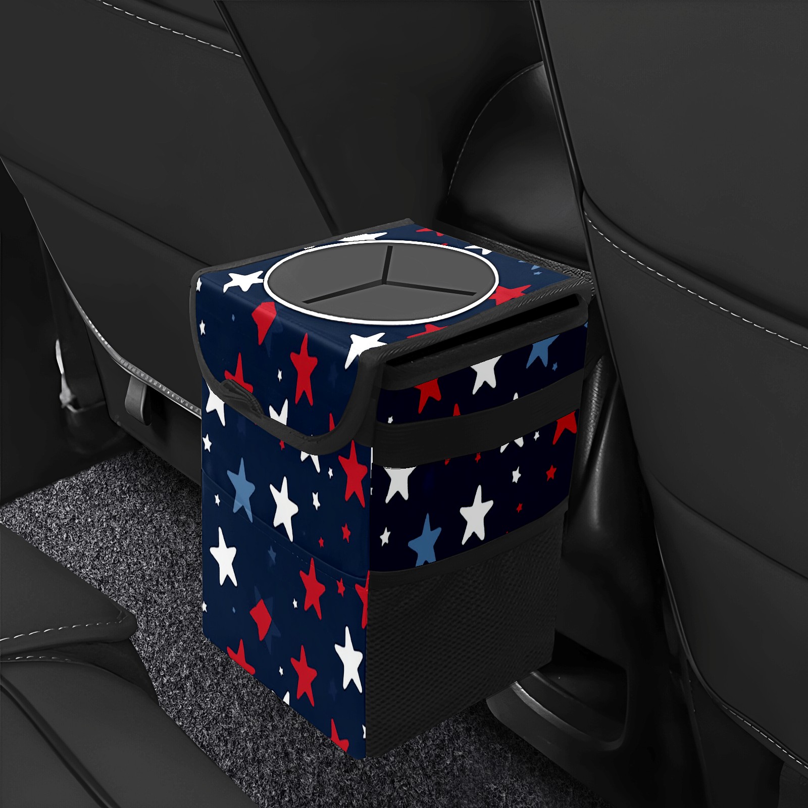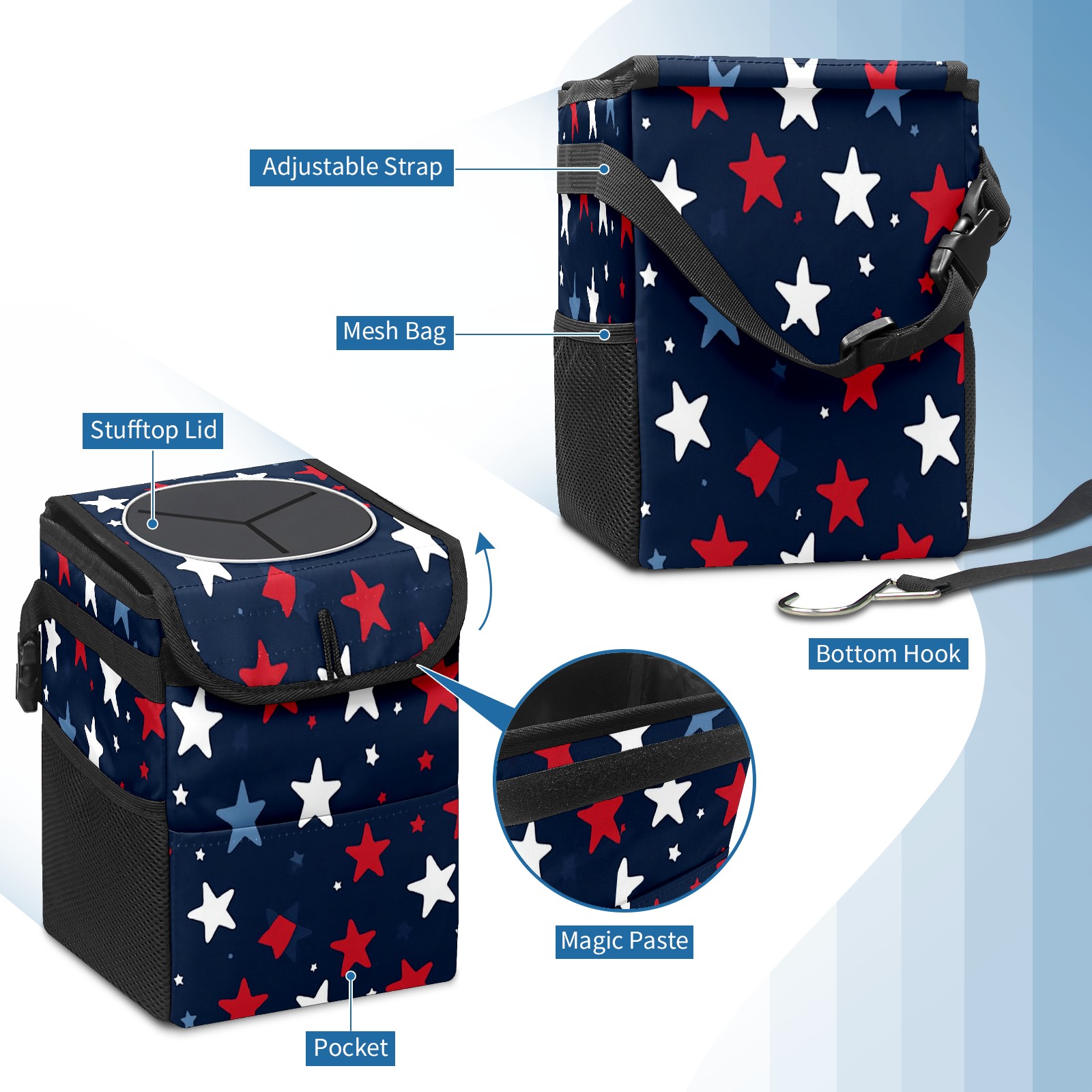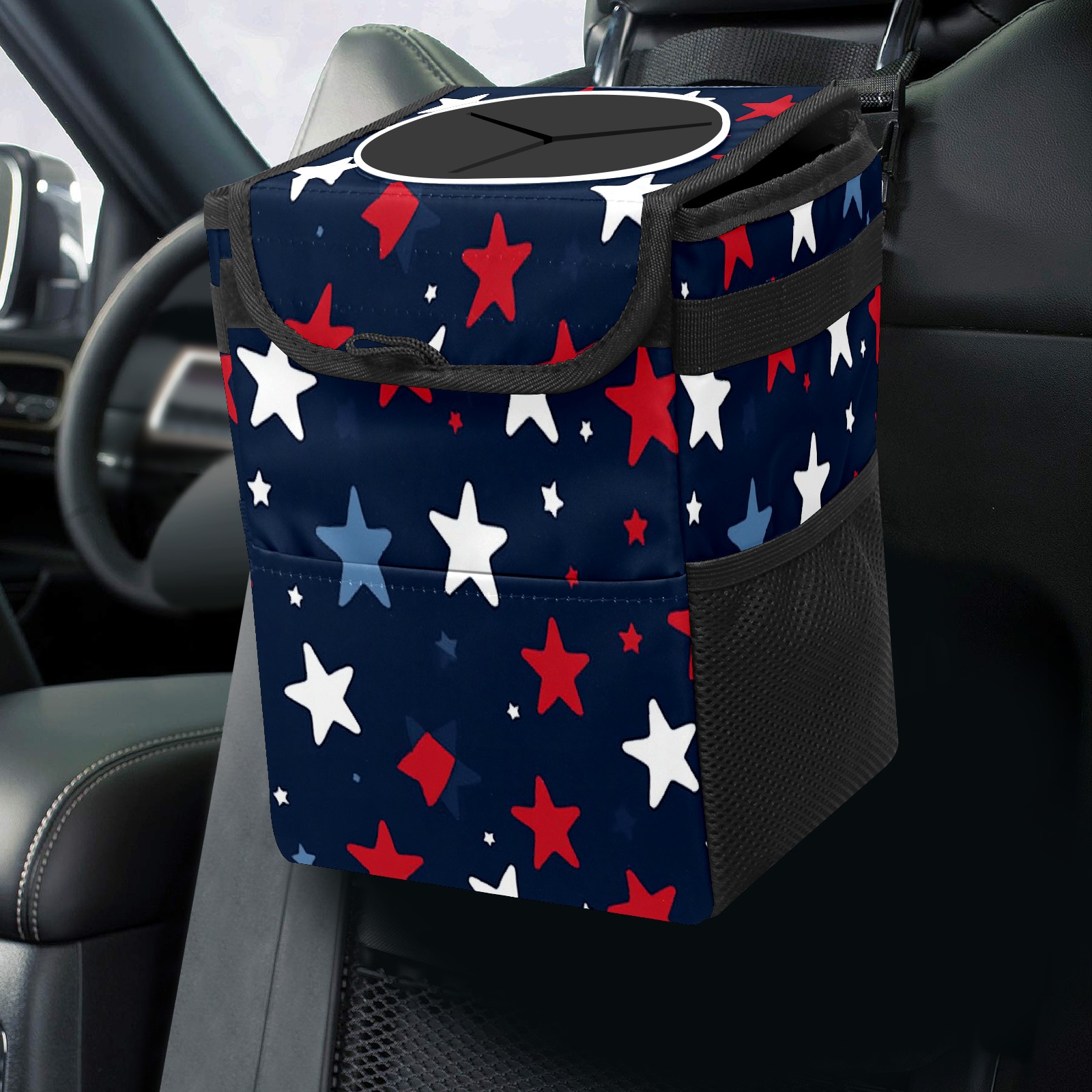 Car Trash Can with Lid, Small Portable Hanging Automotive Garbage Bin for Vehicles, Leakproof Waste Bag Container for SUV Truck Van Interior Auto Travel Road Trips(Red White And Blue Stars)