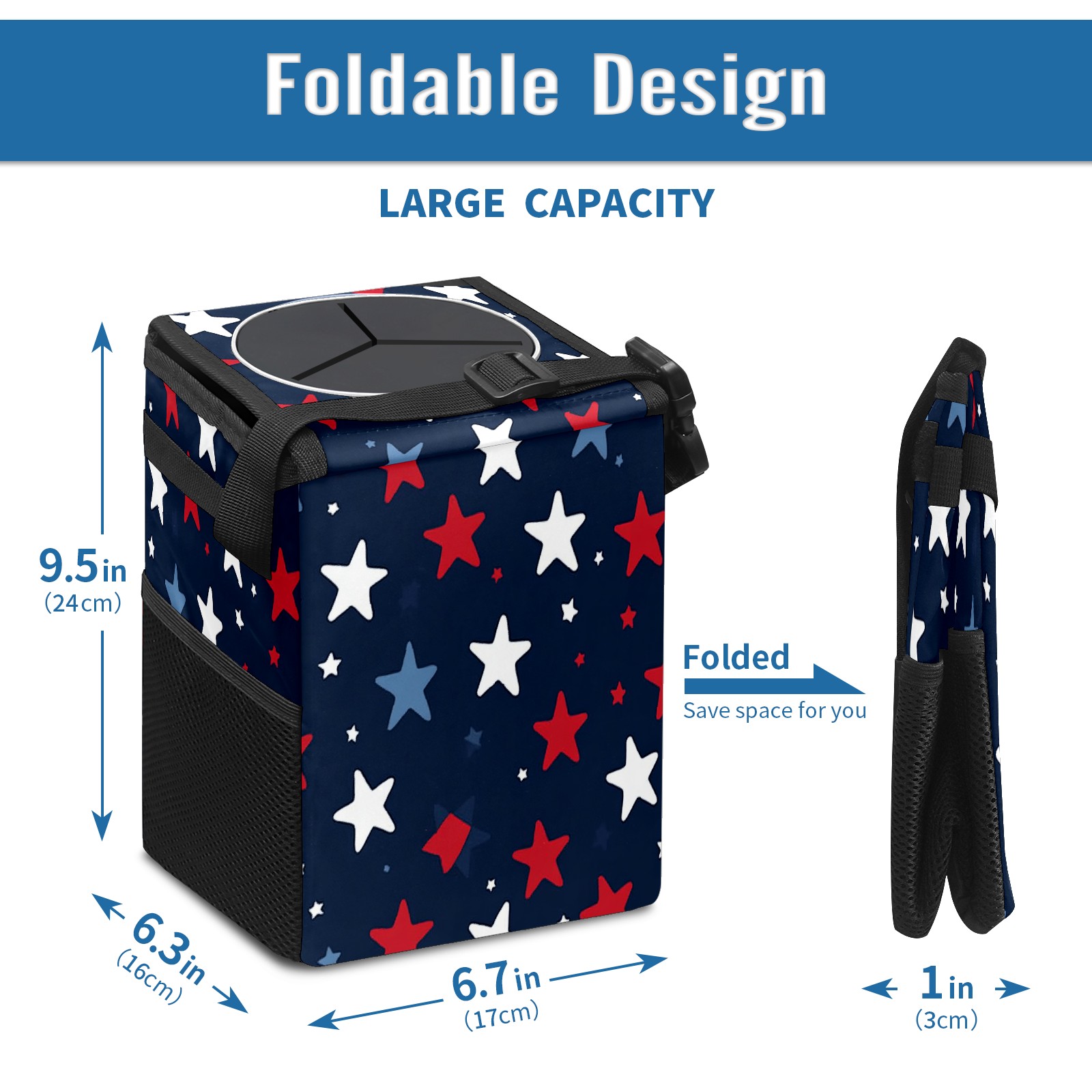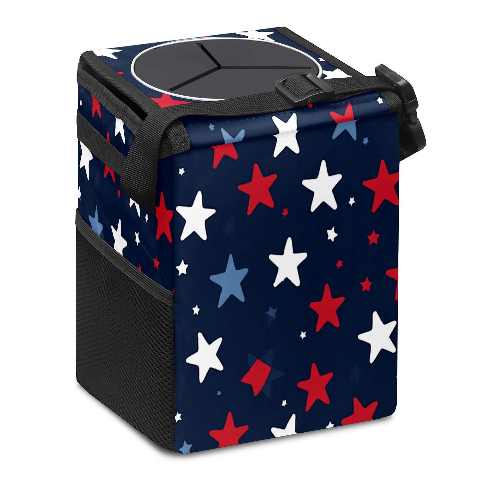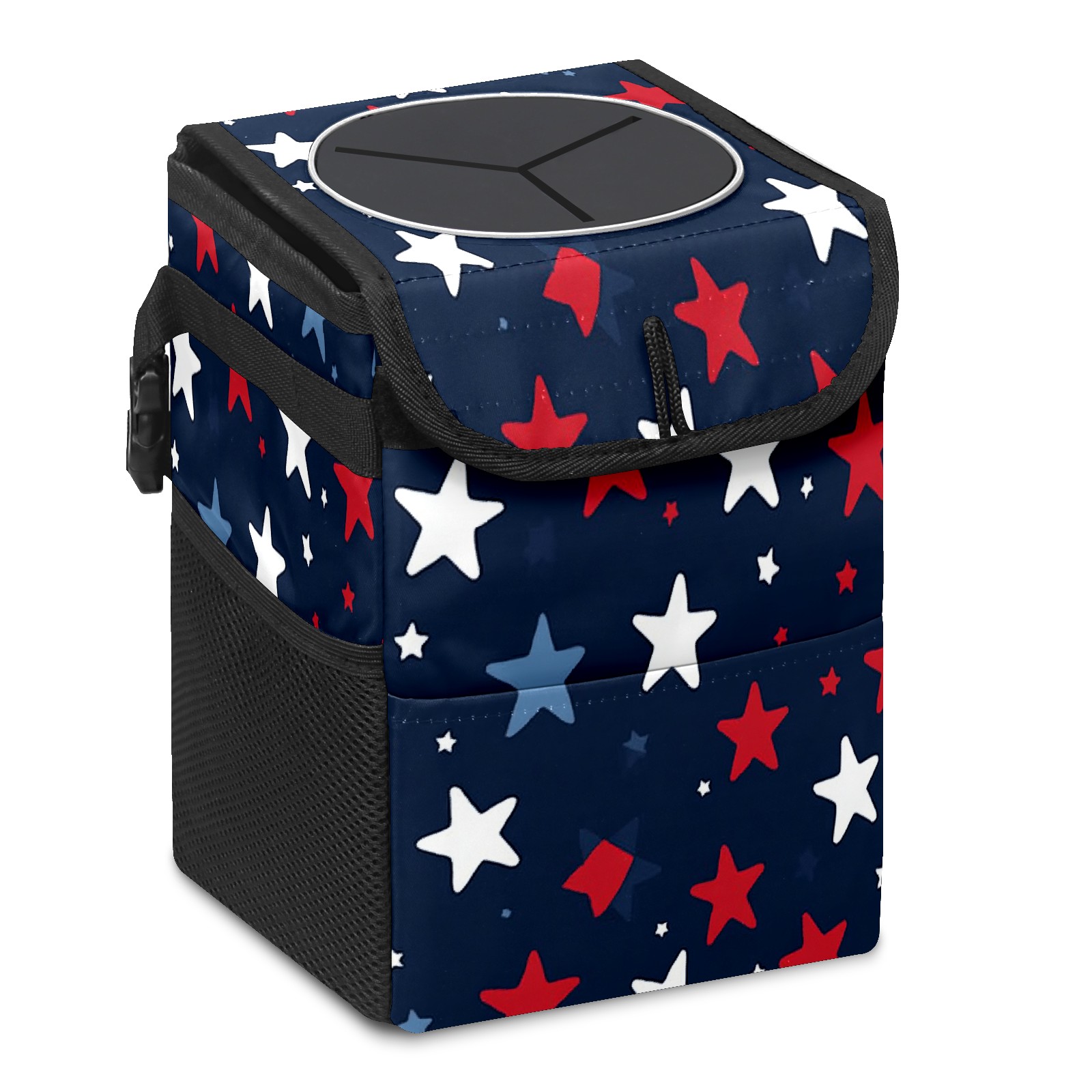 Car Trash Can with Lid, Small Portable Hanging Automotive Garbage Bin for Vehicles, Leakproof Waste Bag Container for SUV Truck Van Interior Auto Travel Road Trips(Red White And Blue Stars)