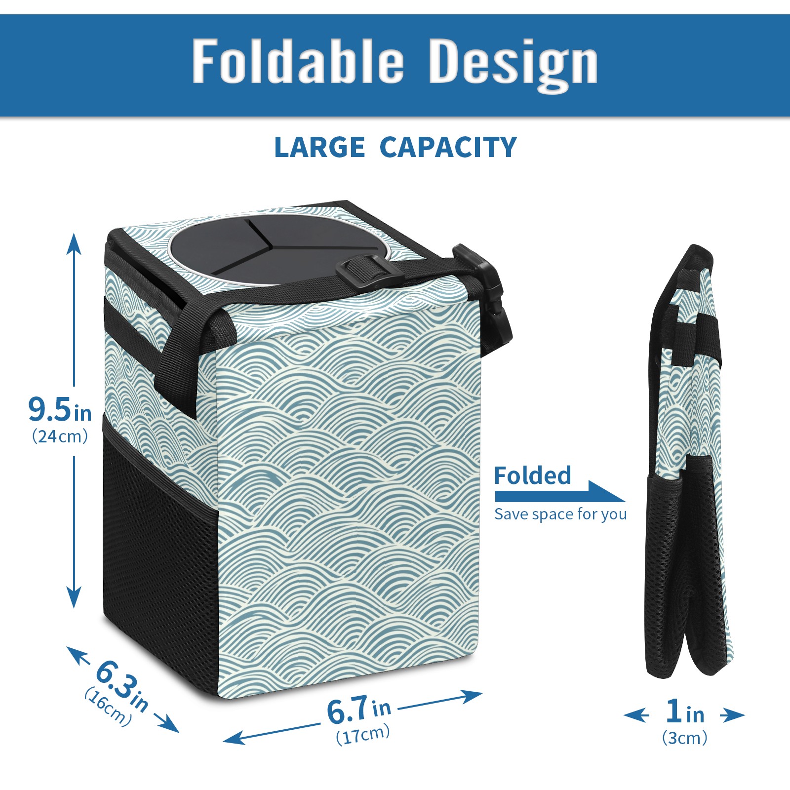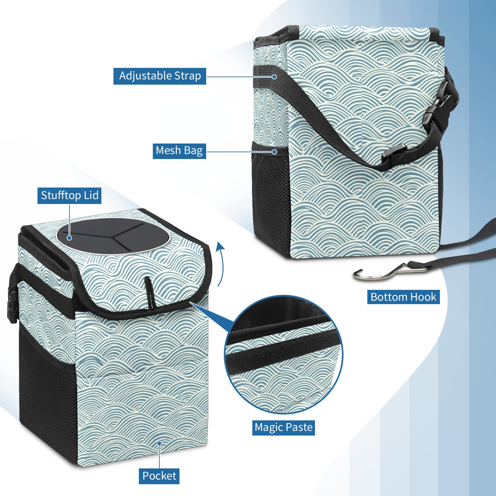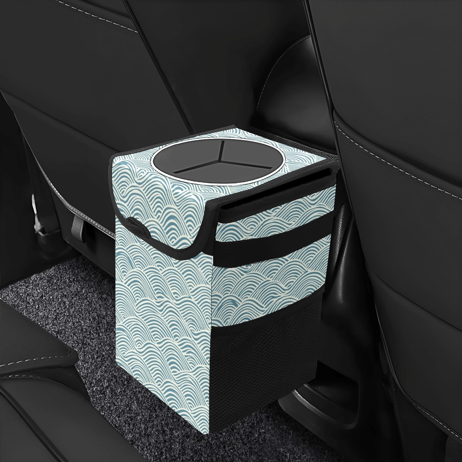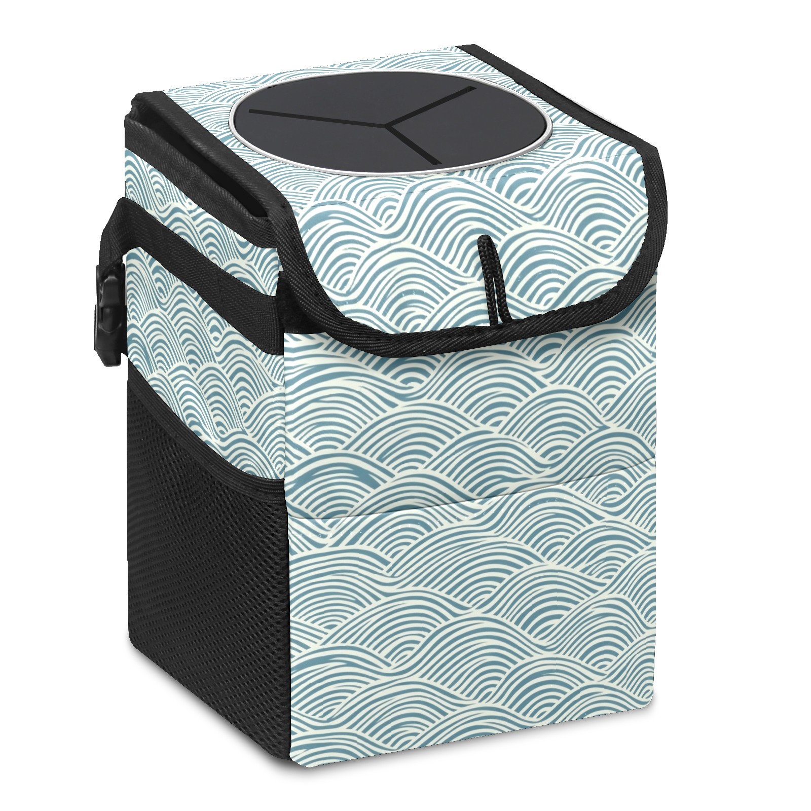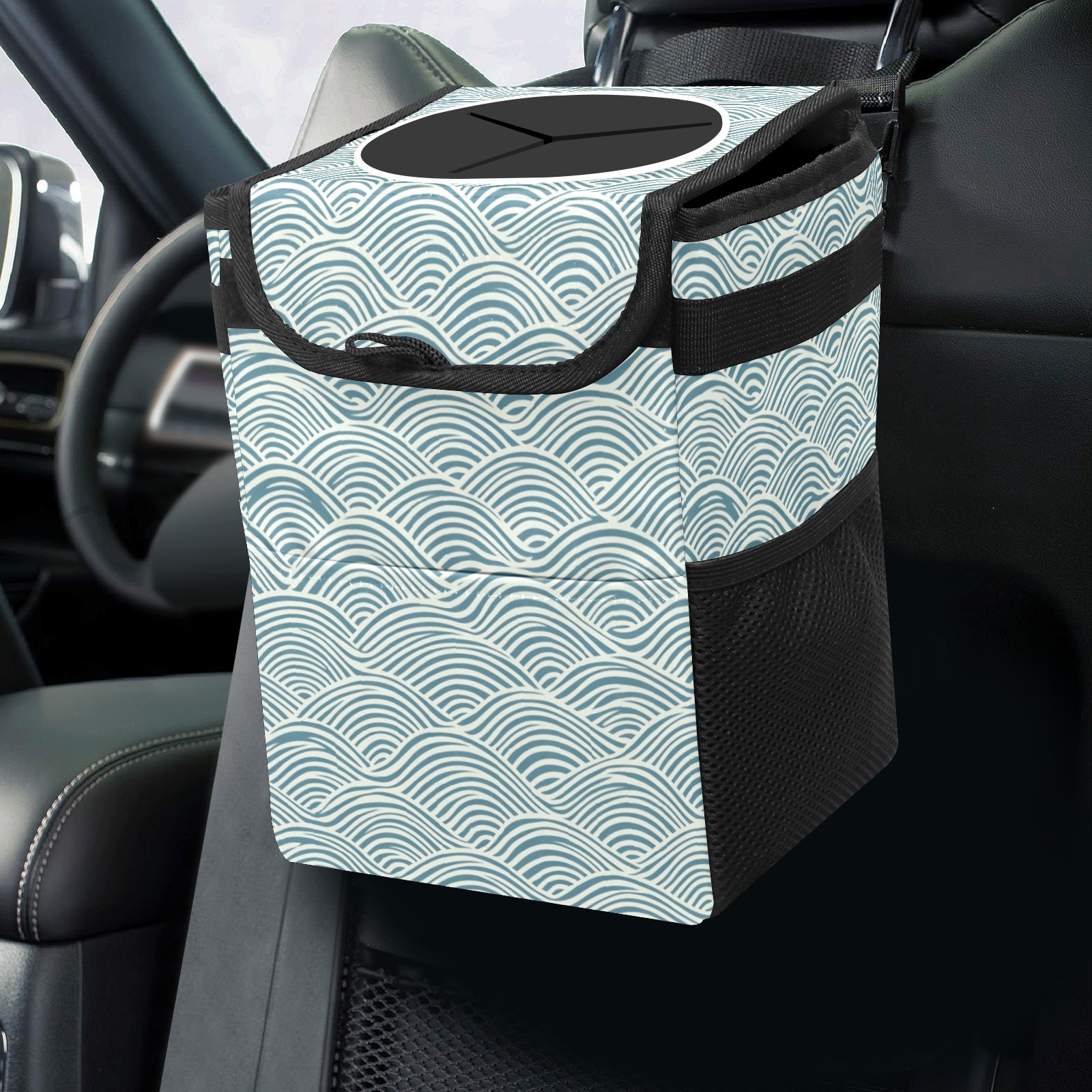 Car Trash Can with Lid, Small Portable Hanging Automotive Garbage Bin for Vehicles, Leakproof Waste Bag Container for SUV Truck Van Interior Auto Travel Road Trips(Japanese Wave Lines)