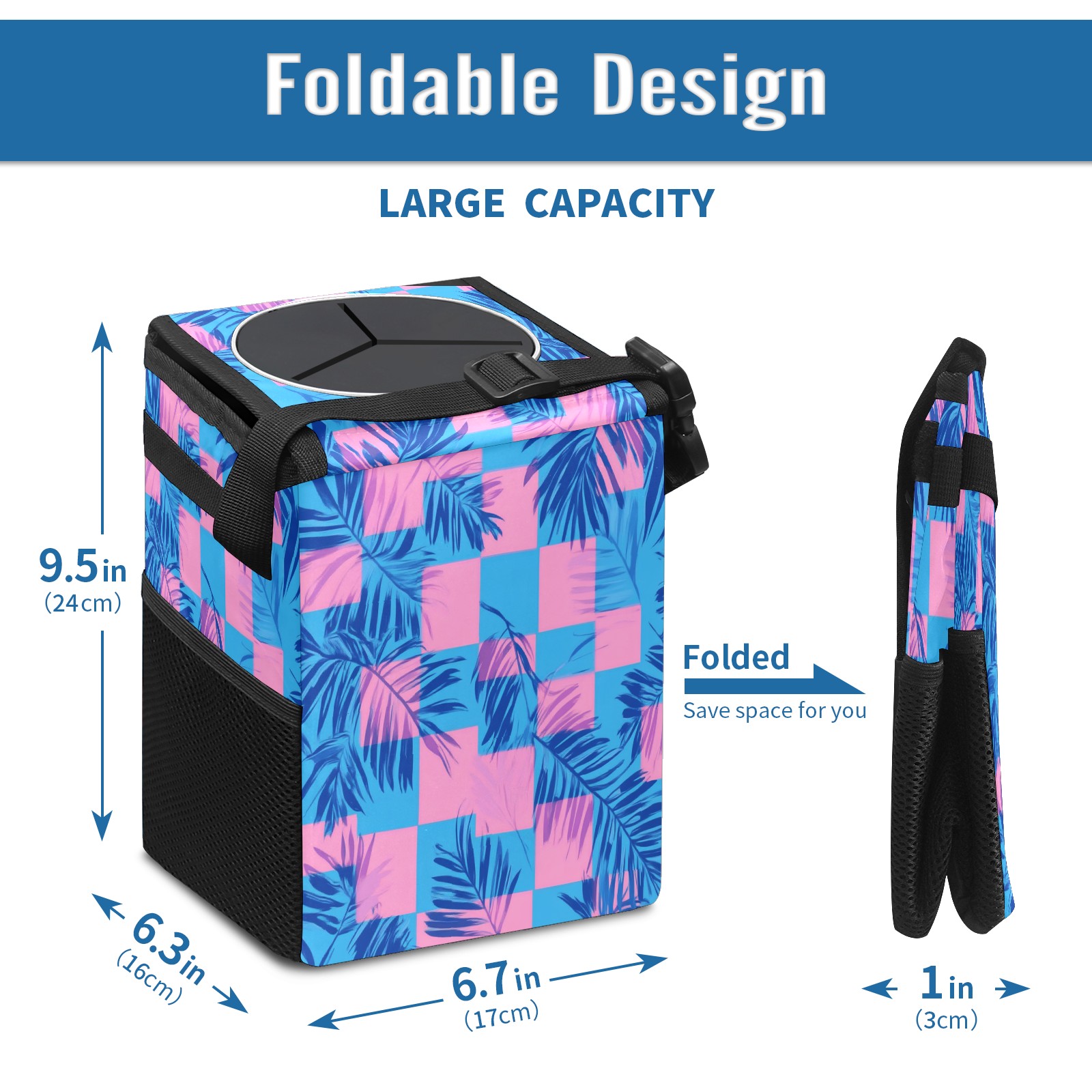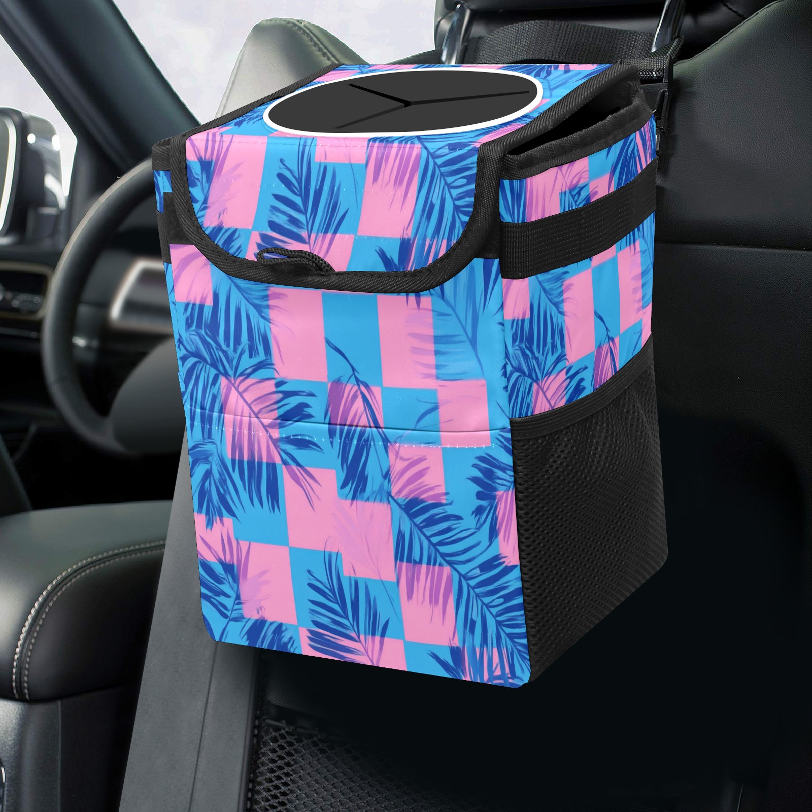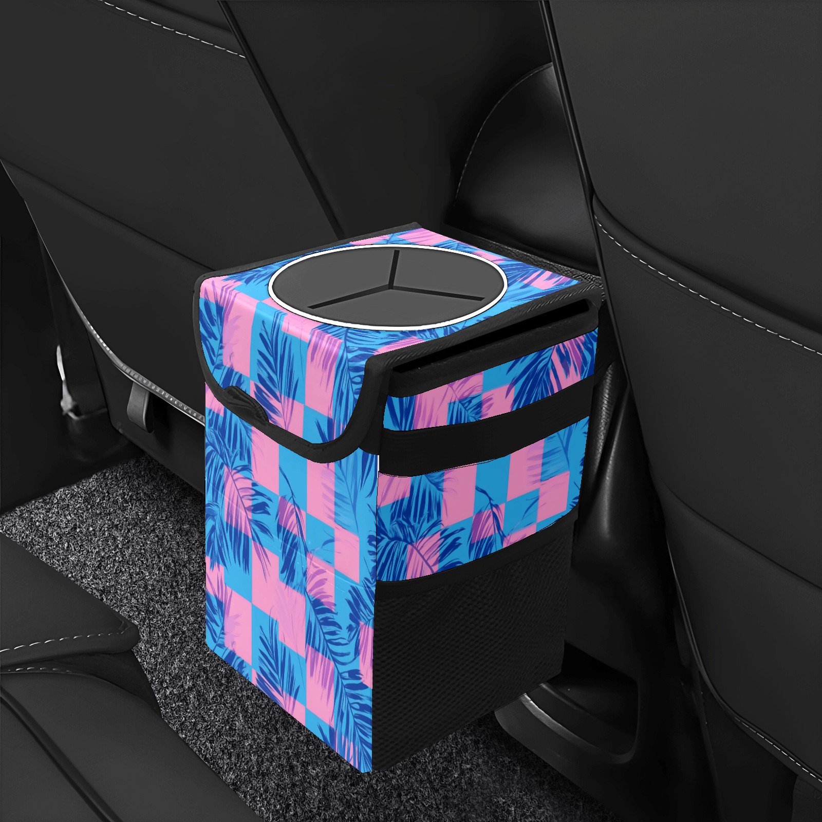 Car Trash Can with Lid, Small Portable Hanging Automotive Garbage Bin for Vehicles, Leakproof Waste Bag Container for SUV Truck Van Interior Auto Travel Road Trips(Blue And Pink Checkered)