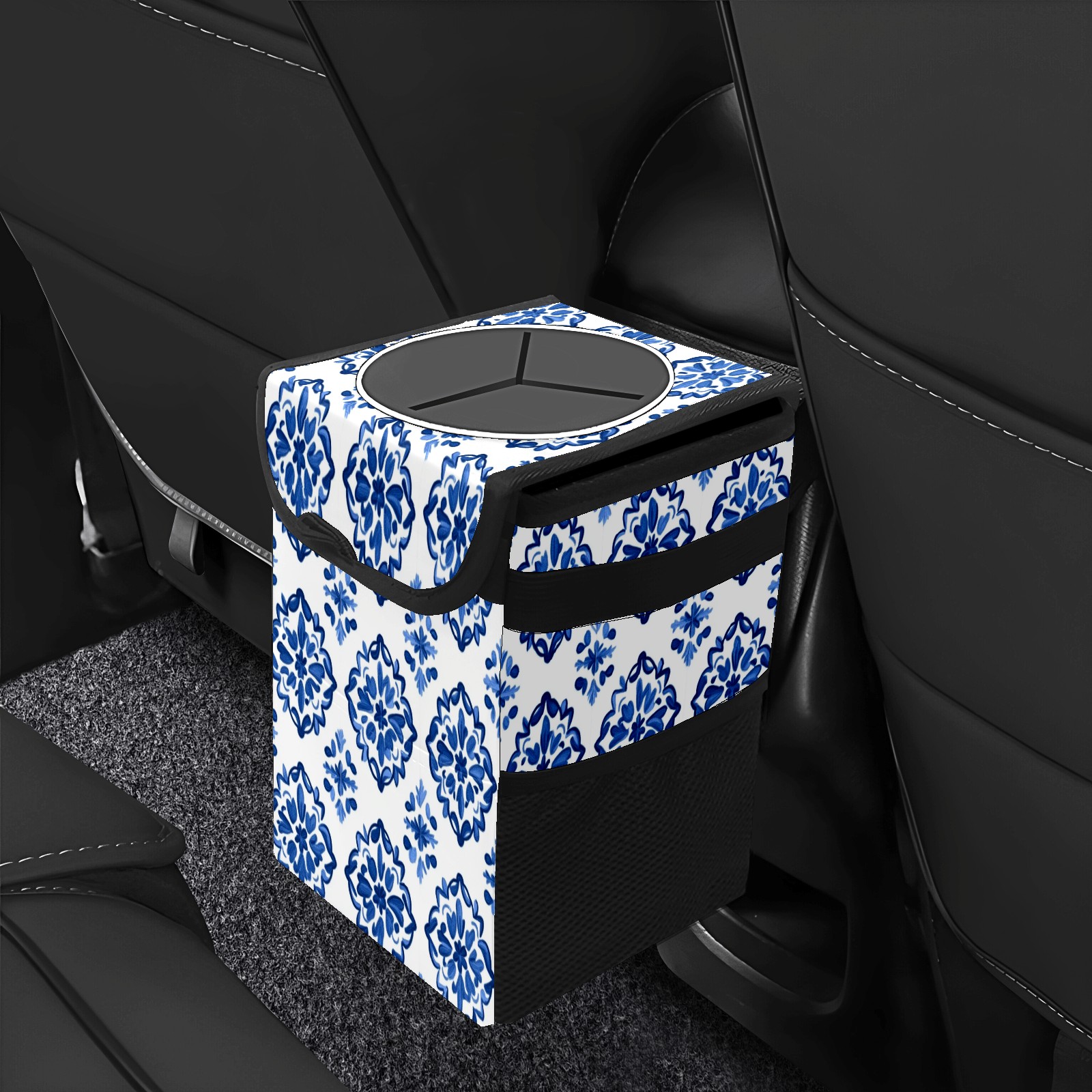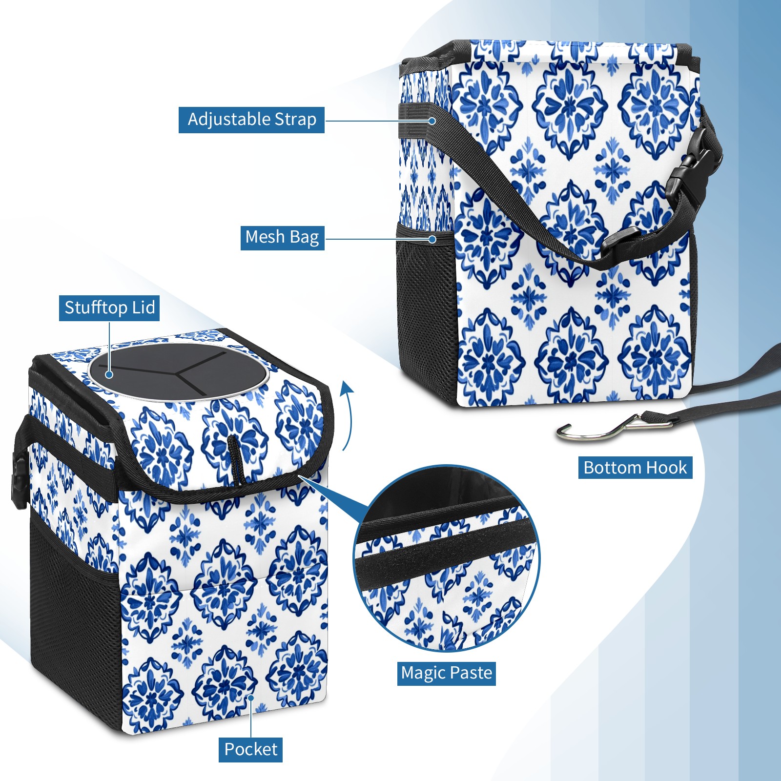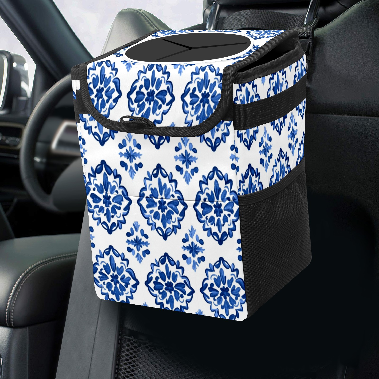Car Trash Can with Lid, Small Portable Hanging Automotive Garbage Bin for Vehicles, Leakproof Waste Bag Container for SUV Truck Van Interior Auto Travel Road Trips(Blue And White Tile)