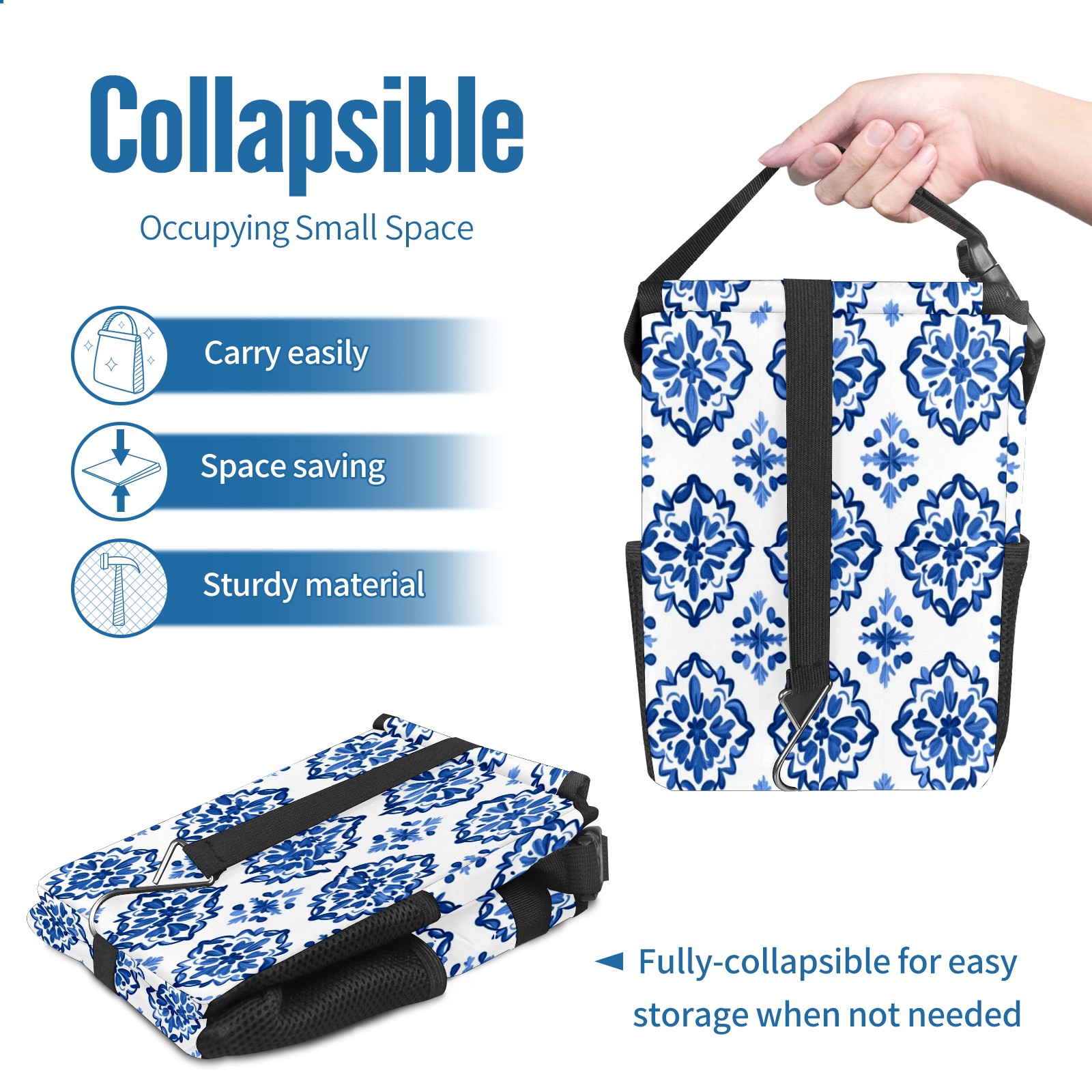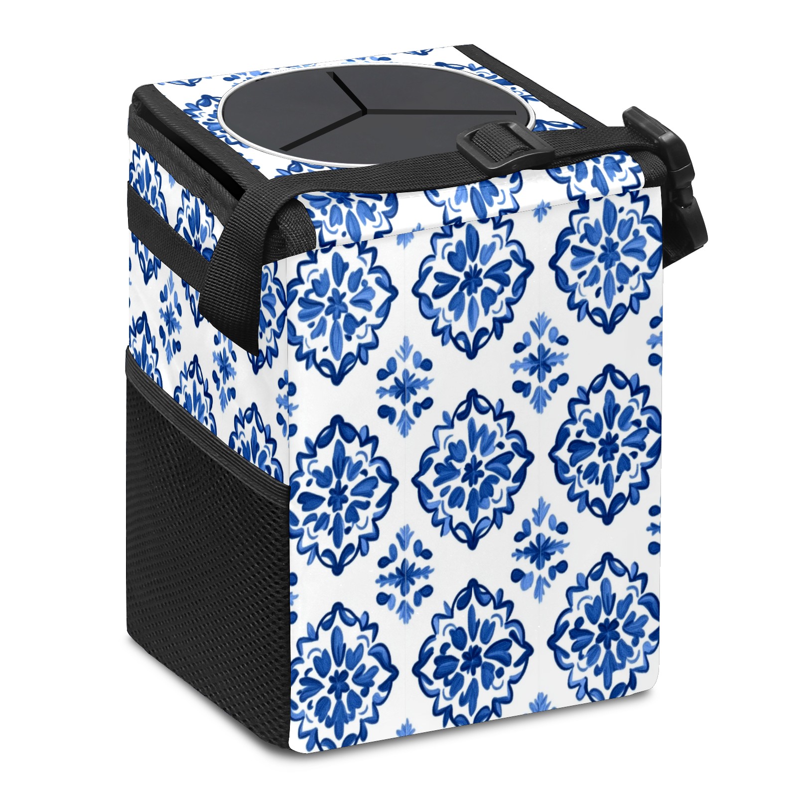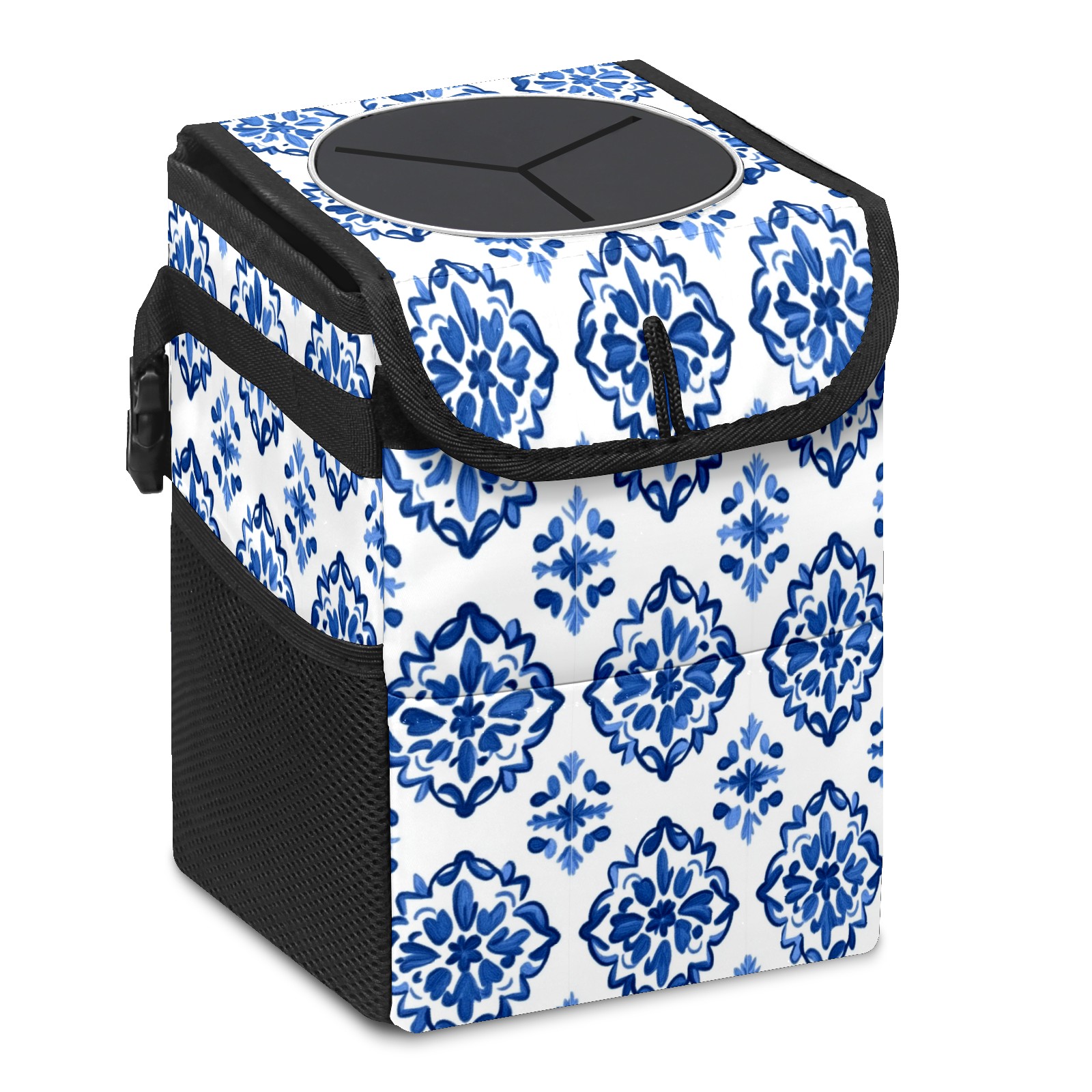 Car Trash Can with Lid, Small Portable Hanging Automotive Garbage Bin for Vehicles, Leakproof Waste Bag Container for SUV Truck Van Interior Auto Travel Road Trips(Blue And White Tile)