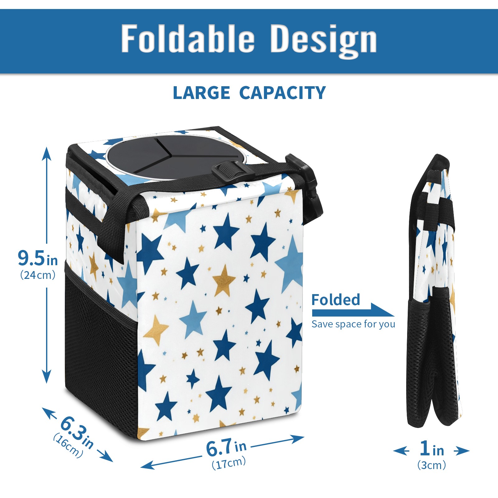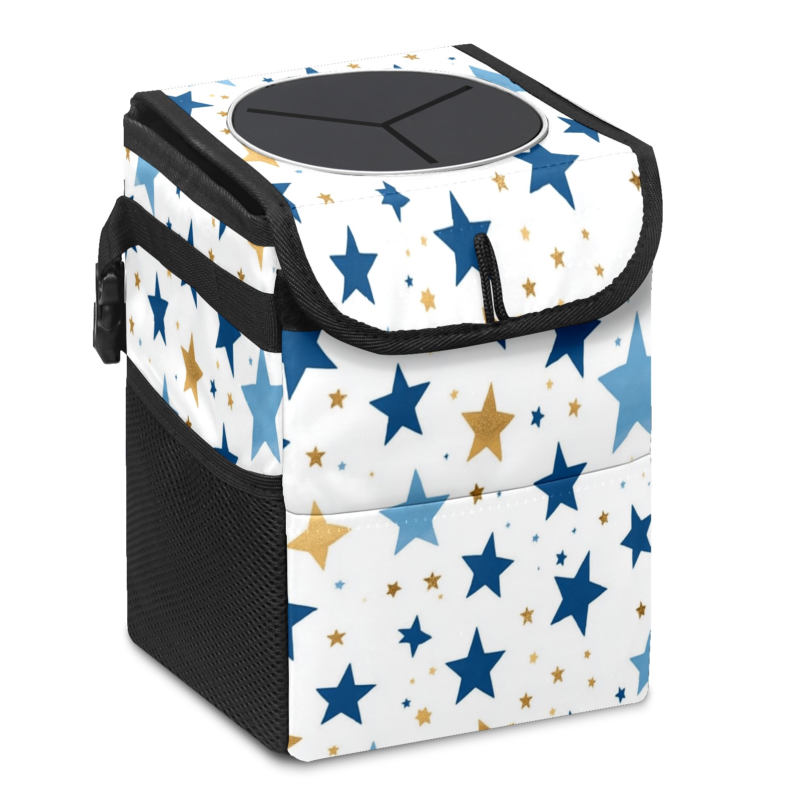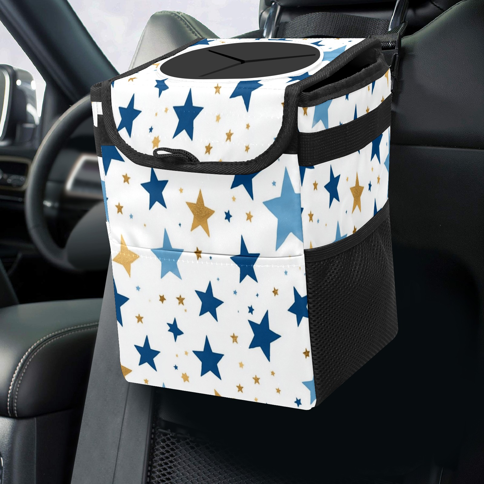 Car Trash Can with Lid, Small Portable Hanging Automotive Garbage Bin for Vehicles, Leakproof Waste Bag Container for SUV Truck Van Interior Auto Travel Road Trips(Blue And Gold Stars)
