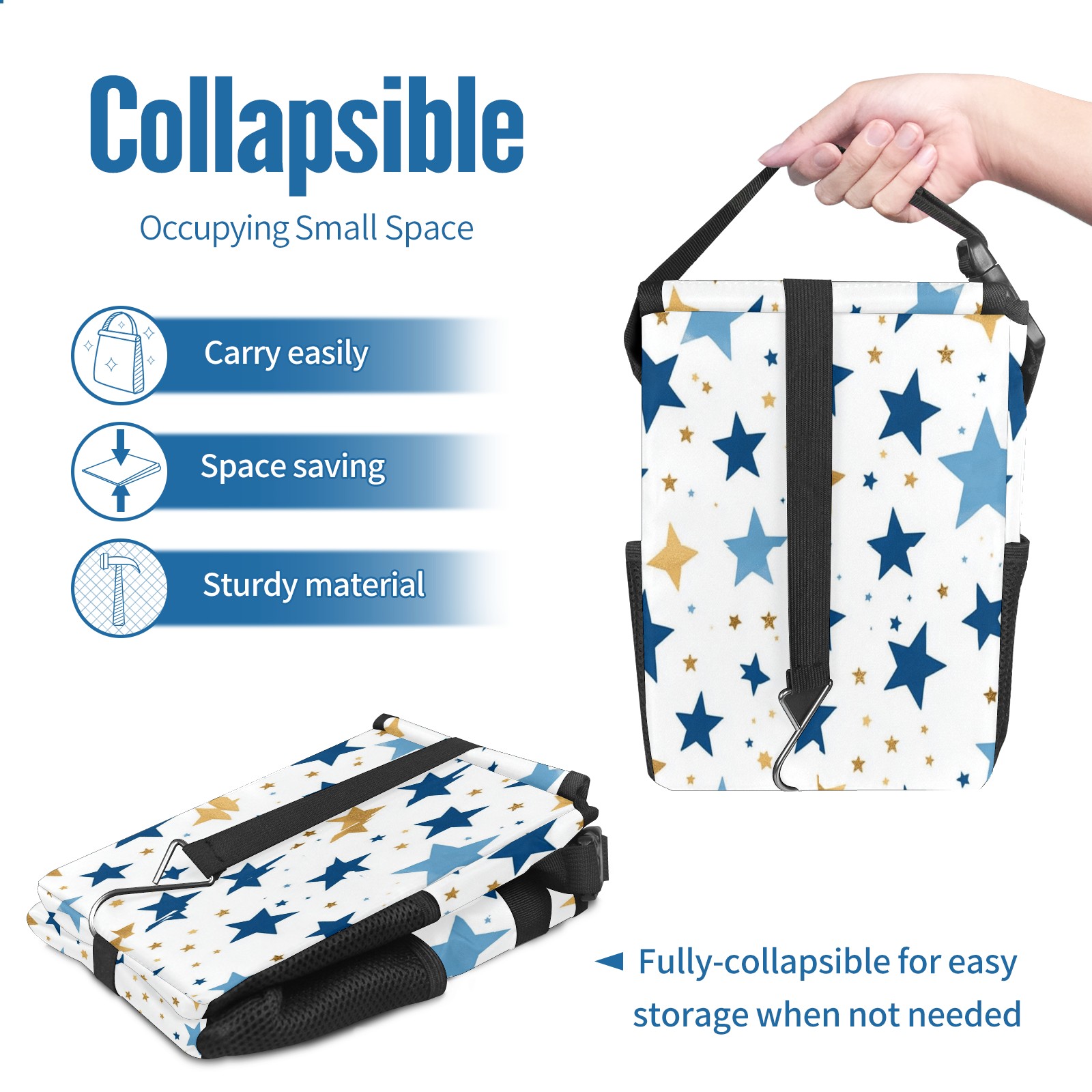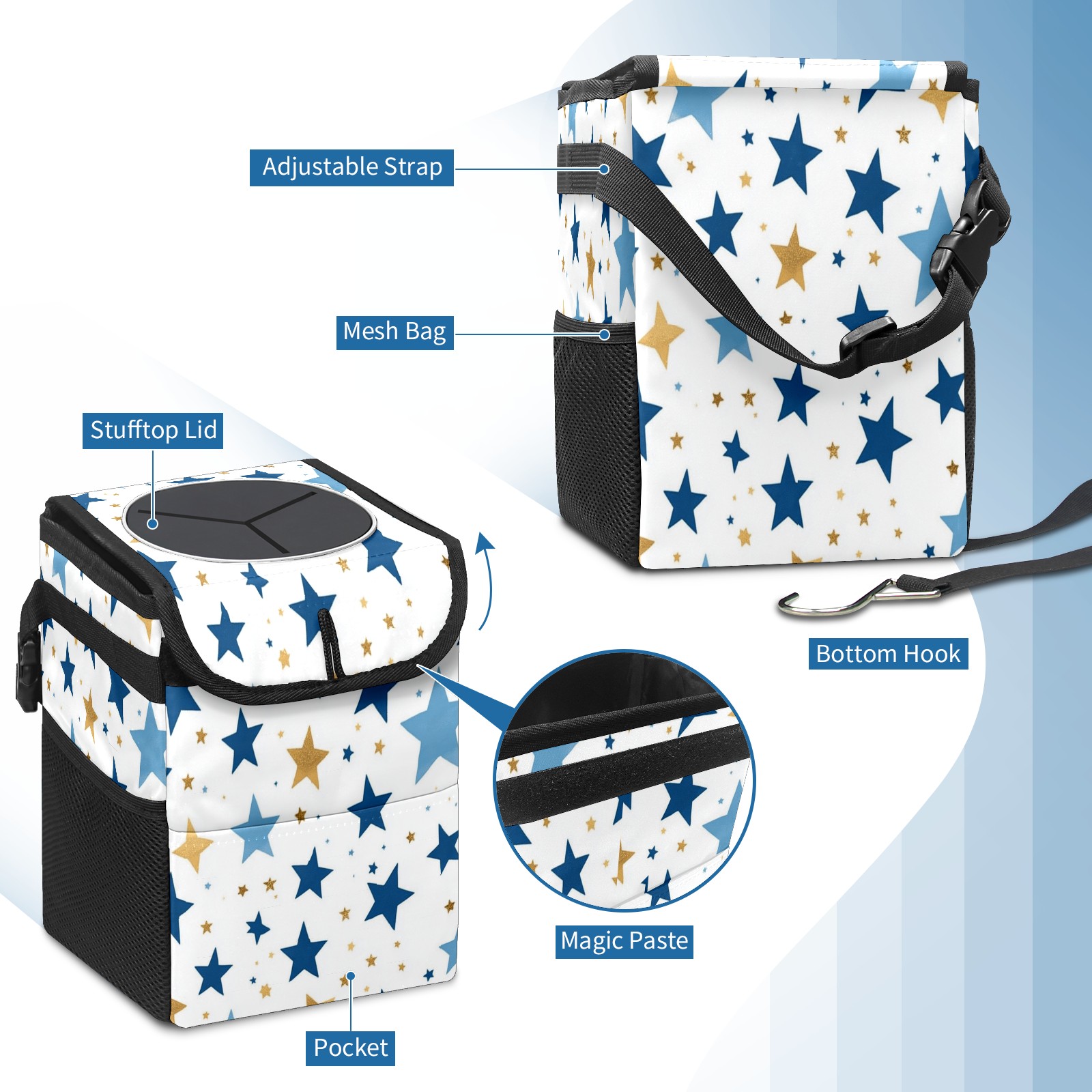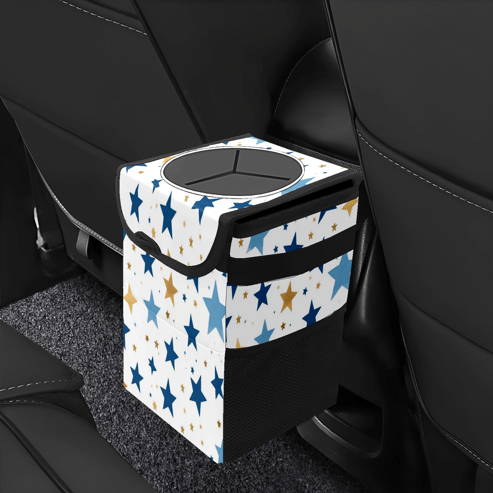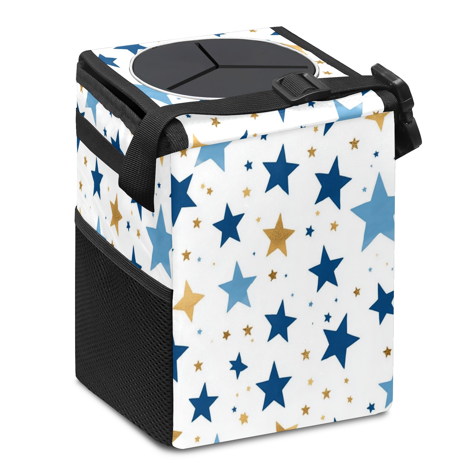 Car Trash Can with Lid, Small Portable Hanging Automotive Garbage Bin for Vehicles, Leakproof Waste Bag Container for SUV Truck Van Interior Auto Travel Road Trips(Blue And Gold Stars)