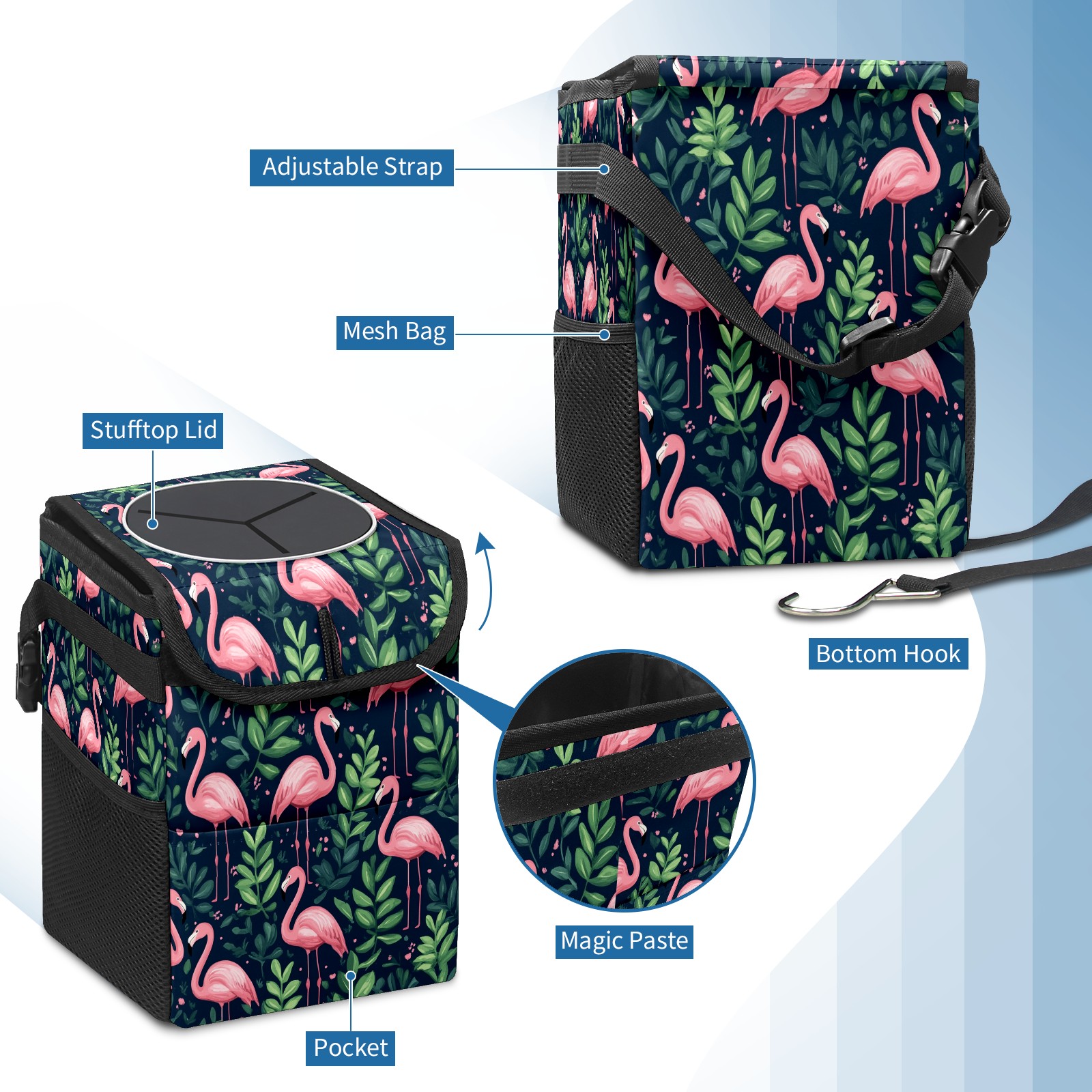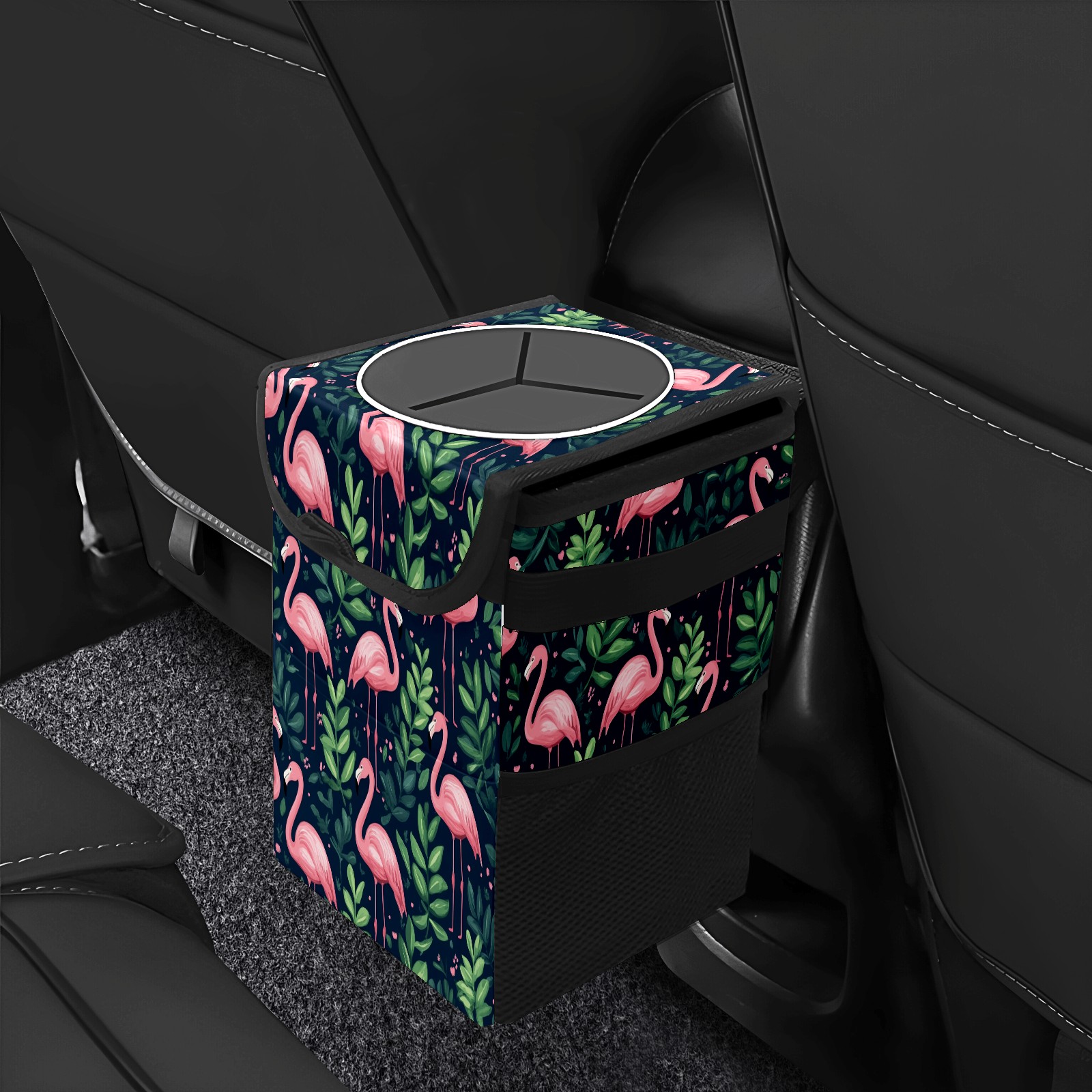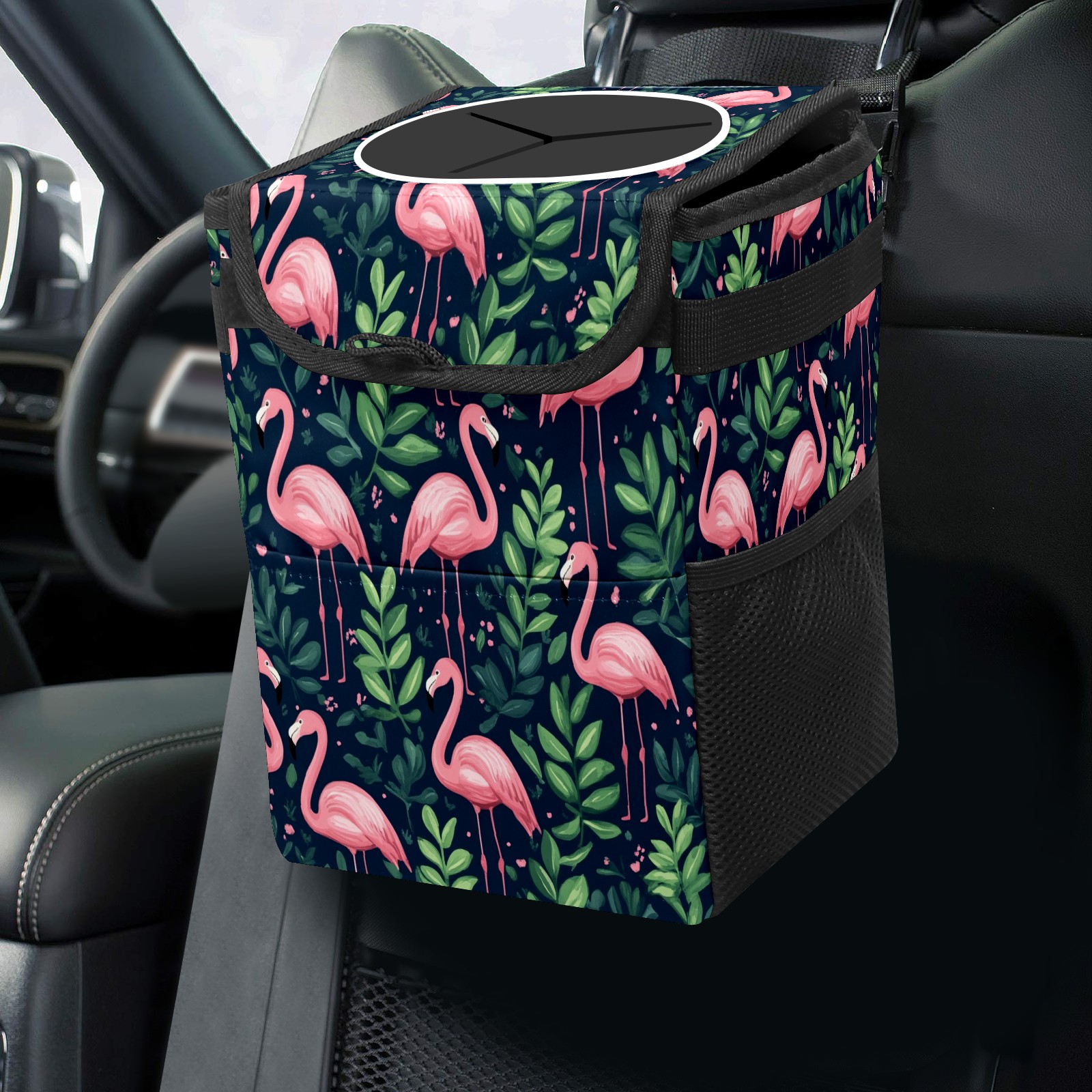 Car Trash Can with Lid, Small Portable Hanging Automotive Garbage Bin for Vehicles, Leakproof Waste Bag Container for SUV Truck Van Interior Auto Travel Road Trips(Pink Flamingos And Green Leaves)