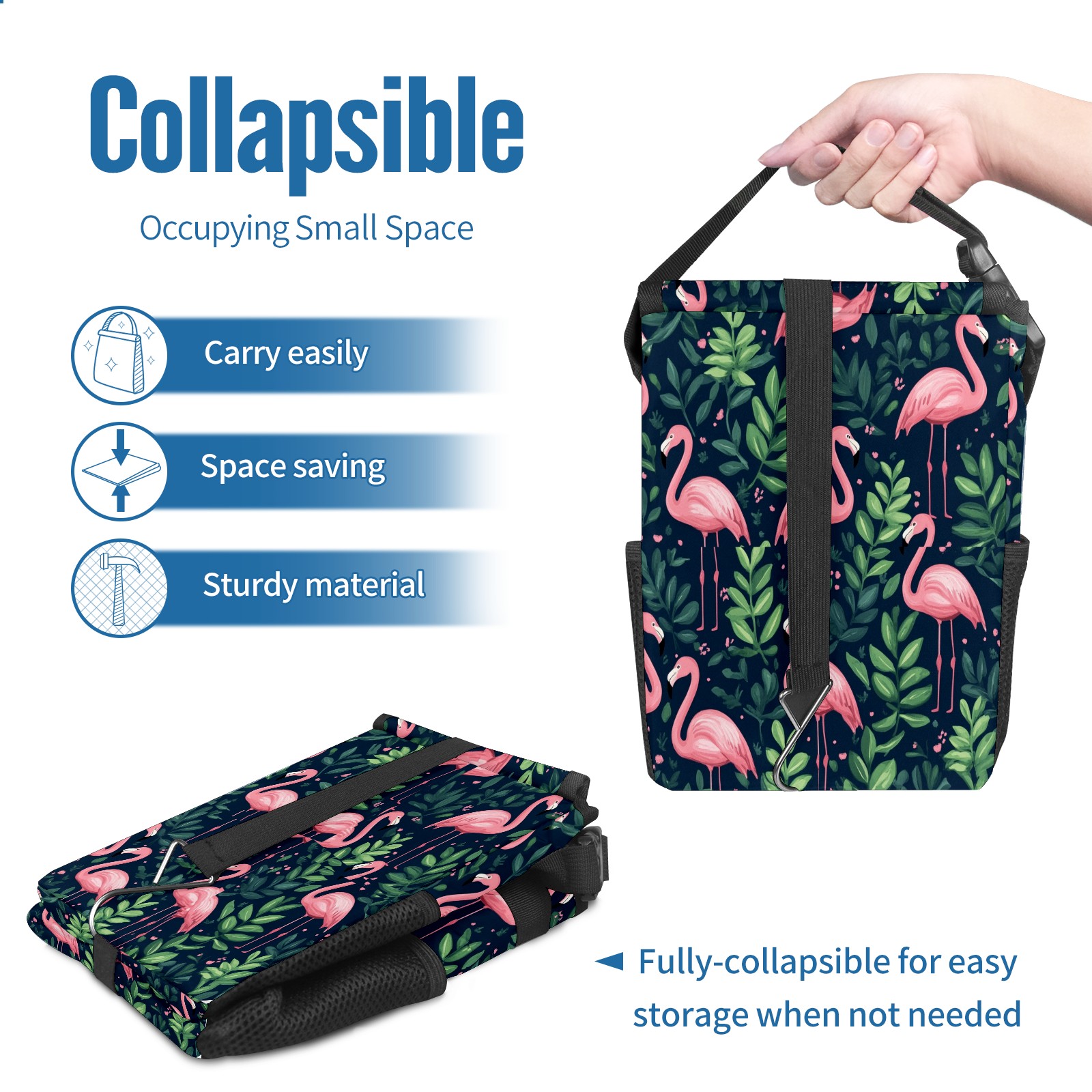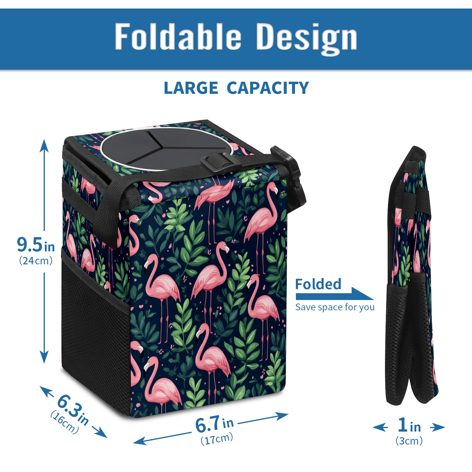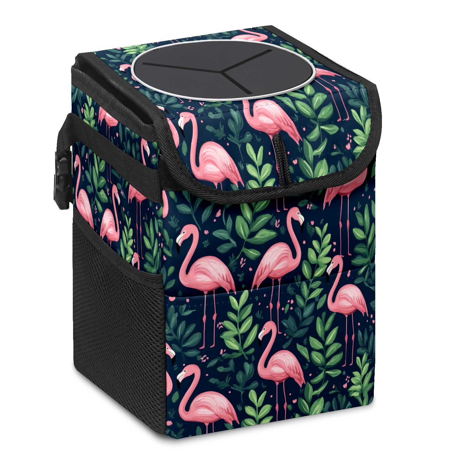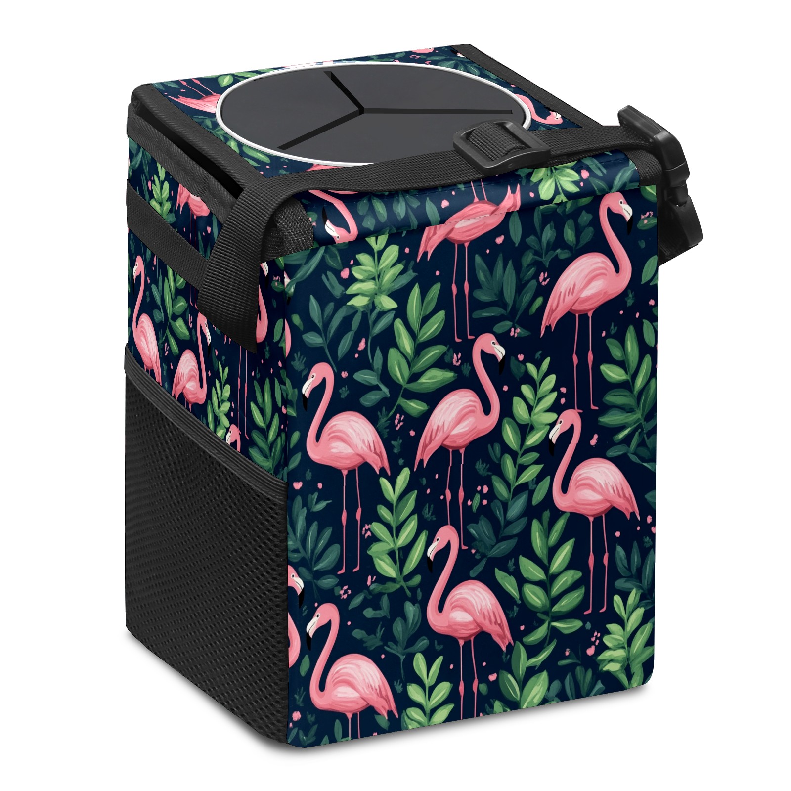 Car Trash Can with Lid, Small Portable Hanging Automotive Garbage Bin for Vehicles, Leakproof Waste Bag Container for SUV Truck Van Interior Auto Travel Road Trips(Pink Flamingos And Green Leaves)