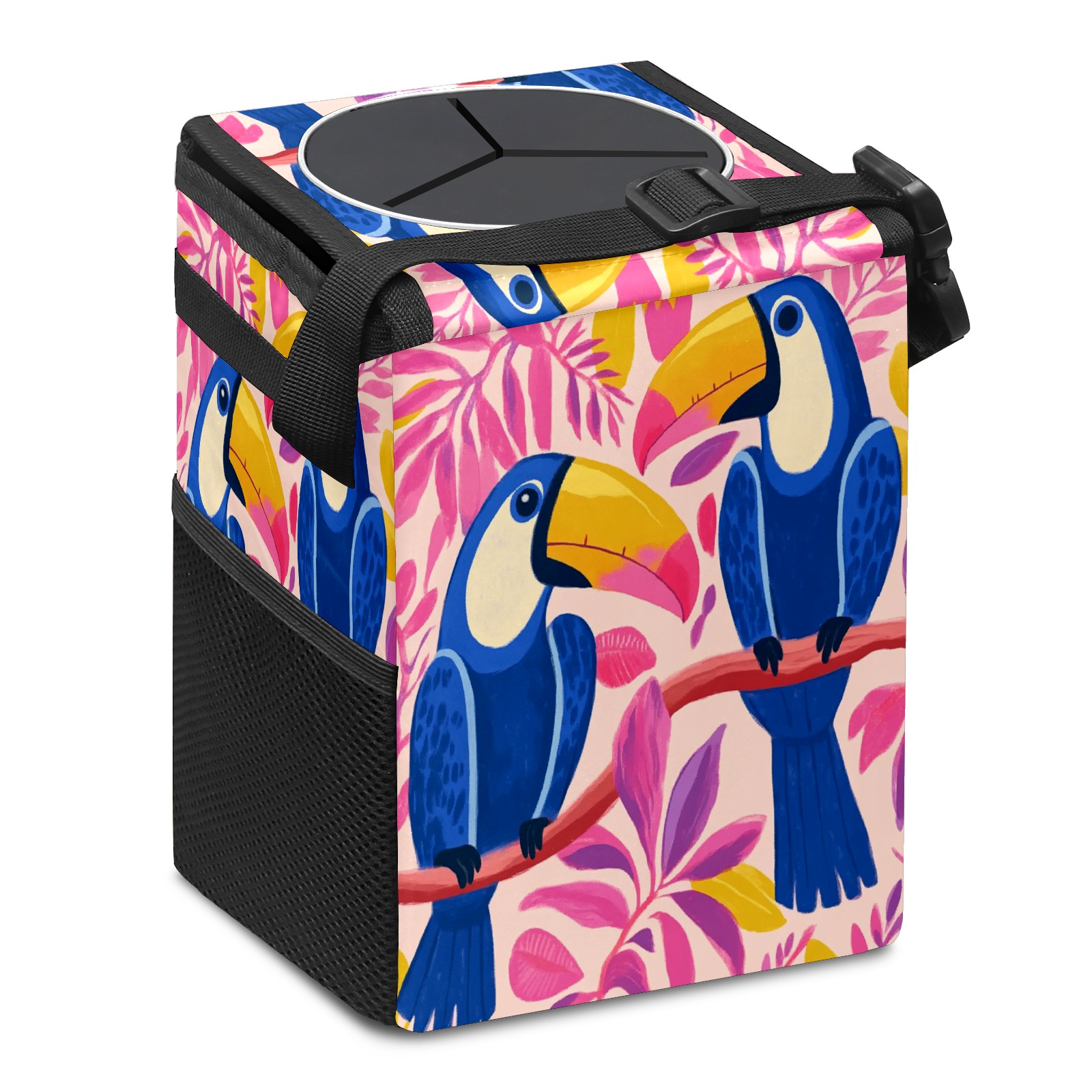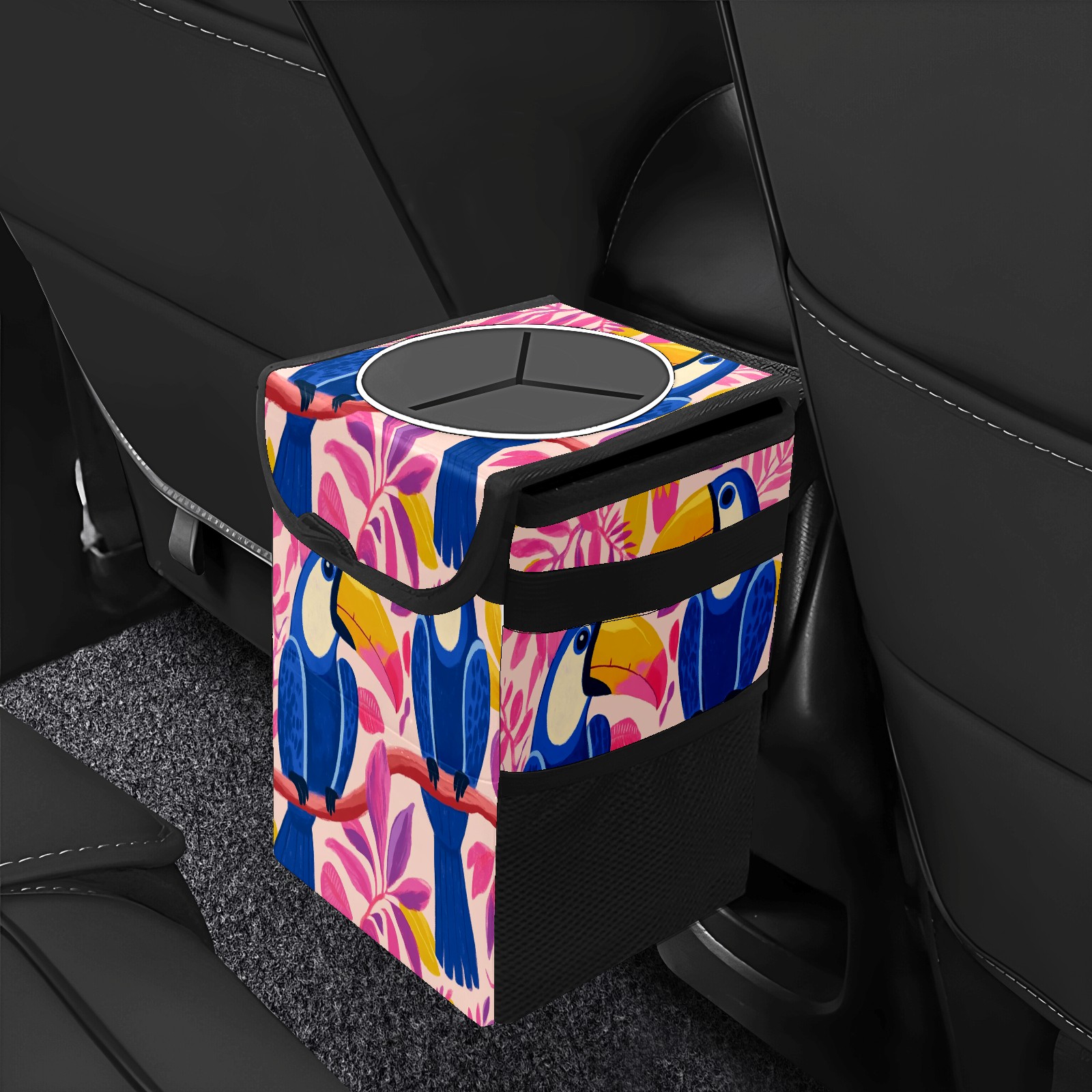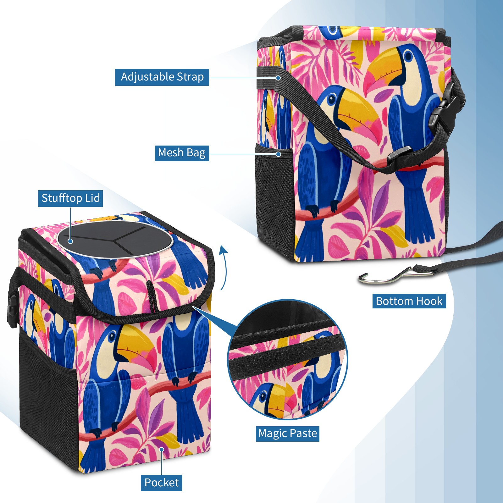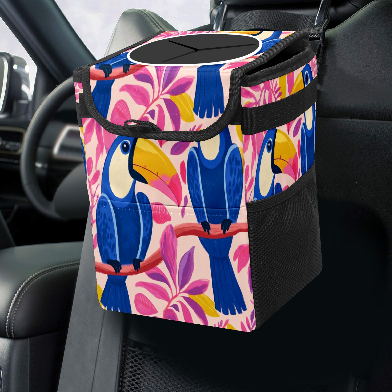 Car Trash Can with Lid, Small Portable Hanging Automotive Garbage Bin for Vehicles, Leakproof Waste Bag Container for SUV Truck Van Interior Auto Travel Road Trips(Blue And Pink Toucans)