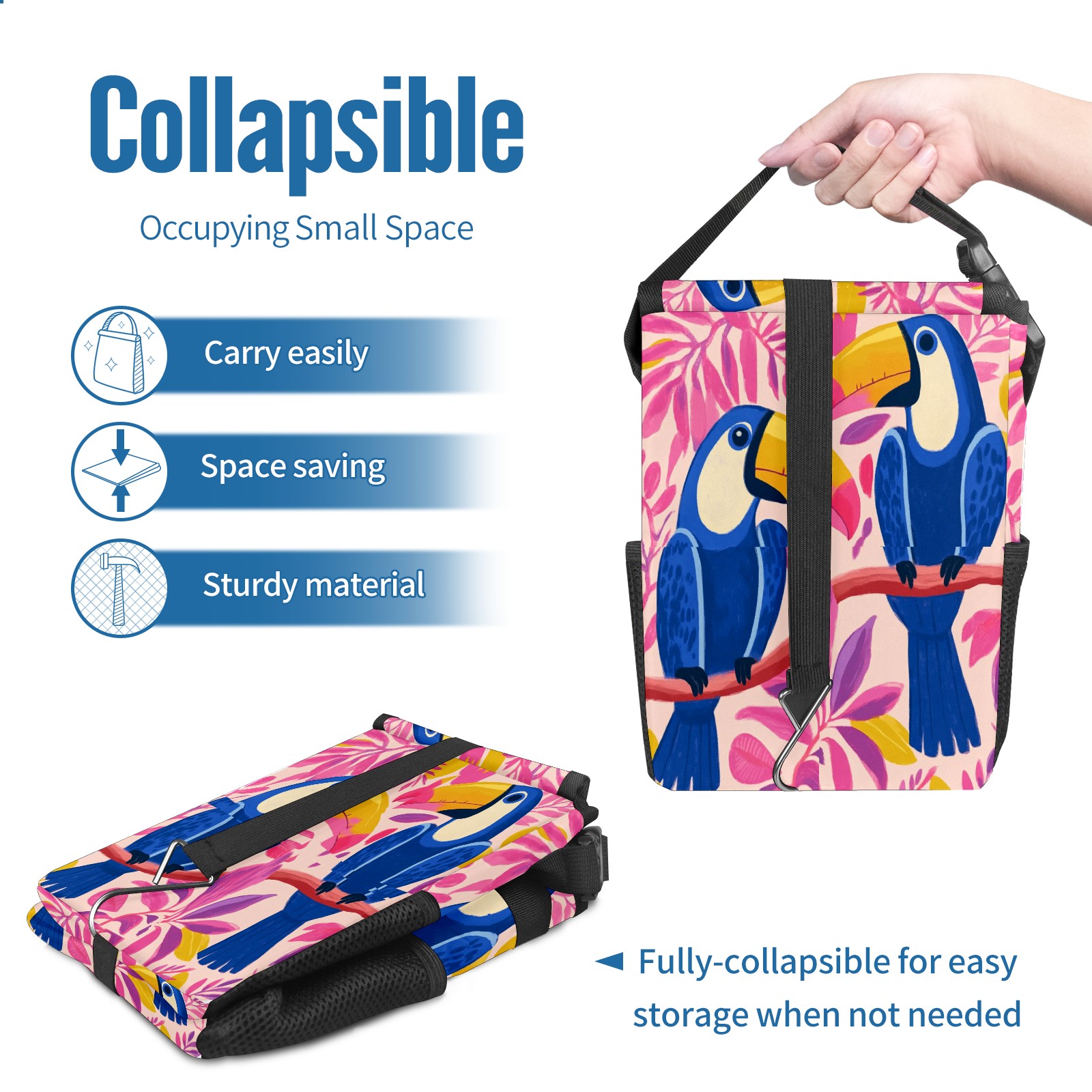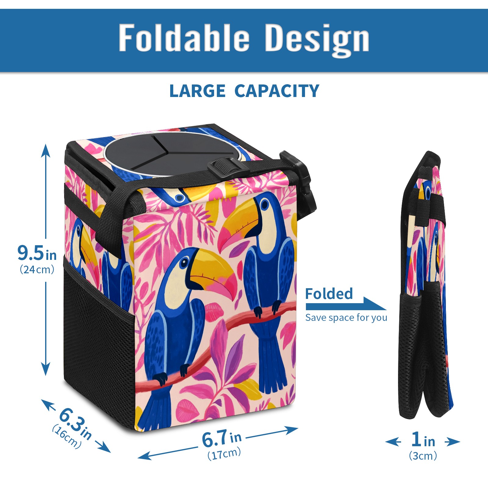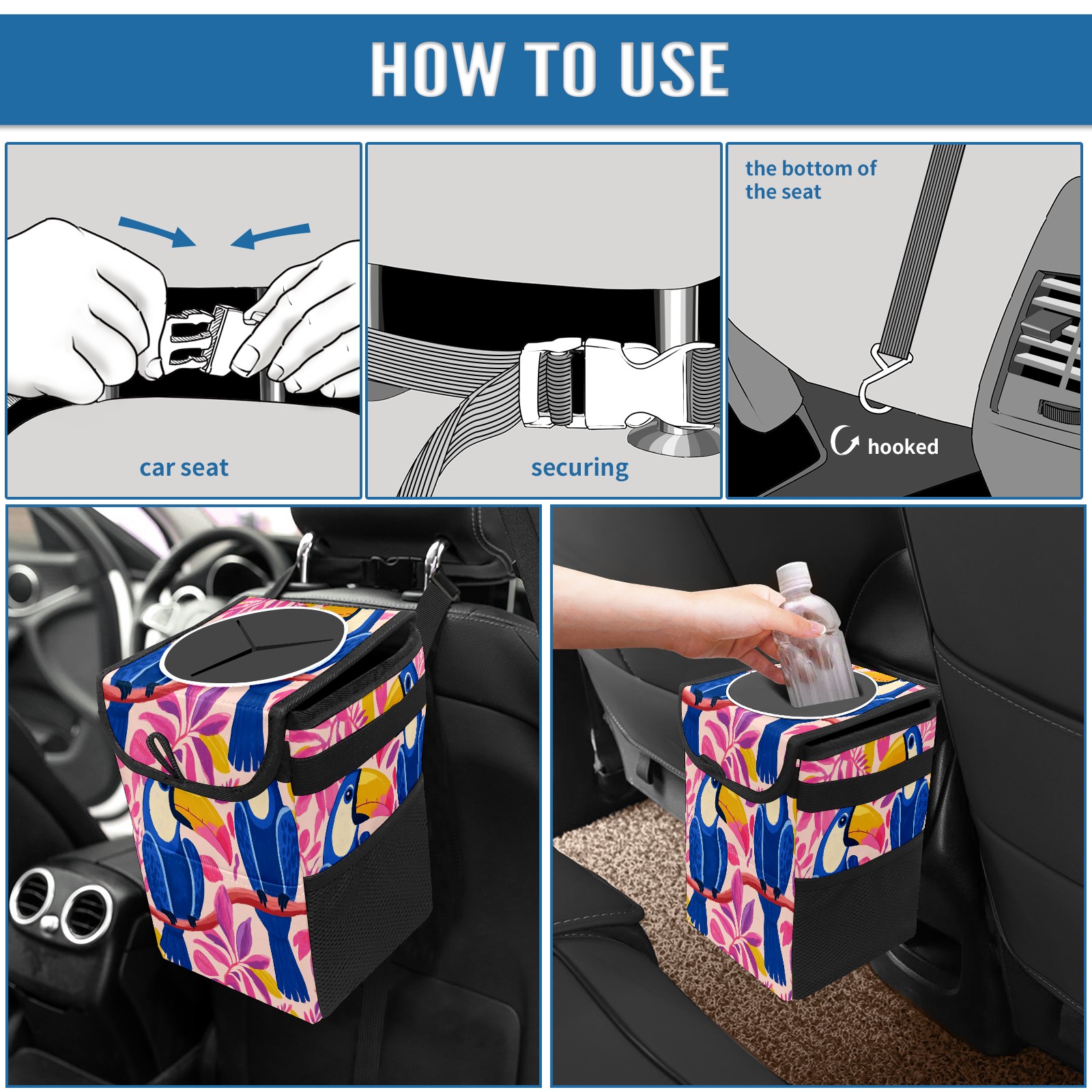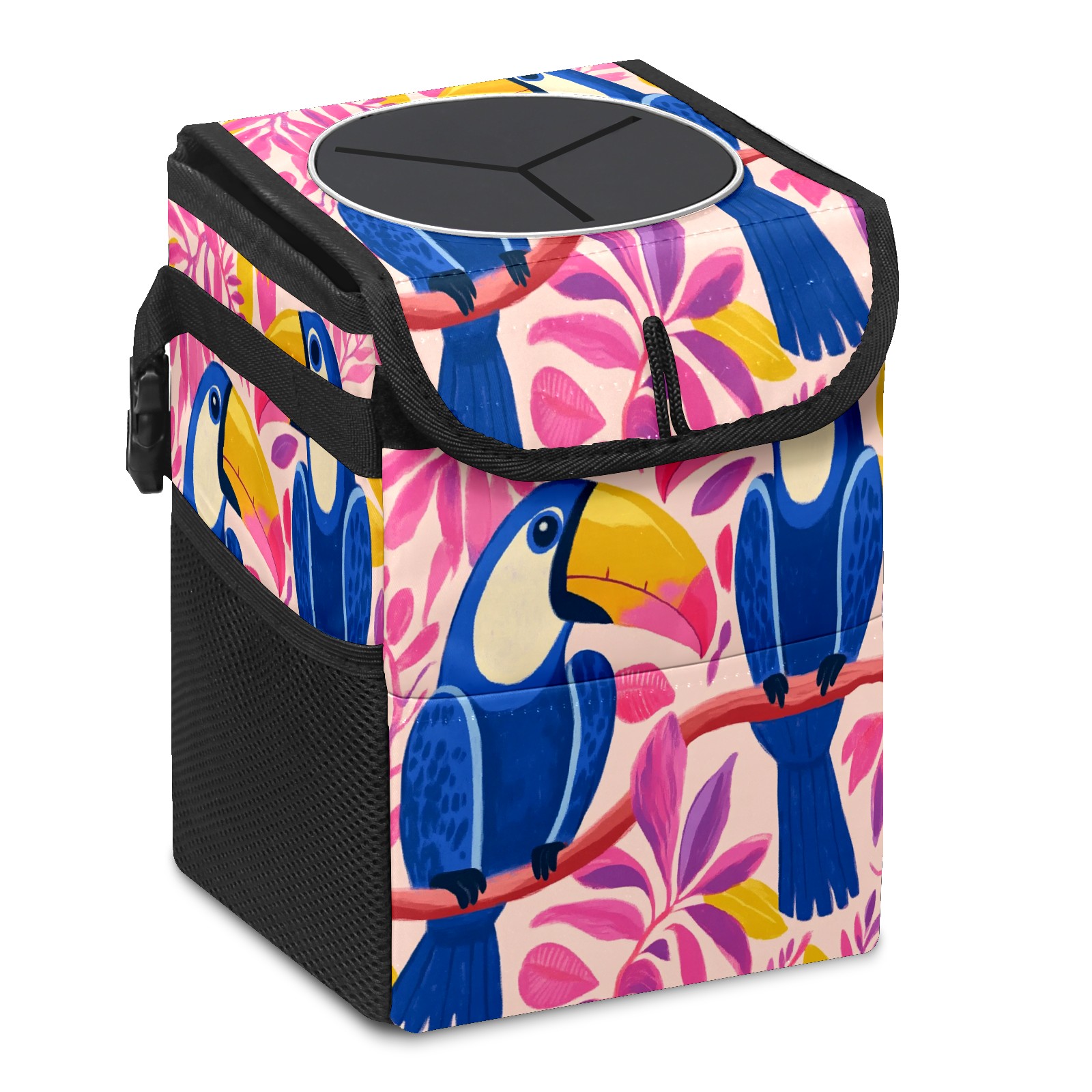 Car Trash Can with Lid, Small Portable Hanging Automotive Garbage Bin for Vehicles, Leakproof Waste Bag Container for SUV Truck Van Interior Auto Travel Road Trips(Blue And Pink Toucans)