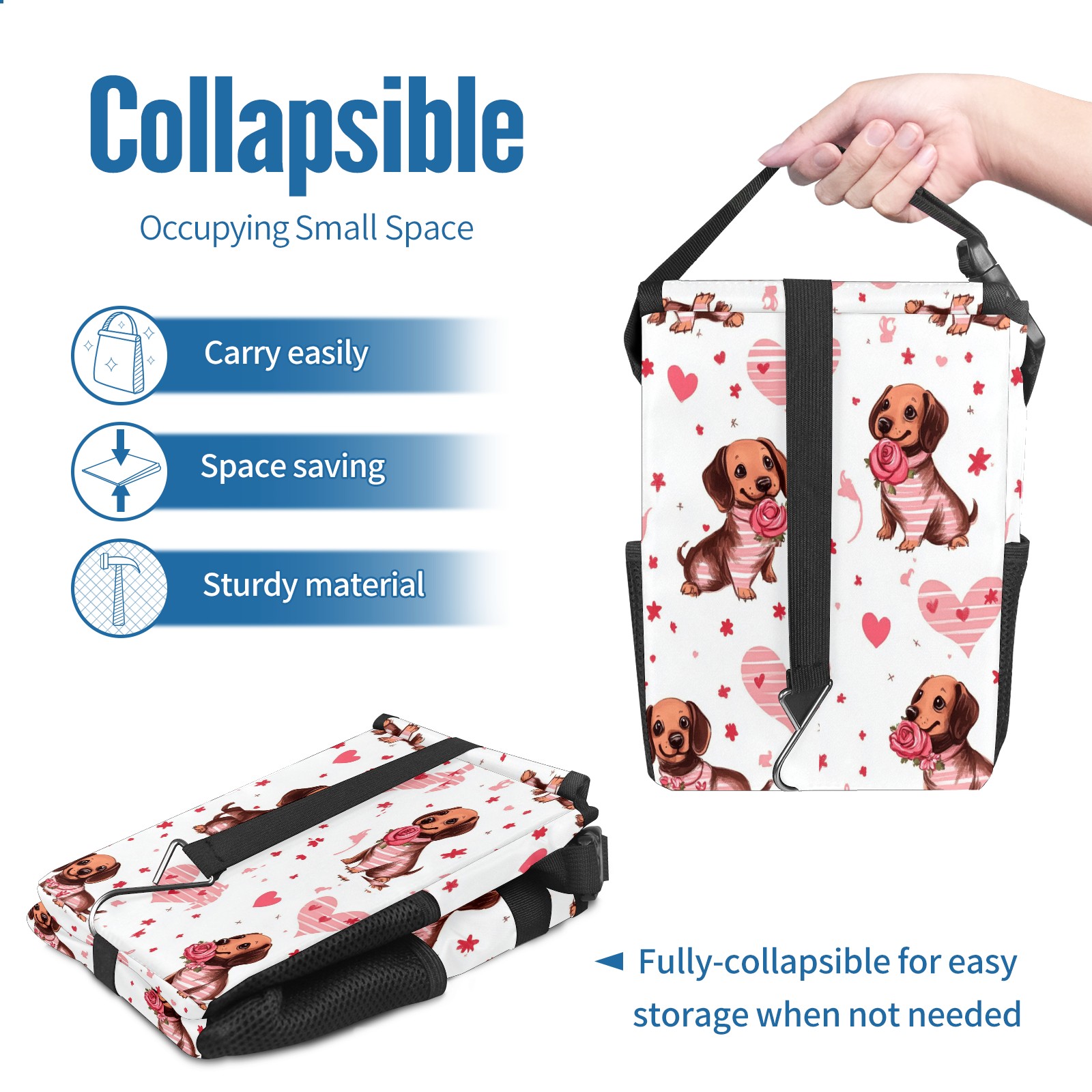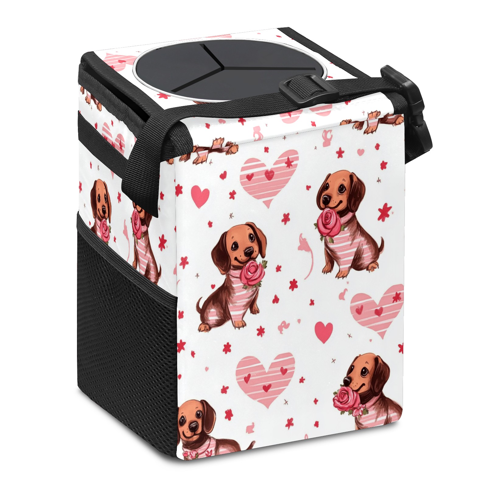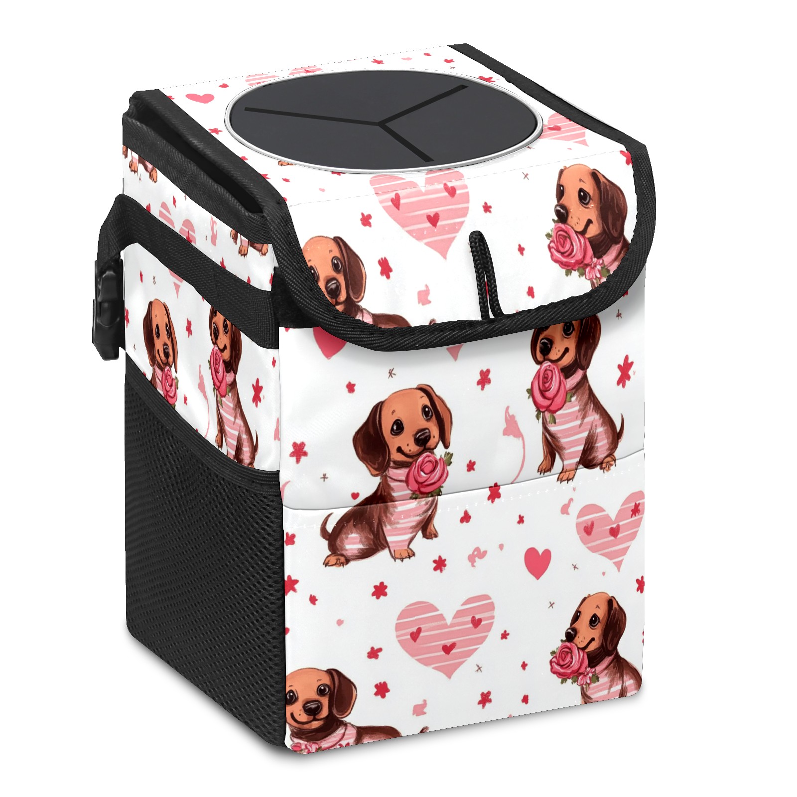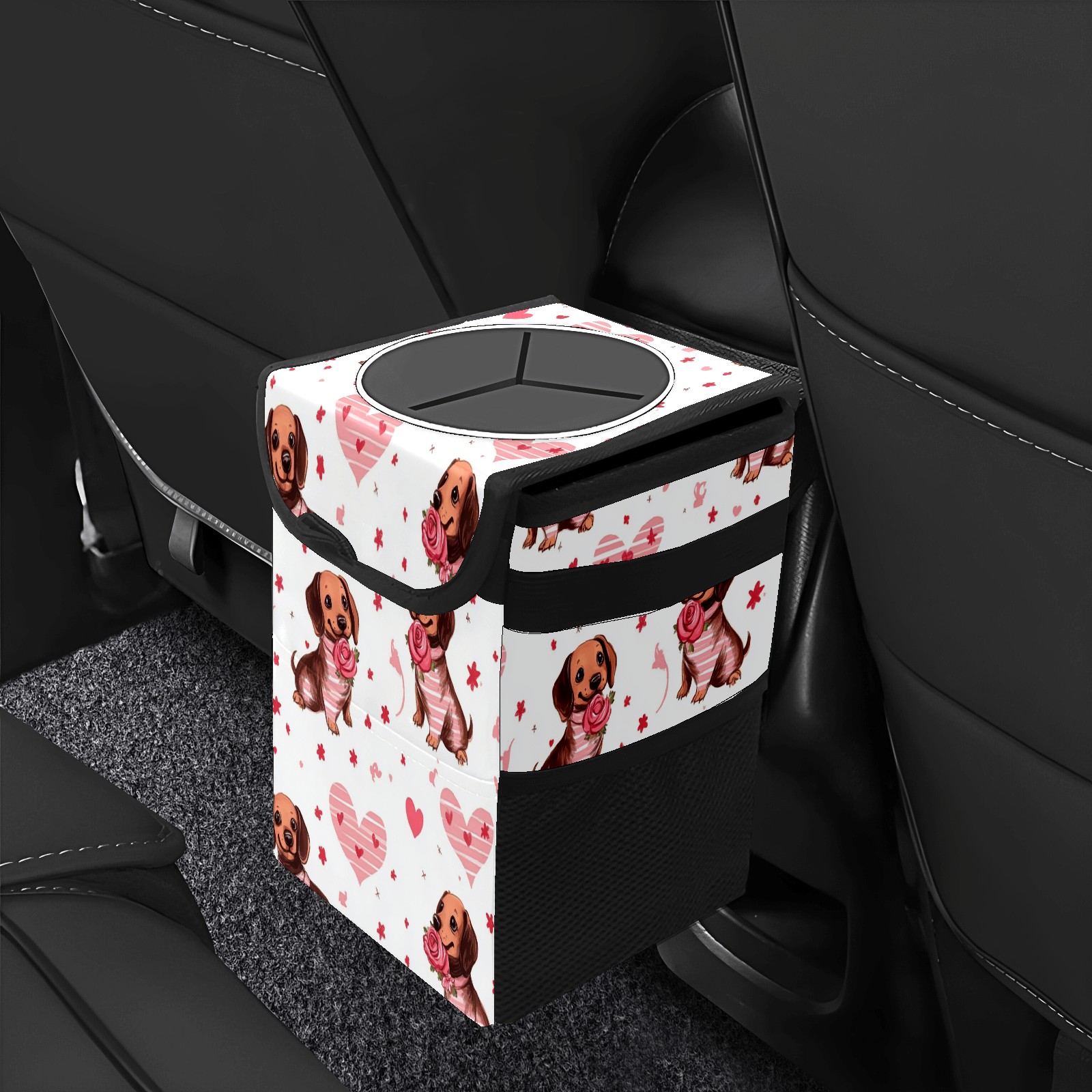 Car Trash Can with Lid, Small Portable Hanging Automotive Garbage Bin for Vehicles, Leakproof Waste Bag Container for SUV Truck Van Interior Auto Travel Road Trips(Brown Dachshund Puppies)