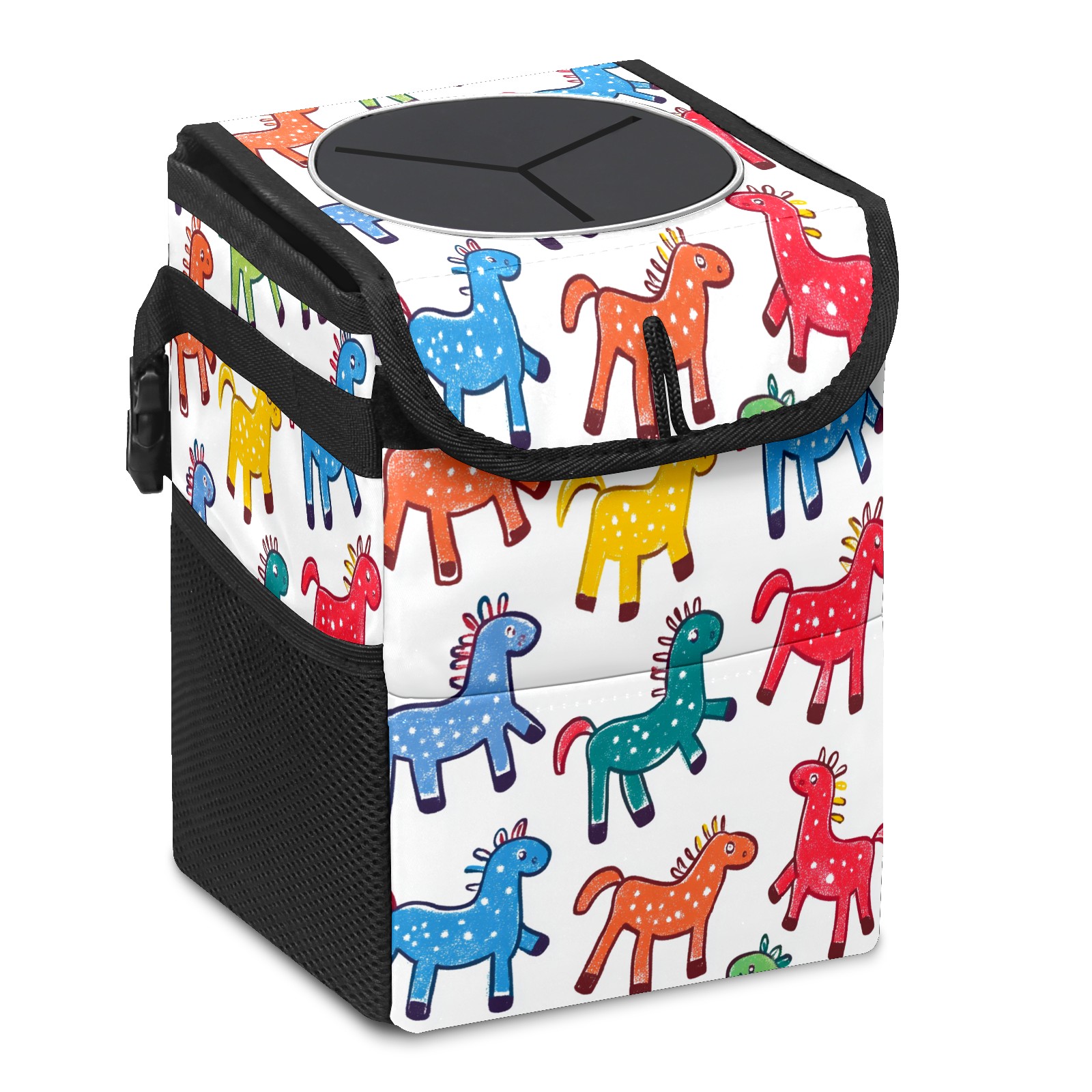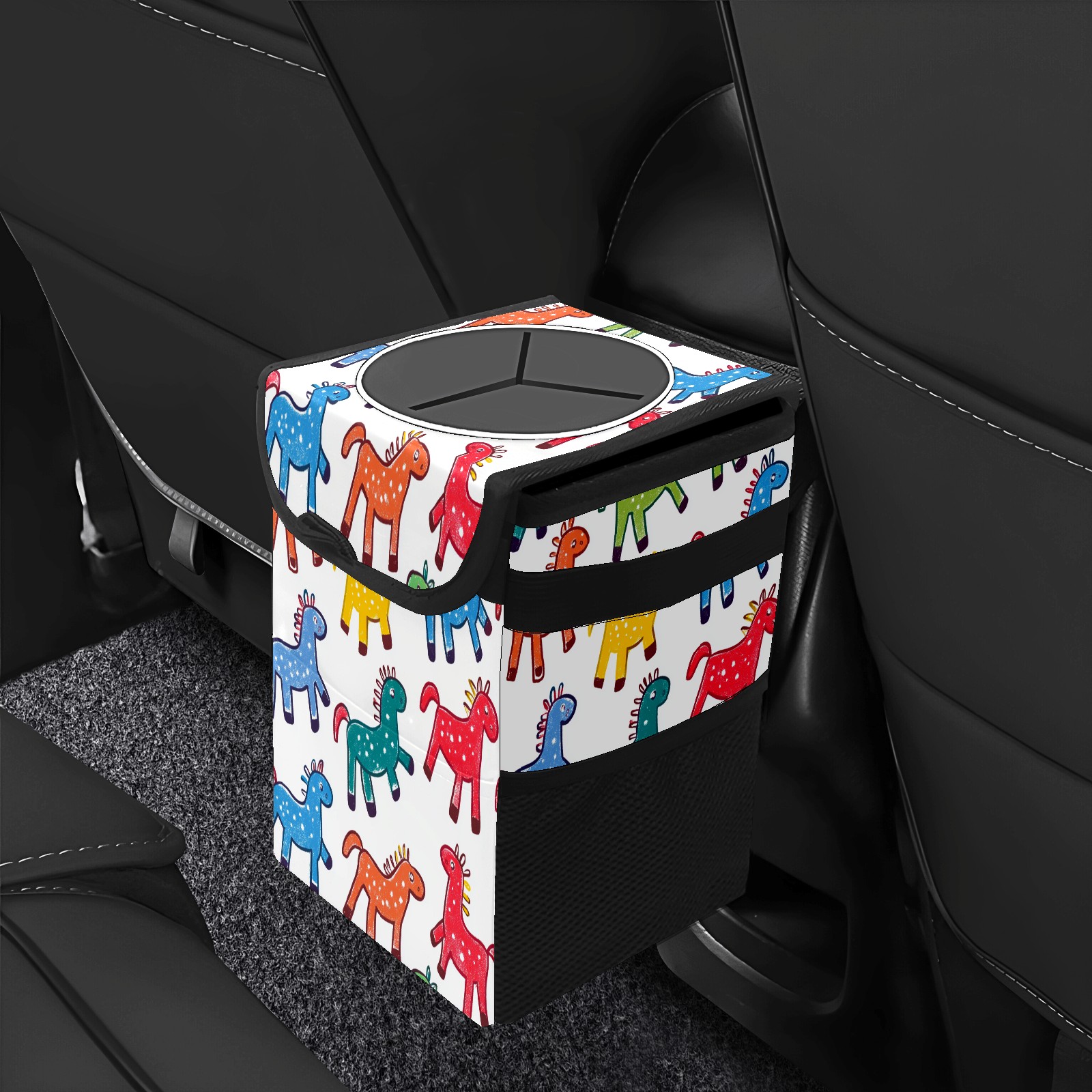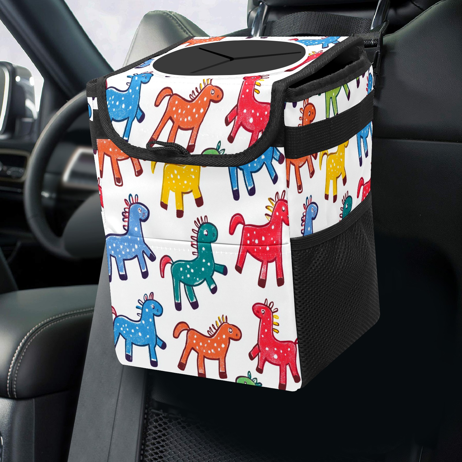 Car Trash Can with Lid, Small Portable Hanging Automotive Garbage Bin for Vehicles, Leakproof Waste Bag Container for SUV Truck Van Interior Auto Travel Road Trips(Colorful Stick Horses)