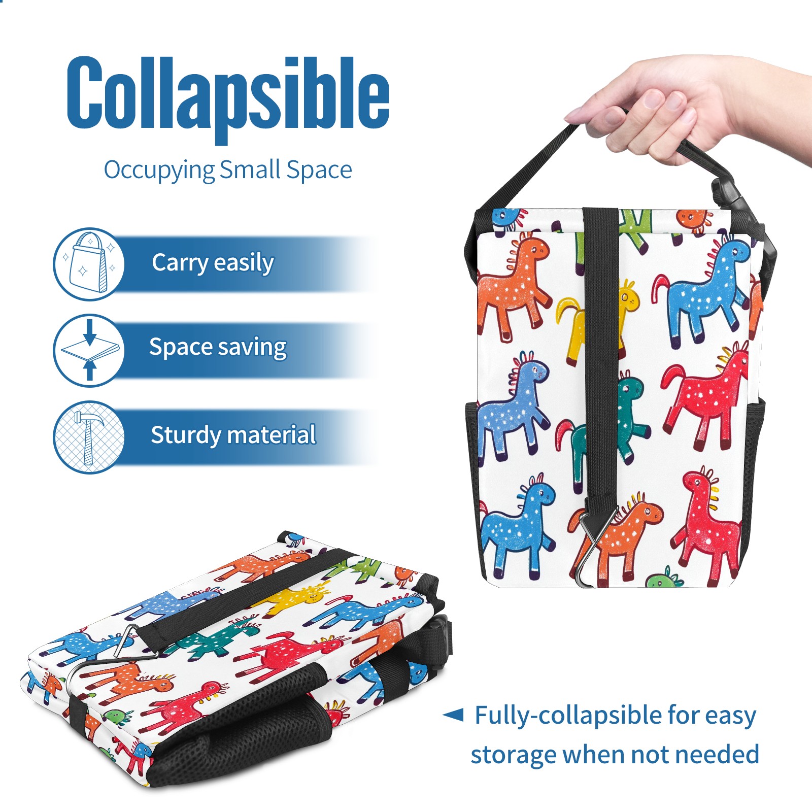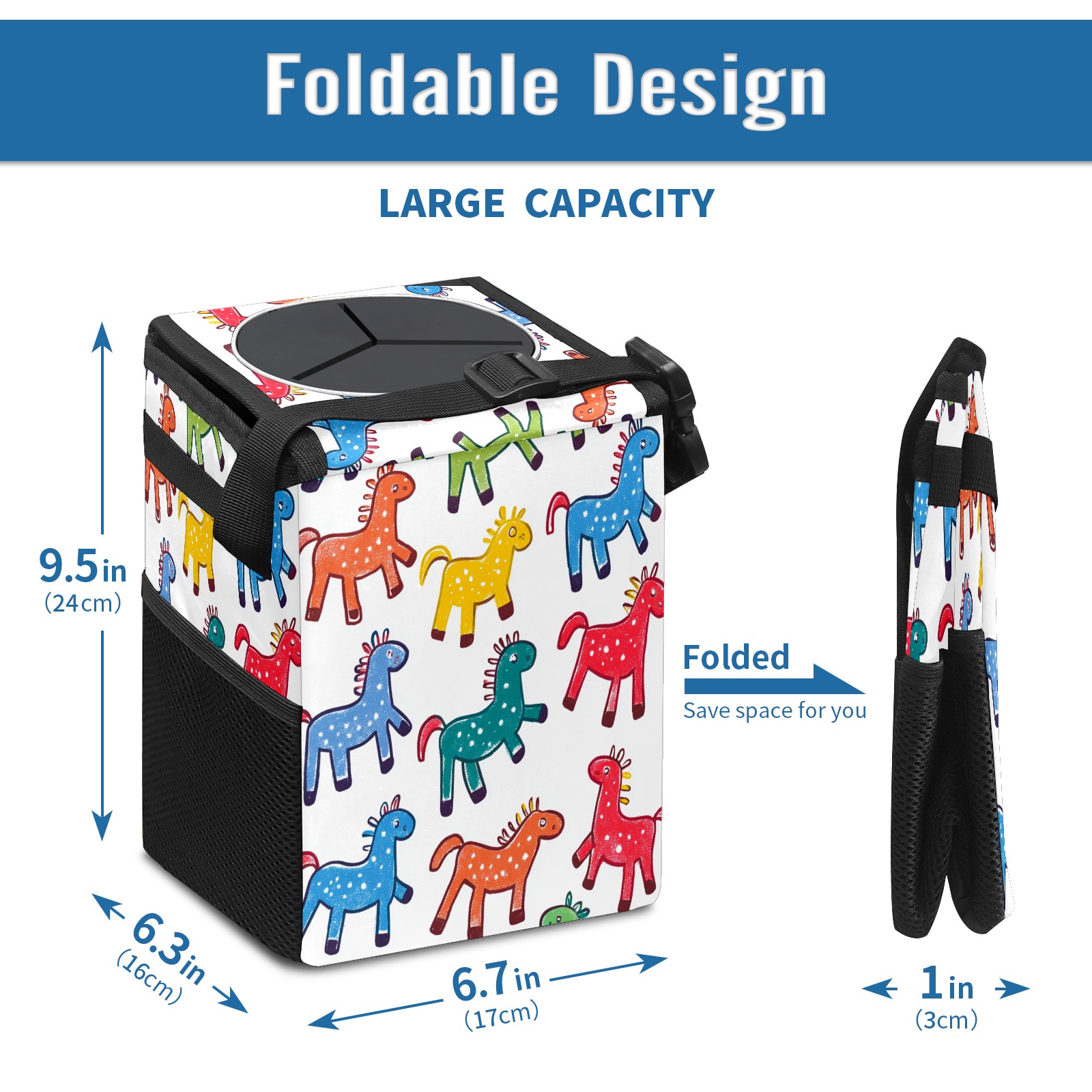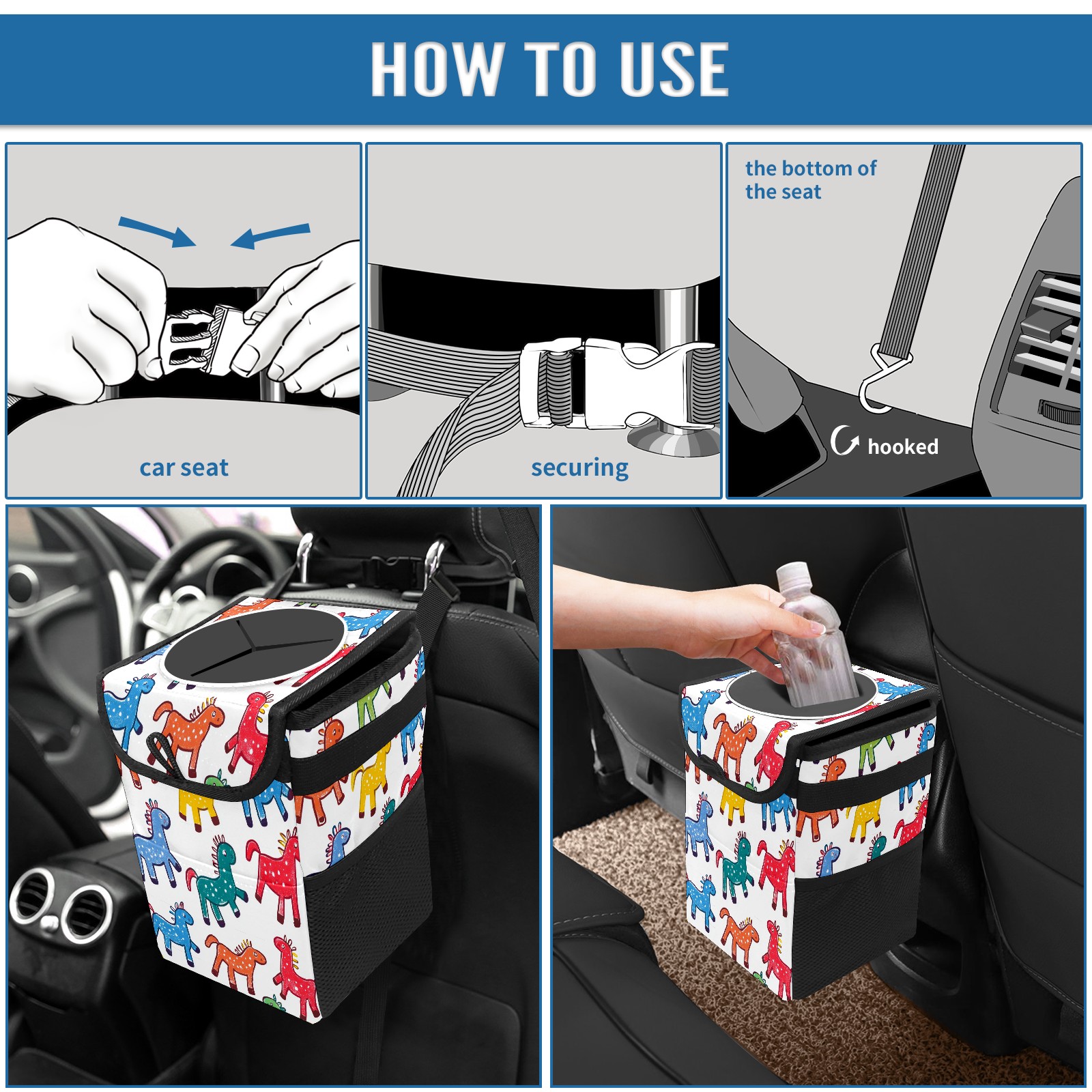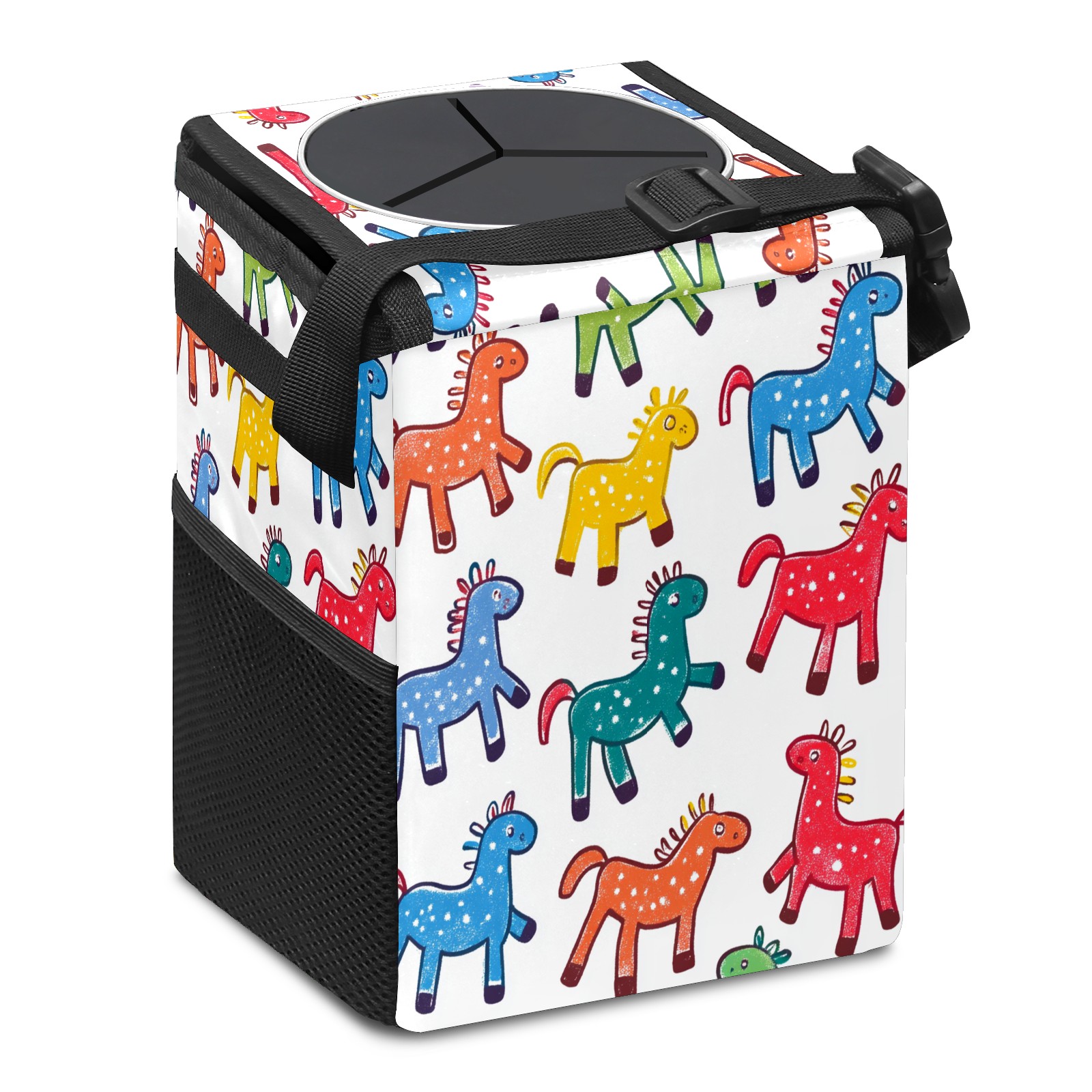 Car Trash Can with Lid, Small Portable Hanging Automotive Garbage Bin for Vehicles, Leakproof Waste Bag Container for SUV Truck Van Interior Auto Travel Road Trips(Colorful Stick Horses)