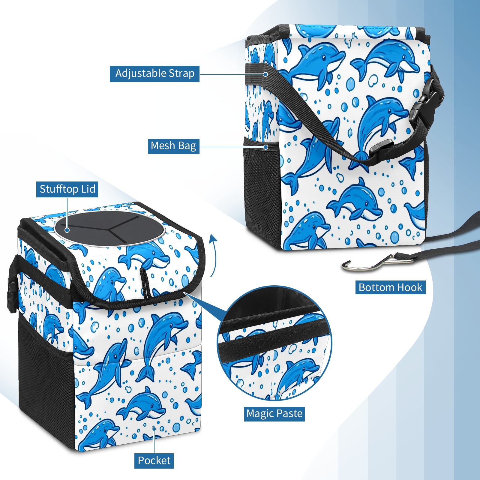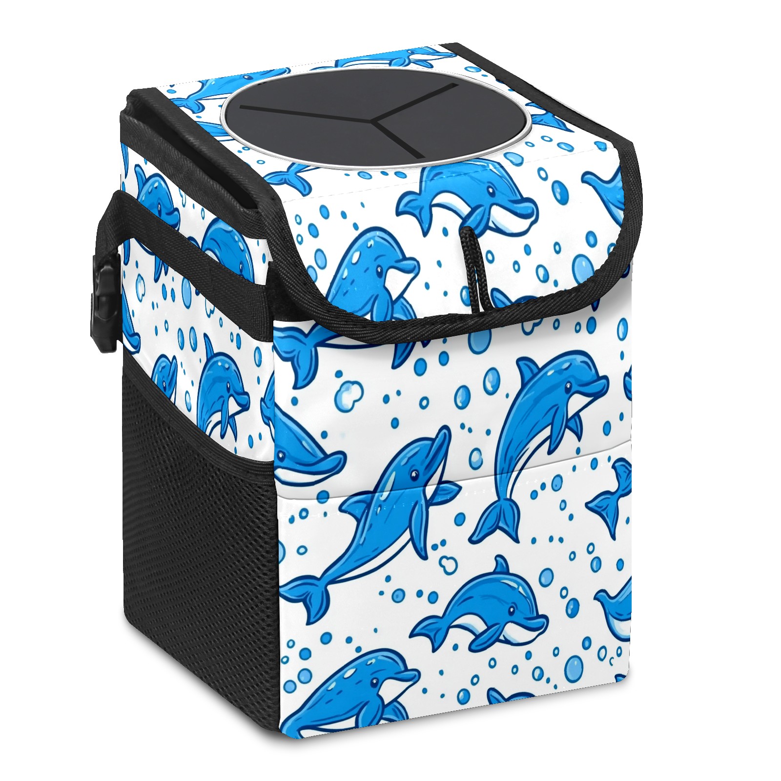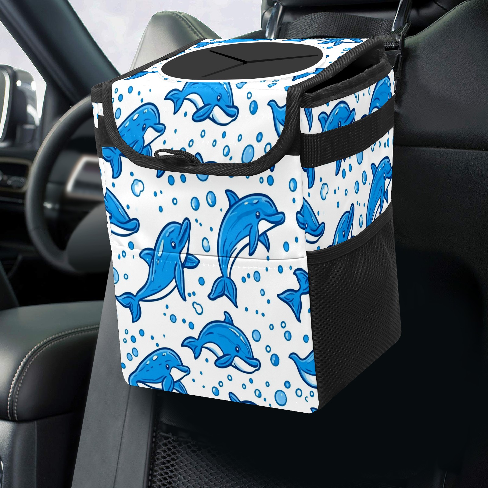 Car Trash Can with Lid, Small Portable Hanging Automotive Garbage Bin for Vehicles, Leakproof Waste Bag Container for SUV Truck Van Interior Auto Travel Road Trips(Blue Dolphins)