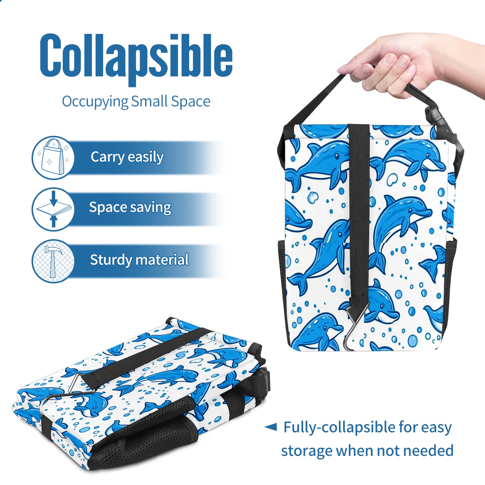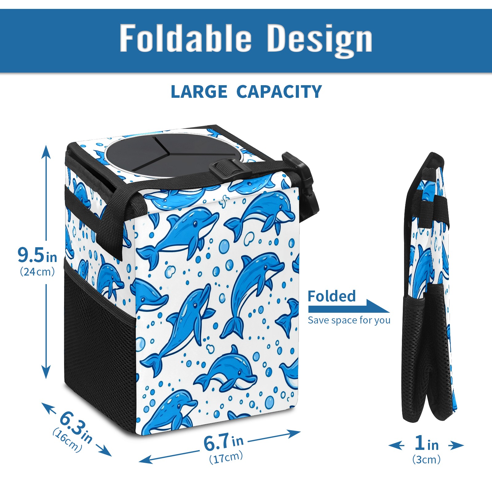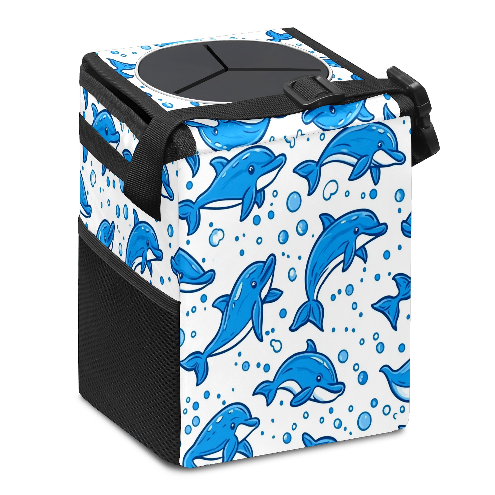Car Trash Can with Lid, Small Portable Hanging Automotive Garbage Bin for Vehicles, Leakproof Waste Bag Container for SUV Truck Van Interior Auto Travel Road Trips(Blue Dolphins)
