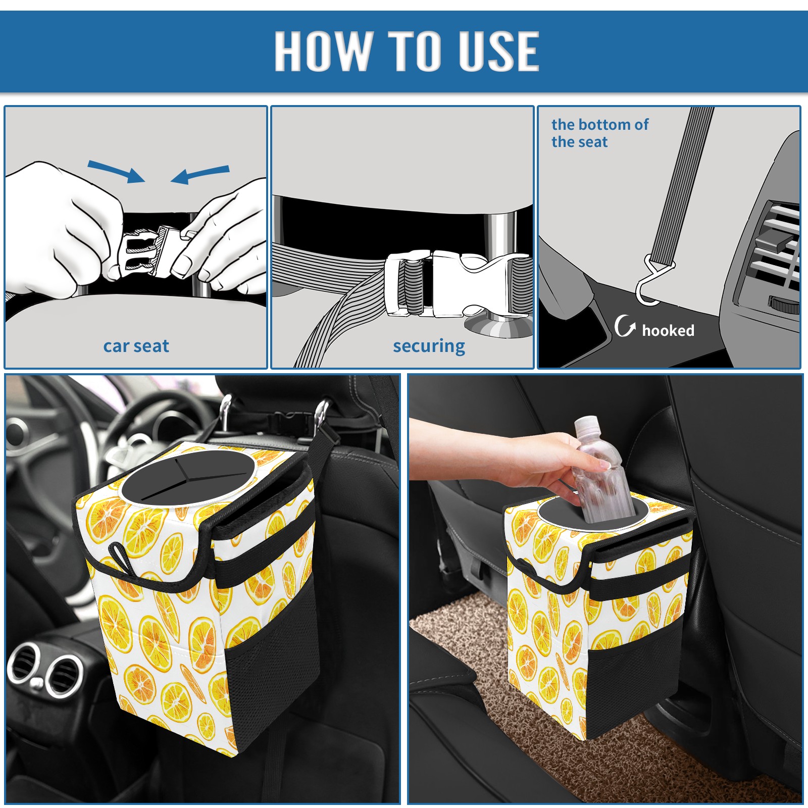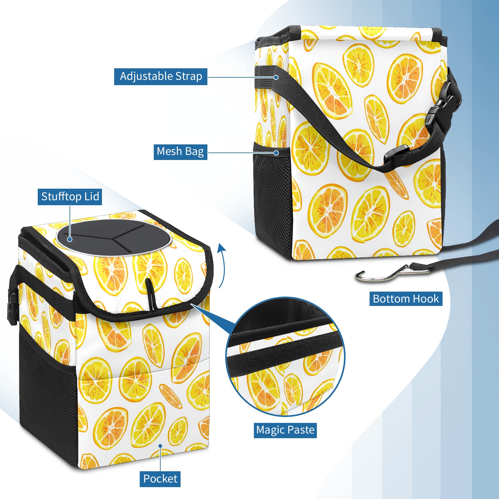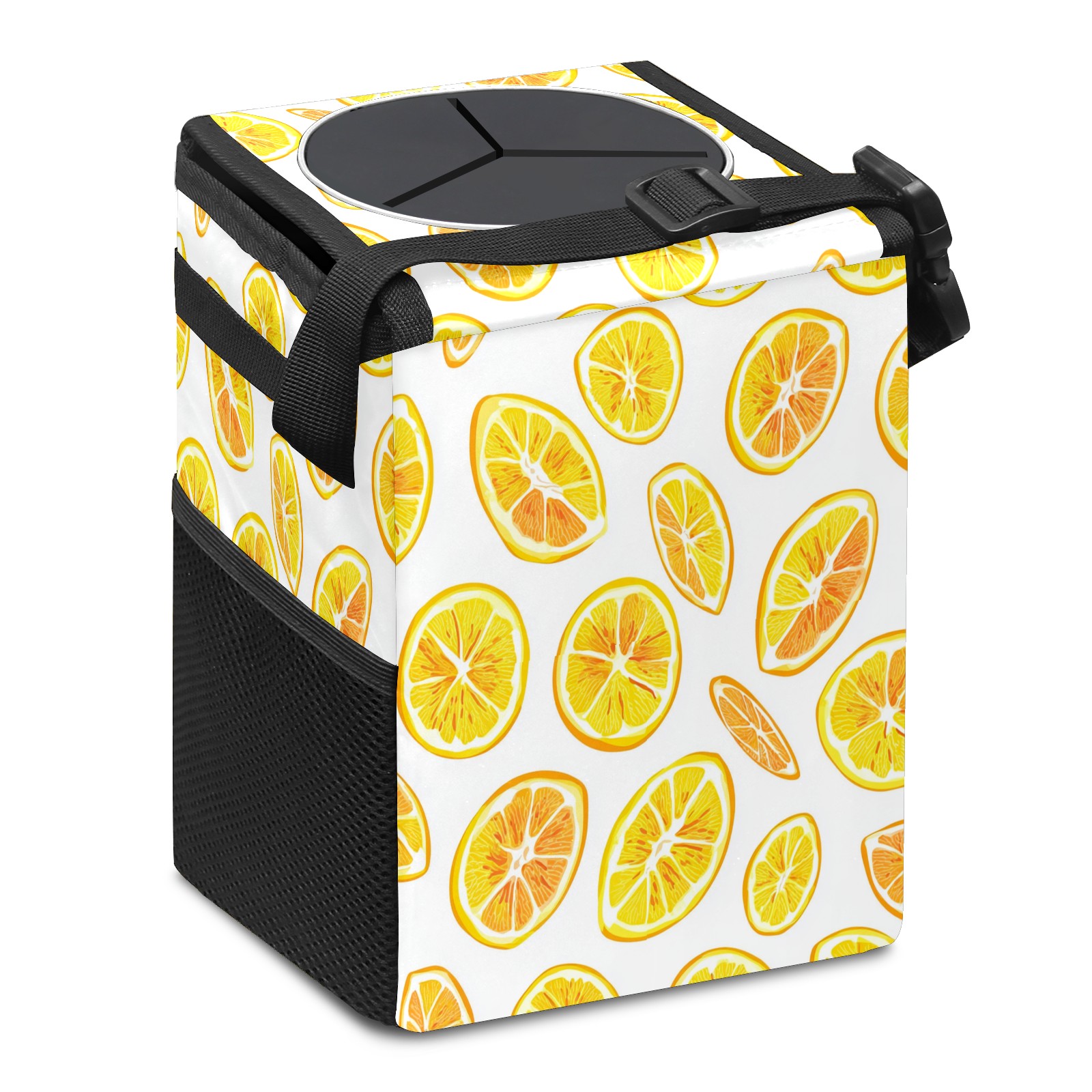 Car Trash Can with Lid, Small Portable Hanging Automotive Garbage Bin for Vehicles, Leakproof Waste Bag Container for SUV Truck Van Interior Auto Travel Road Trips(Lemon Slices)